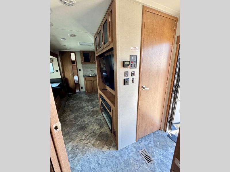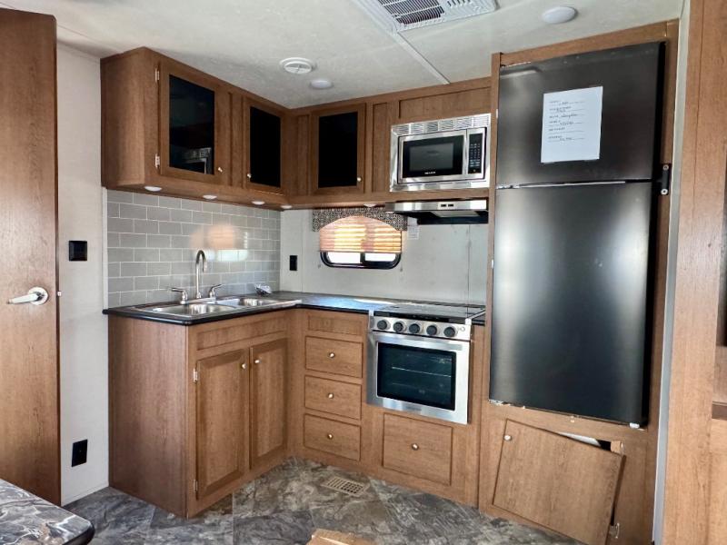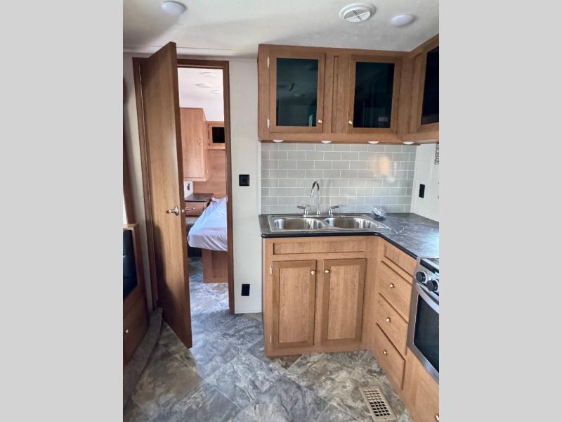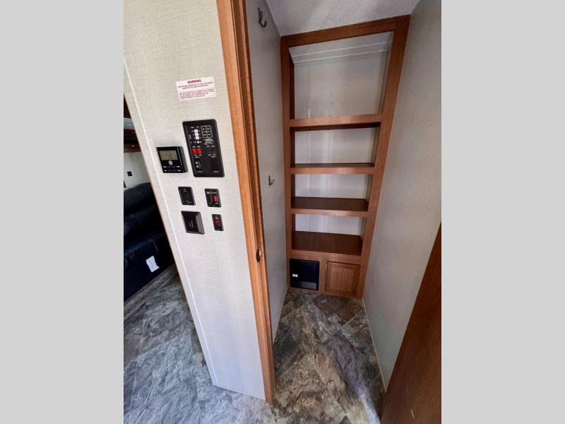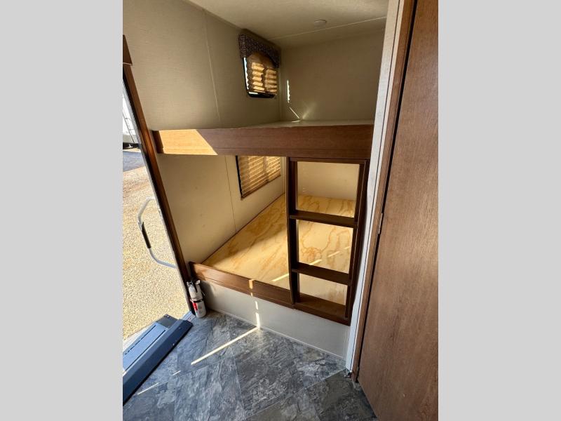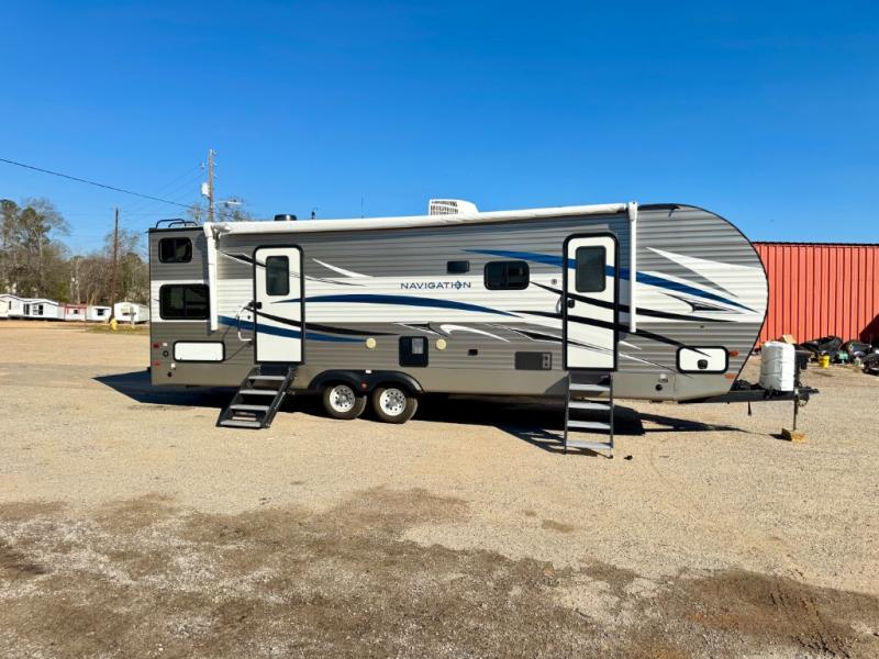 Make your vacations complete with this Navigation travel trailer! The dual entry doors are a huge convenience since mom and dad will have their own entrance into the front private bedroom, and the kids can easily access the bunk beds and full bath with ease. There is a large walk-in pantry and a two-door 12V refrigerator that will come in handy when packing food for the week, plus you'll find overhead cabinets for all your necessities. There is also a pass-through storage and convenient trunk storage outside below the bunks for the kids' scooters or extra coolers. This model also includes a walk-around king bed in the front private bedroom, along with dual night stands and spaced prepped to add an optional TV if you choose!