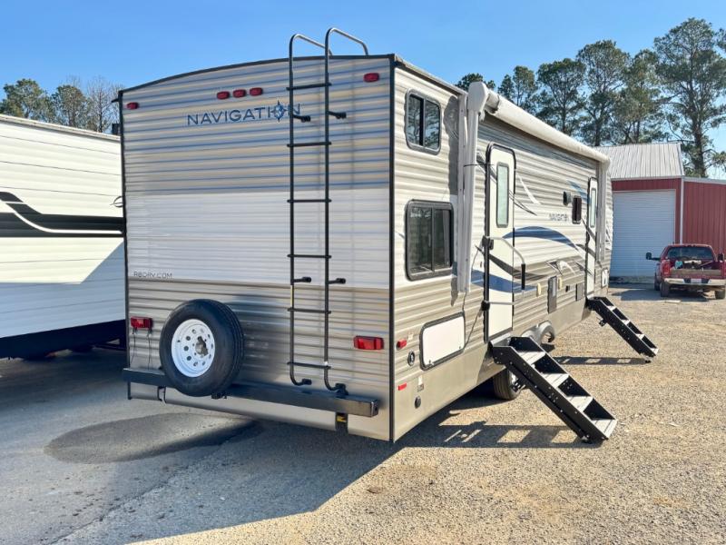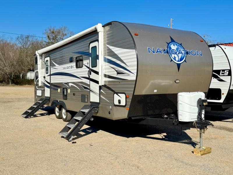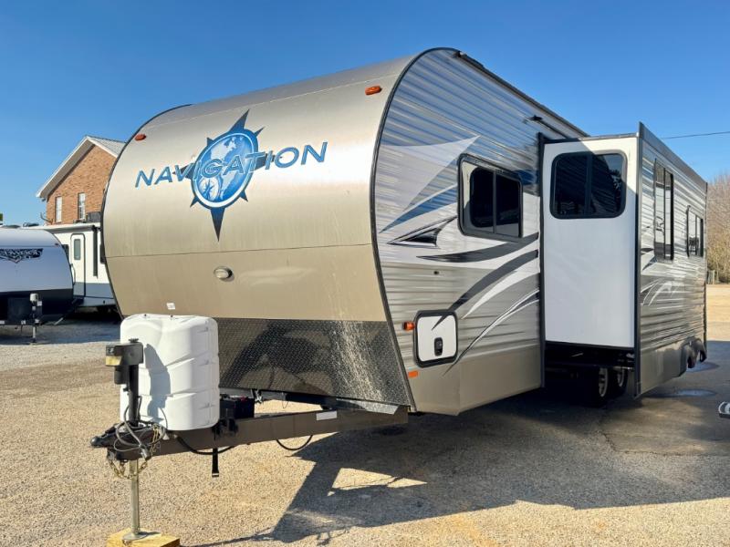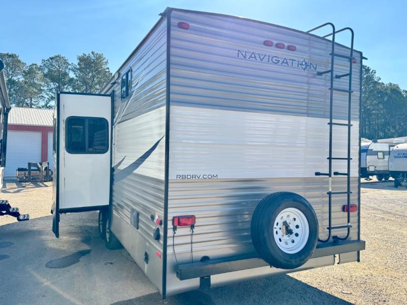 With each Navigation travel trailer by Recreation By Design, you will enjoy up-to-date amenities and quality construction all at an affordable price. The engineered trusses, I-beam super frame with E-Coat corrosion prevention, and aluminum mesa siding provide a strong unit made to last through years of fun and memories. You will find plenty of exterior conveniences, such as Lippert Solid drop-down steps for stability, magnetic compartment door holders, and an outside shower. The inside of each Navigation trailer is made to feel at home with an 84" interior height, residential kitchen backsplash, a king bed with an upgraded innerspring mattress, a one-piece fiberglass shower or tub, plus many more amenities. Your camping experience can be further customized by adding one or more of the many options available, like the electric stabilizer jacks in place of the crank down jacks, the 30" fireplace with a remote, the second 15,000 BTU A/C unit, and more!