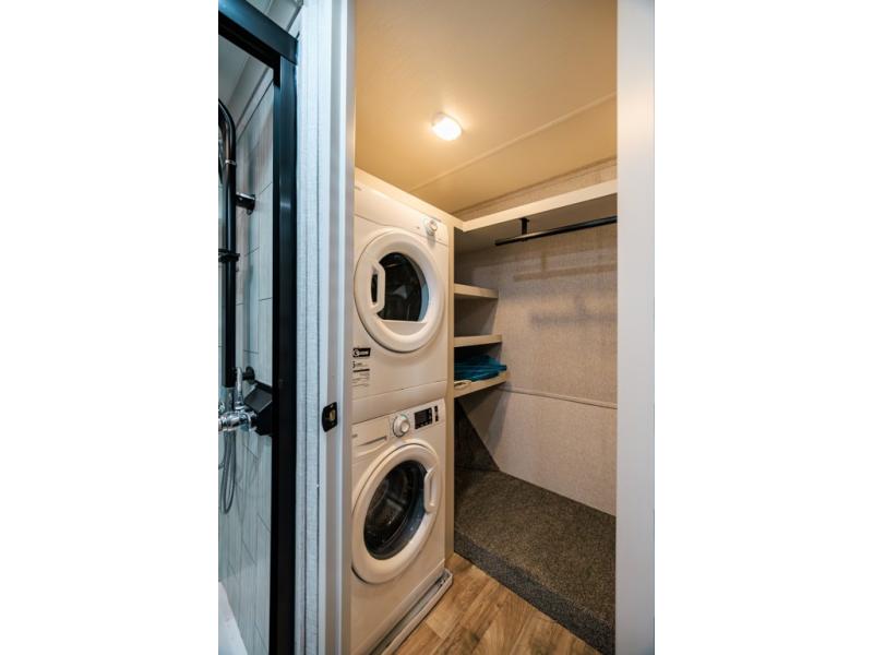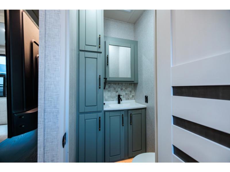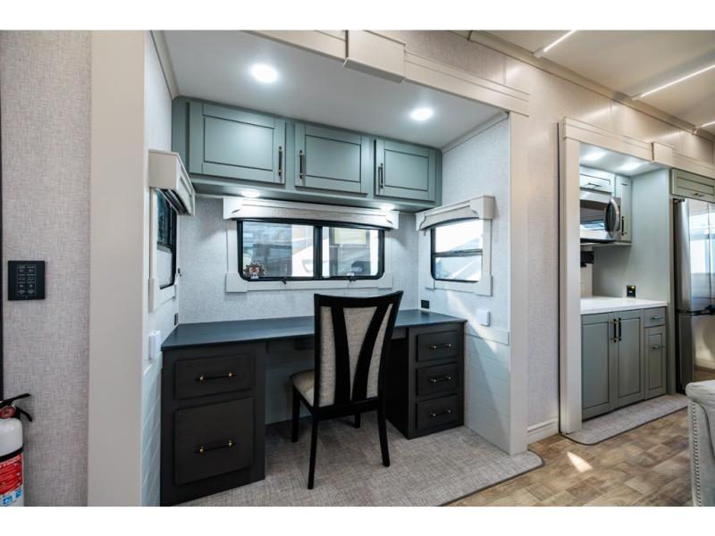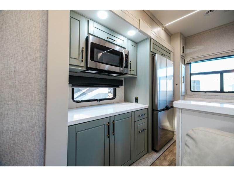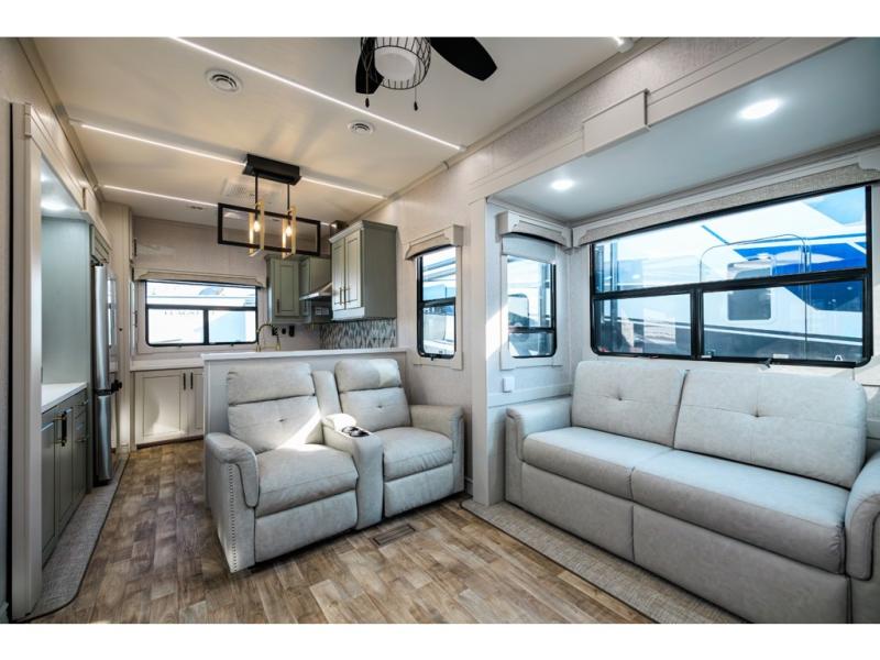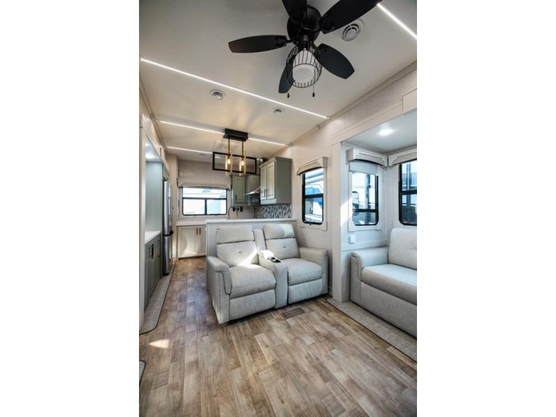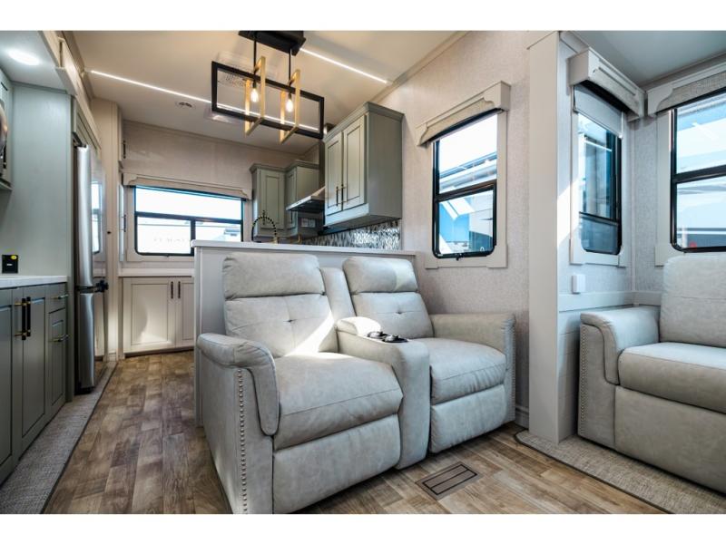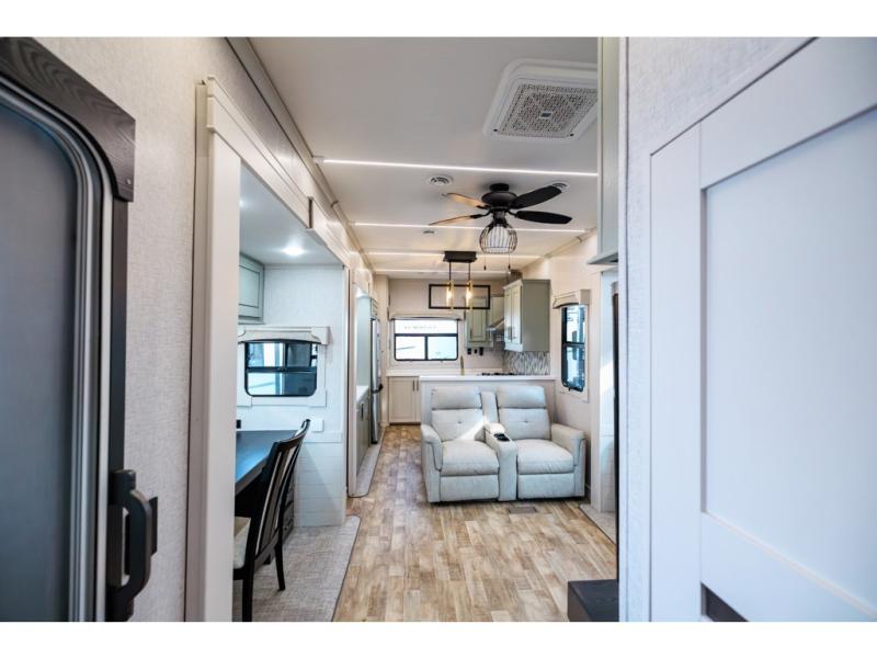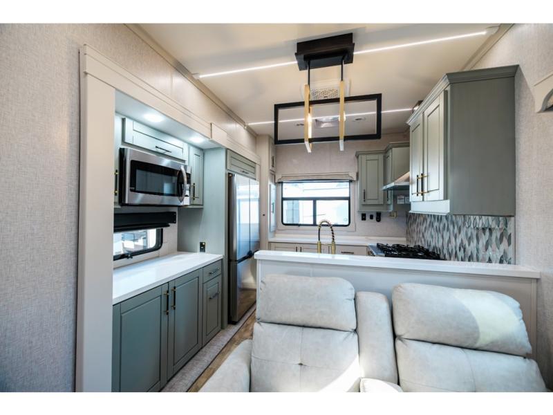 One step inside this fifth wheel and you'll see why it's an award-winning most-popular unit! You'll love the rear kitchen that includes ample countertop for food prep and a slide including the refrigerator, pantry and microwave for added moving around space. Head to the main living area where you can enjoy some family time on the theater seats, and the dinette with chairs will be the perfect place for a game of cards. The half bath is right off of this room for convenience, and your guests or kids can convert the tri-fold sofa into a bed for sleeping space at night. You will love the master bedroom with a king bed slide out, a dresser with a flip-up lid, plus a 39" TV. The front full bath is super spacious, and it includes a large walk-in wardrobe where you can even add an optional washer and dryer if you choose!