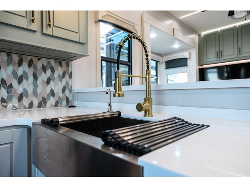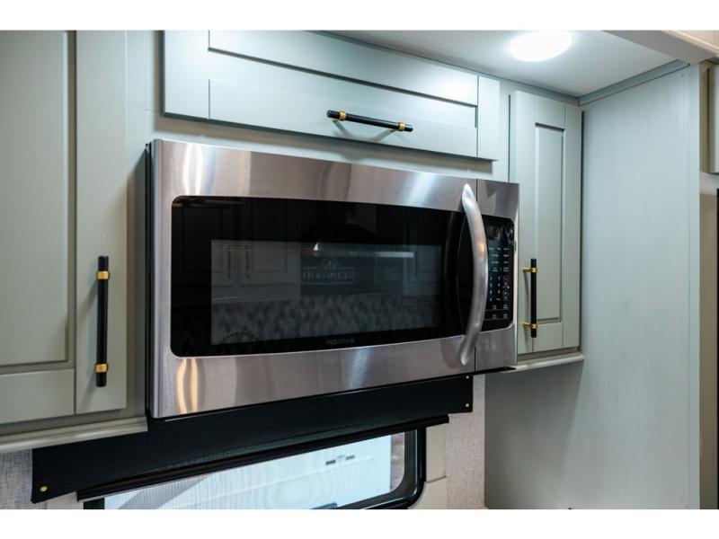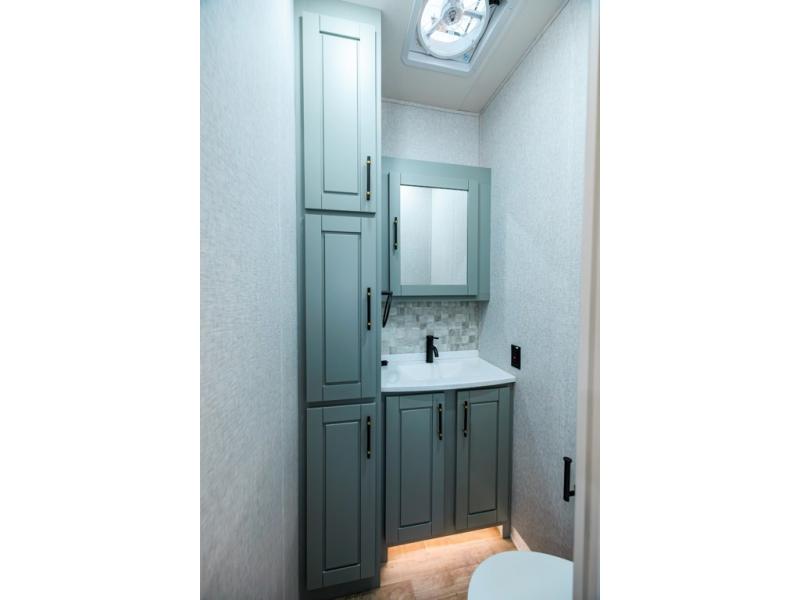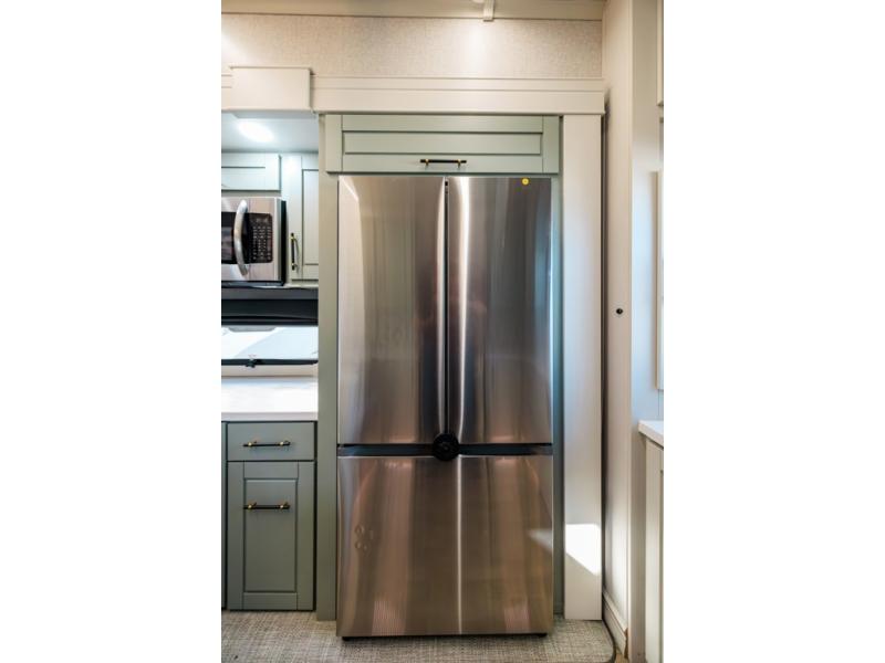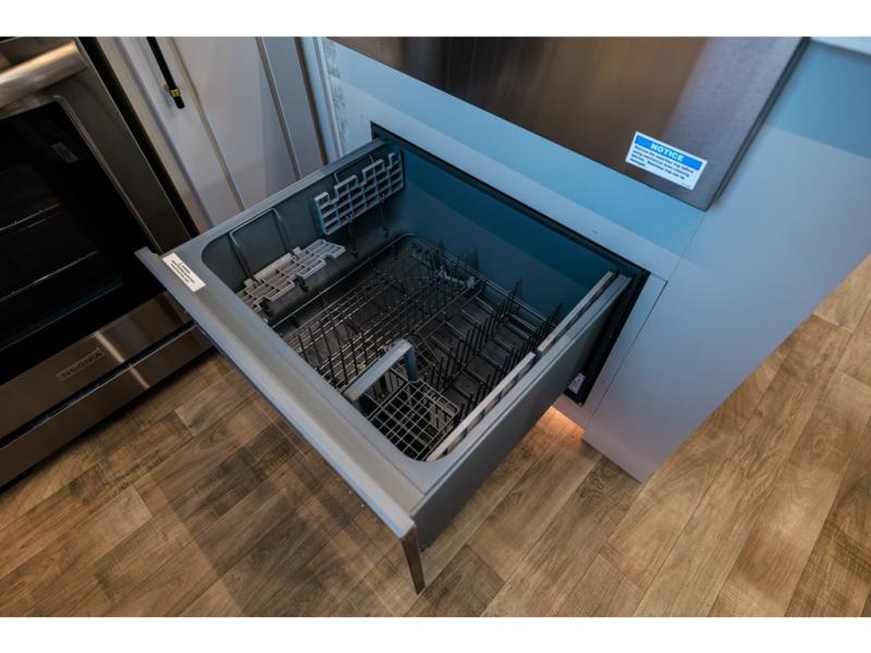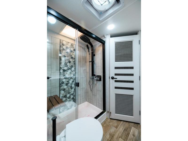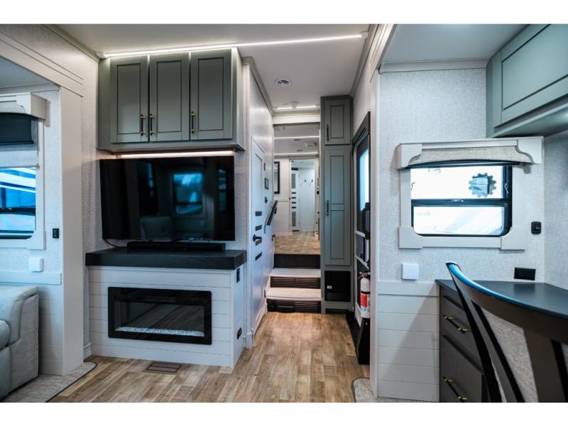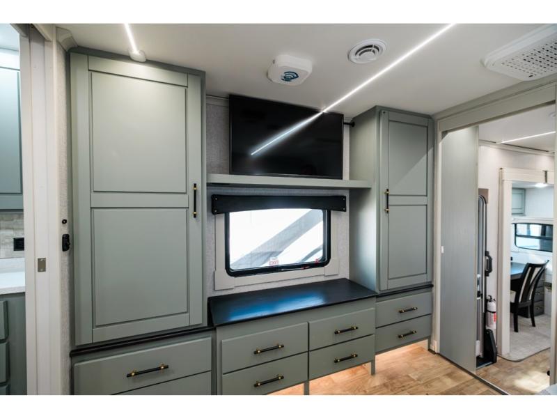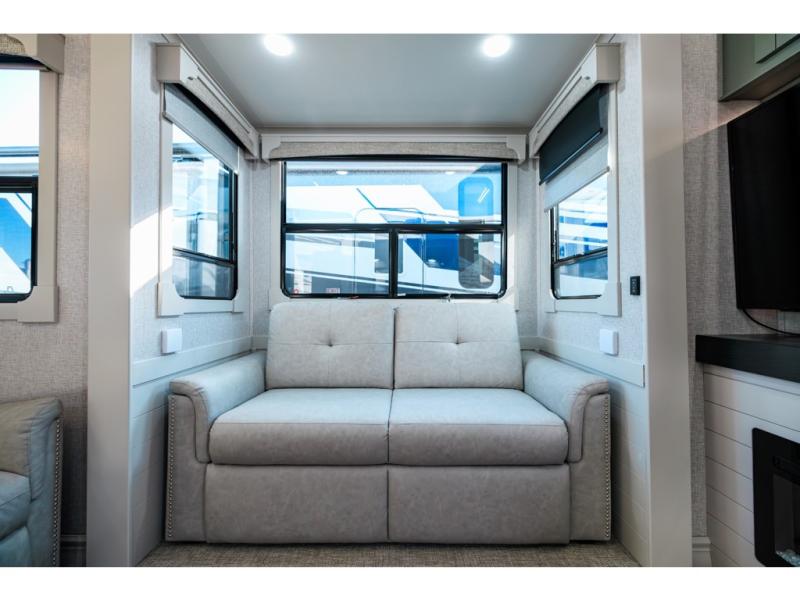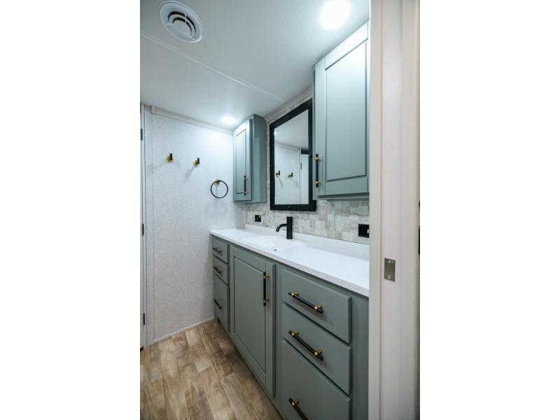 One step inside this fifth wheel and you'll see why it's an award-winning most-popular unit! You'll love the rear kitchen that includes ample countertop for food prep and a slide including the refrigerator, pantry and microwave for added moving around space. Head to the main living area where you can enjoy some family time on the theater seats, and the dinette with chairs will be the perfect place for a game of cards. The half bath is right off of this room for convenience, and your guests or kids can convert the tri-fold sofa into a bed for sleeping space at night. You will love the master bedroom with a king bed slide out, a dresser with a flip-up lid, plus a 39" TV. The front full bath is super spacious, and it includes a large walk-in wardrobe where you can even add an optional washer and dryer if you choose!