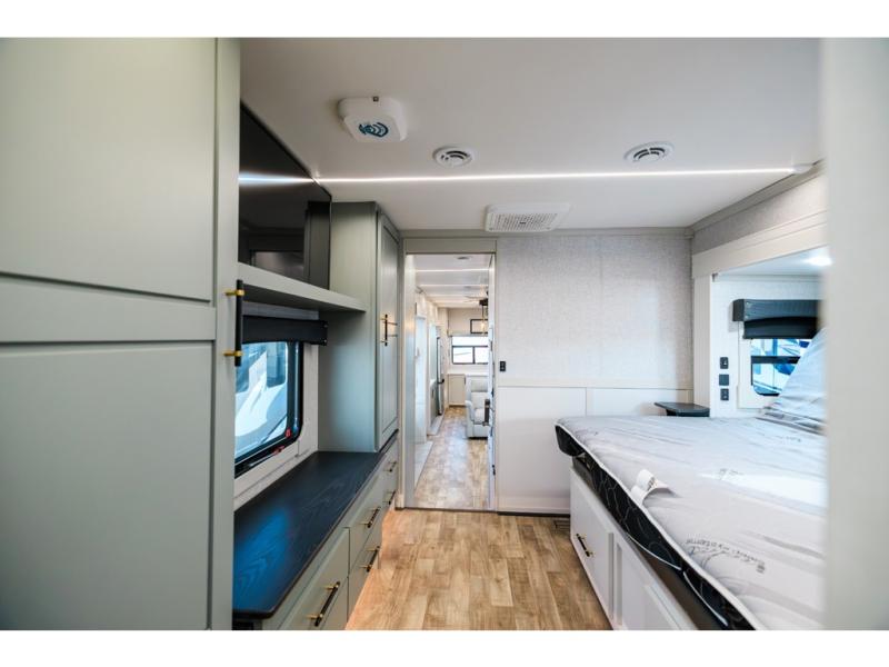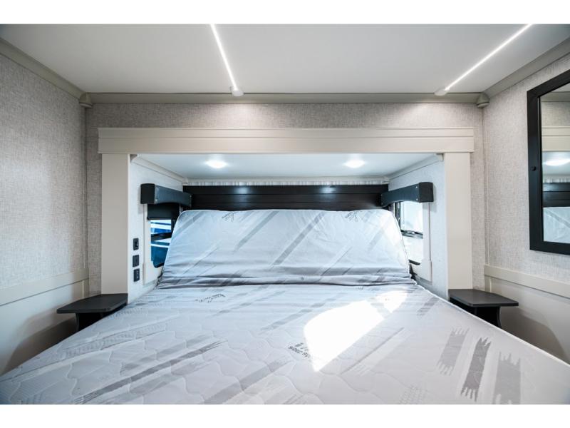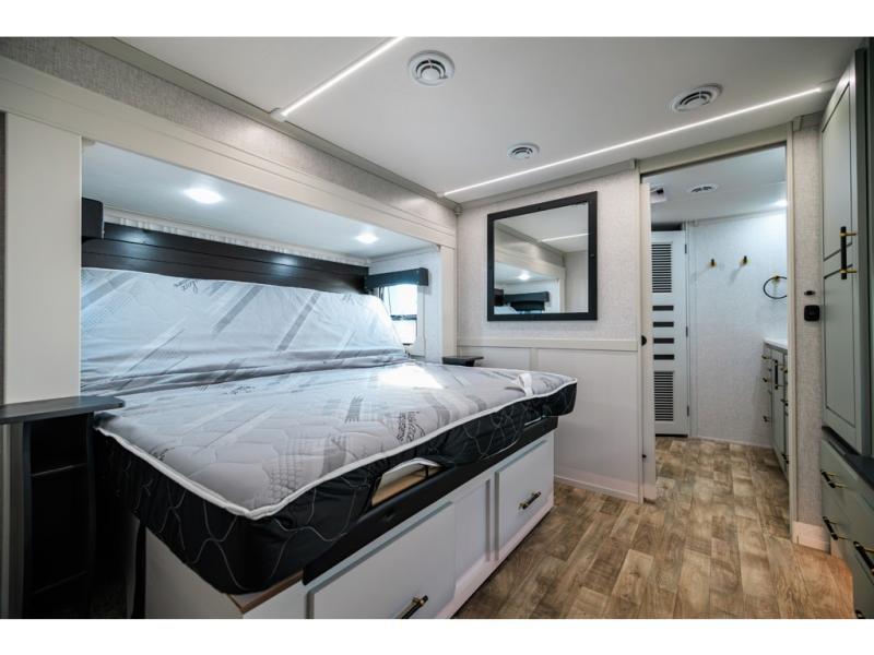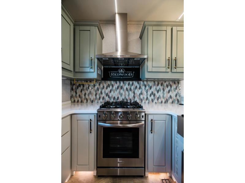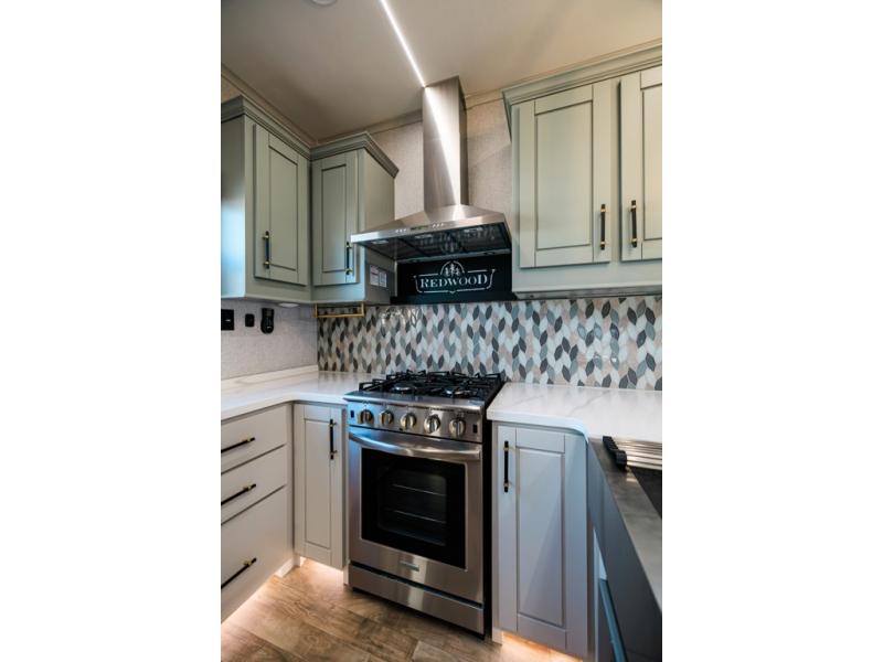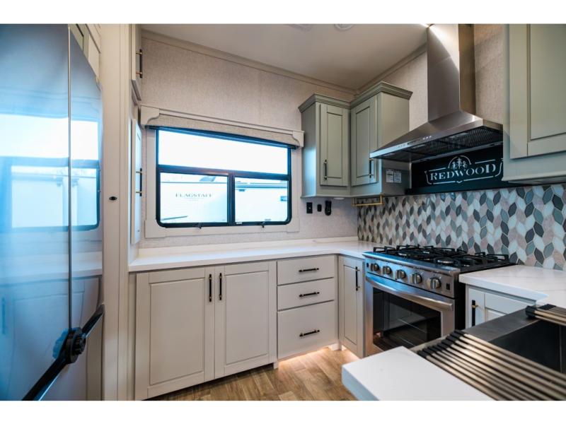 You are going to wish you found the Redwood fifth wheels sooner! With all of the residential comfort and modern luxury, you will be impressed. The Williamsburg Furniture Collection includes two premium dinette chairs, a buffet-style adjustable dinette with leaf extension, a residential-style sofa, and powered theater seating. The luxury further extends to the bedroom where you will find a gel-foam king bed with tilt and C-PAP shelves on both sides of the bed. The straight roof line gives a luxury profile, and there are preparations for a wireless backup camera as well as solar power. The seamless residential insulated heat ducts will efficiently heat your unit, and there is an exterior radio in the fully finished and heated pass-through with slat board storage.