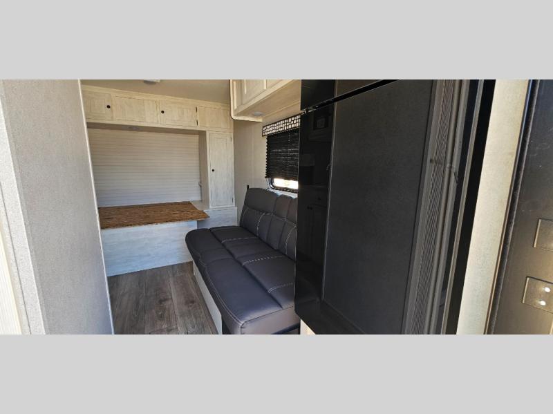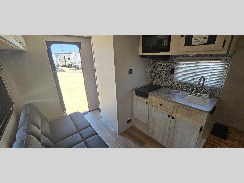 This trailer is perfect for couples or weekend trips to the lake with your buddy. There is a front queen bed with an overhead cabinet, a wardrobe, plus a bed shelf to keep valuables close by, and the sofa will provide seating and sleeping space for guests. There is a private bathroom with a toilet and a shower so you won't have to use the camp's facilities in the middle of the night. You will love having a two burner cooktop and microwave oven to cook meals each day, plus there is a 4.5 cu. ft. refrigerator for cold items!