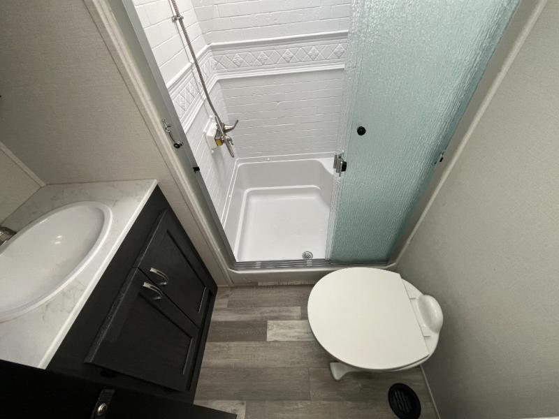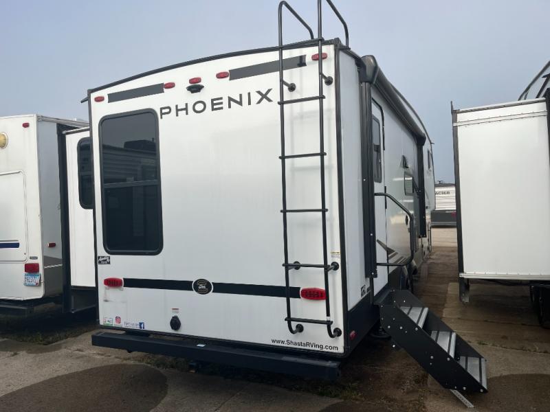 Stand out from all the others with one of these Shasta RVs Phoenix Lite fifth wheels! They are constructed with Weather Shield+ technology, dual-sided Azdel composite sidewall panels, and Tri-Tex powder coated frame technology that is ultra weather resistant. There is also electric front jacks and electric rear stabilizer jacks, electric awning with LED light strip and one hand pitch adjustment, roof mounted solar prep, and many more exterior conveniences. The interior includes dual USB charging ports, solid hardwood drawer and cabinet faces, roller night shades, and a large transom window in the kitchen. You will also enjoy the 15,000 BTU dual ducted main air conditioner to keep you comfortable throughout your fifth wheel, the Winegard Air 360+ to keep you connected to the outside world as you camp, plus the hot and cold outside shower to wash off hiking boots and gear!