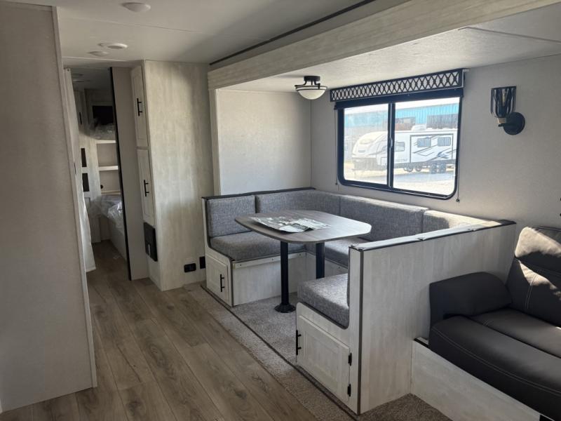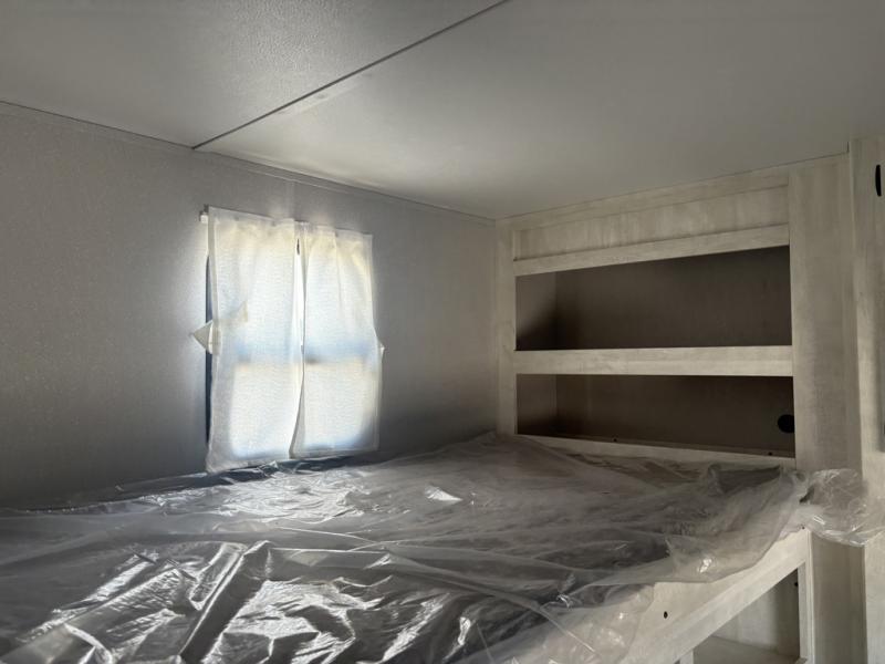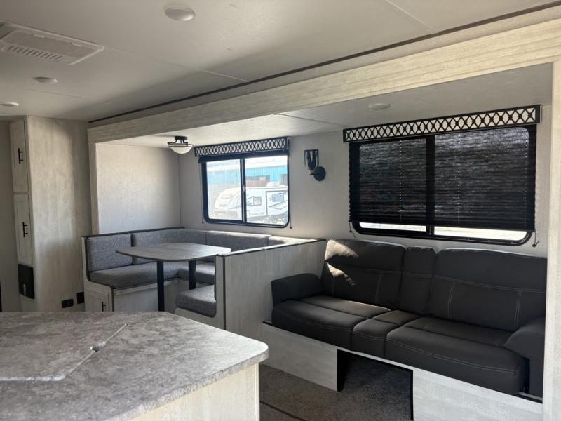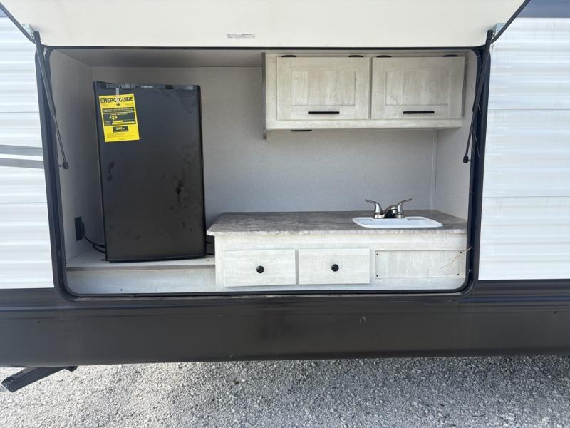 When you enjoy the outdoors as much as the indoors, this trailer will provide you the total package! You can relax under the power awning and enjoy the outside entertainment center while the cook prepares a meal using the standard outside kitchen with a sink, fridge, counter space and overhead cabinet. When you want to enjoy some air conditioning, head back inside and relax on the sofa and U-shaped dinette slide out. The cook may then use the interior kitchen amenities to make a warm meal, and wash dishes in the dual sink. When it's time for bed, get cleaned up in the full bathroom then choose the rear private bunkhouse with three bunk beds, or the front dual entry bedroom with an RV queen bed. And there is storage space throughout for all your belongings!