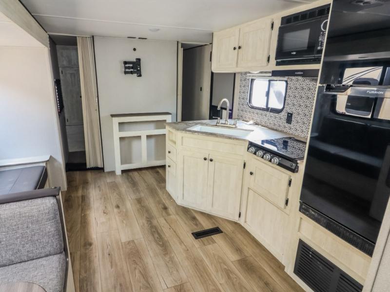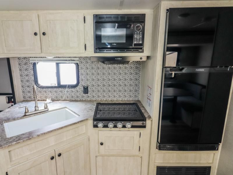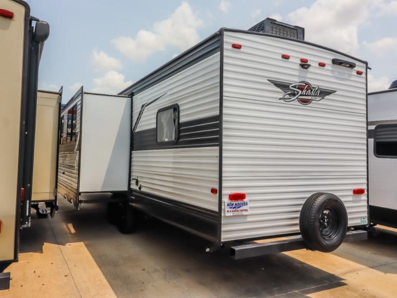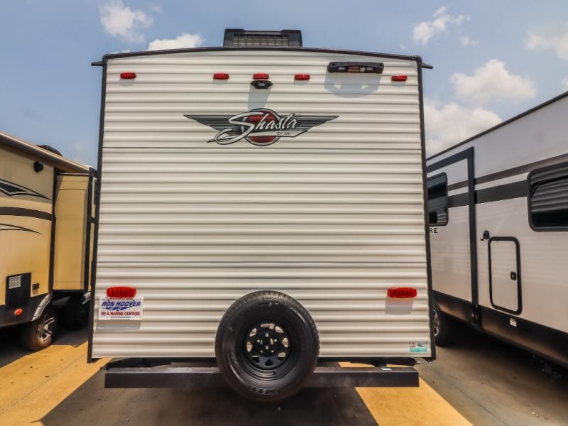With each Shasta travel trailer by Shasta RVs, premium construction products are used such as radius wood rafters, wall studs on 16” centers, cambered steel I-beam frame, Congoleum flooring, and seamless countertops. Also included is an aerodynamic radius front profile, a front colored rock guard to protect against road debris, a straight axle with electric brakes, and a power tongue jack for easy setup. The interior offers decorative cabinet pulls, USB charging stations, an under-mount kitchen sink with a sink cover, and more providing value and convenience. Since there is King WiFi prep you have the option to work remotely, plus you can add electric stabilizer jacks, aluminum wheels, roof mounted 200 watt solar panel, and more available options!