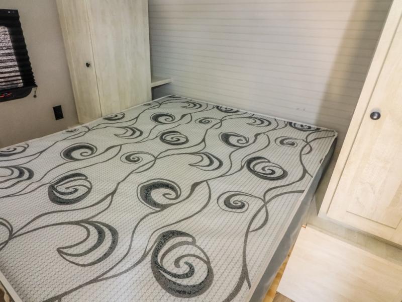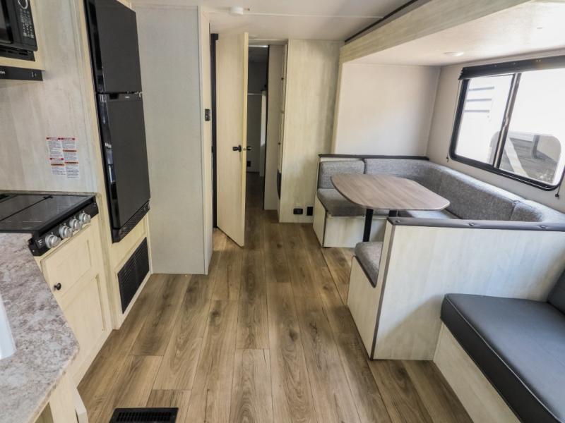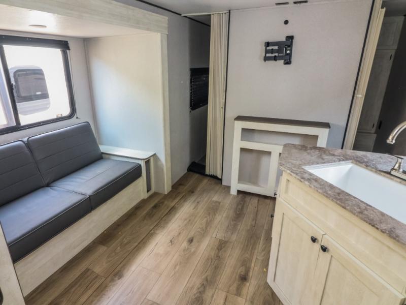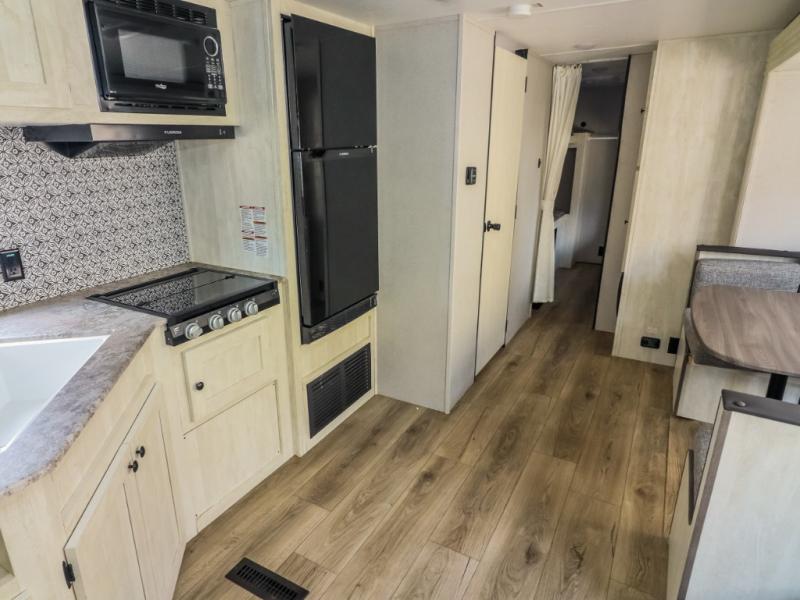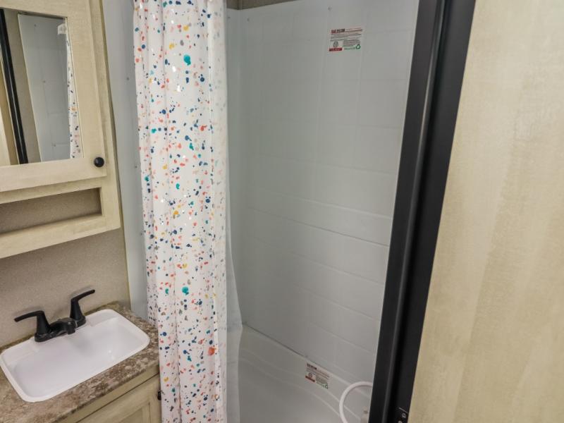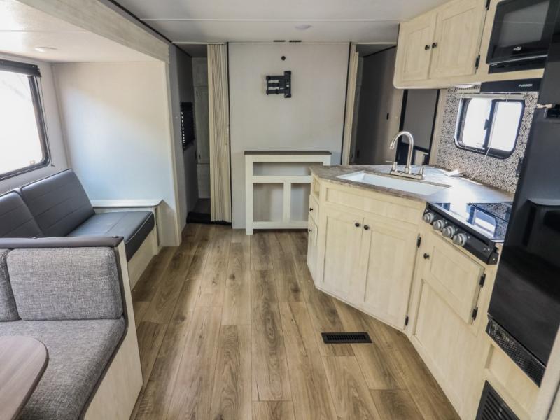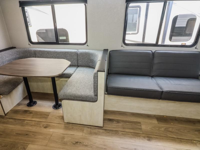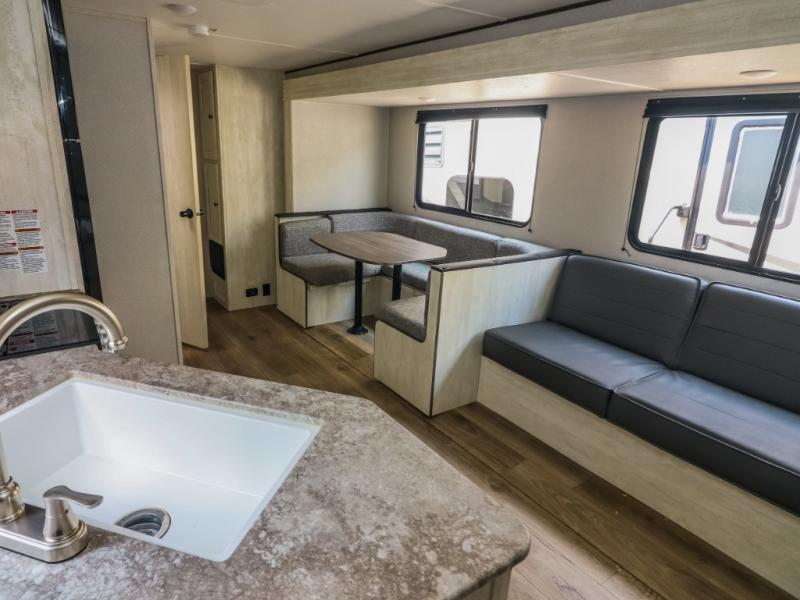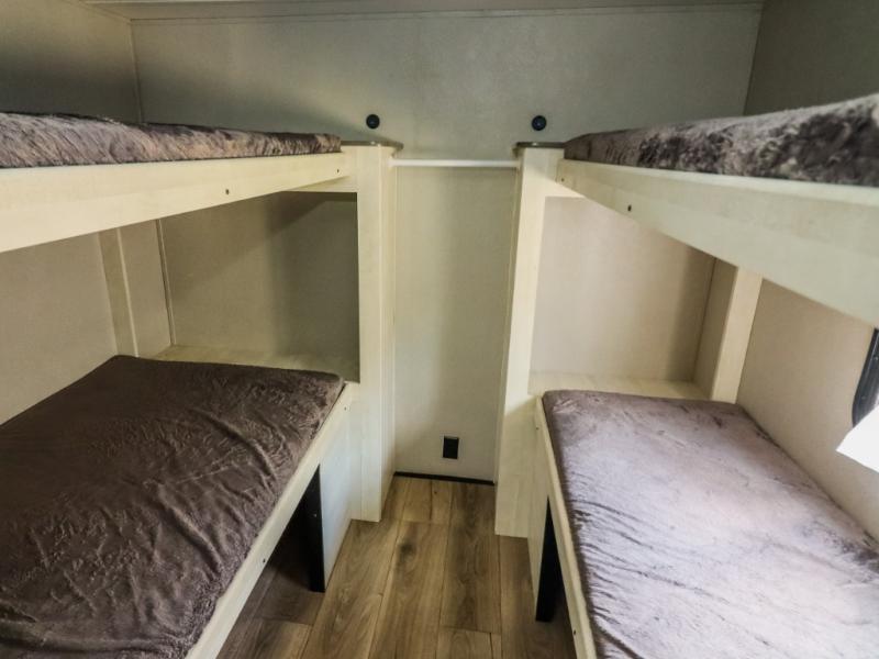 You and your guests will appreciate having privacy in this spacious travel trailer with a rear bunkhouse and a front bedroom! The bunkhouse includes four bunks, two storage cabinets, plus a hanging bar so clothes stay wrinkle-free. A queen bed comes standard in the front bedroom to ensure a great night's rest, plus there are dual bedroom wardrobes and two bed shelves to keep valuables close by. Everyone can meet in the combined kitchen and living area that includes a large slide out for more space. The sofa and U-shaped dinette here will provide a place to relax, play games, and even sleep more guests if needed. And of course, you can't overlook the full bath, complete with a large sink, shower skylight, and powered roof vent to keep everything fresh!
