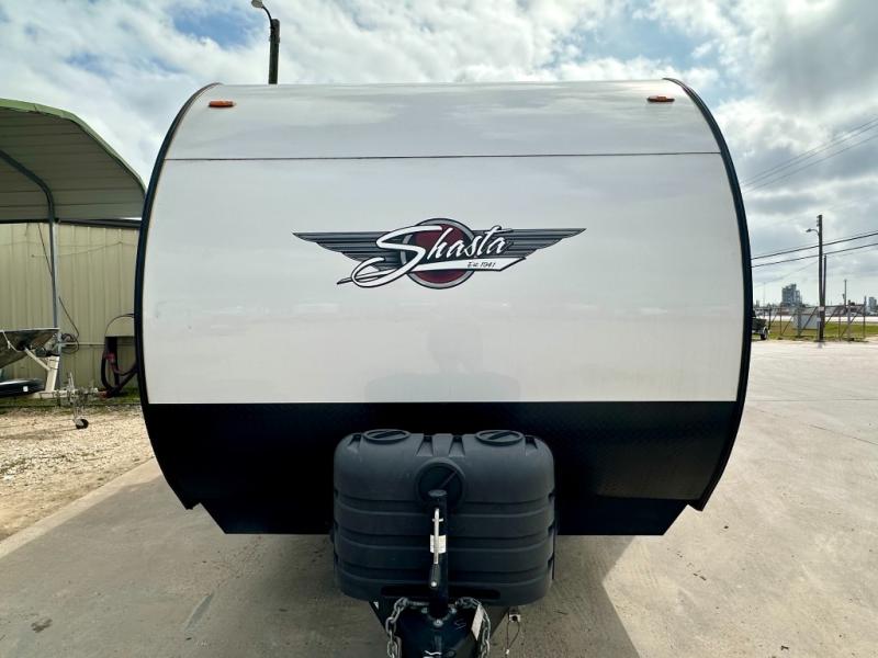 With each Shasta travel trailer by Shasta RVs, premium construction products are used such as radius wood rafters, wall studs on 16” centers, cambered steel I-beam frame, Congoleum flooring, and seamless countertops. Also included is an aerodynamic radius front profile, a front colored rock guard to protect against road debris, a straight axle with electric brakes, and a power tongue jack for easy setup. The interior offers decorative cabinet pulls, USB charging stations, an under-mount kitchen sink with a sink cover, and more providing value and convenience. Since there is King WiFi prep you have the option to work remotely, plus you can add electric stabilizer jacks, aluminum wheels, roof mounted 200 watt solar panel, and more available options!