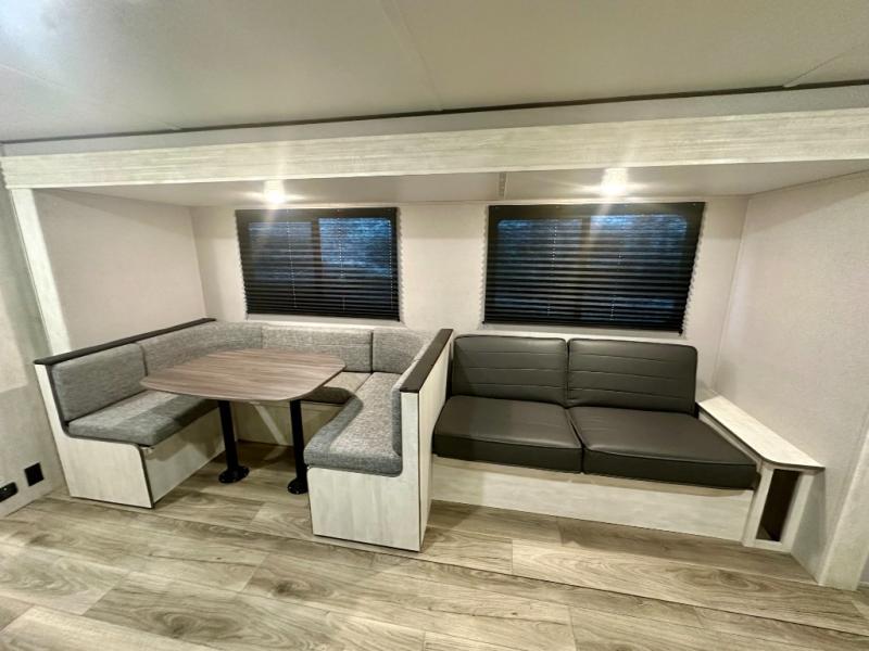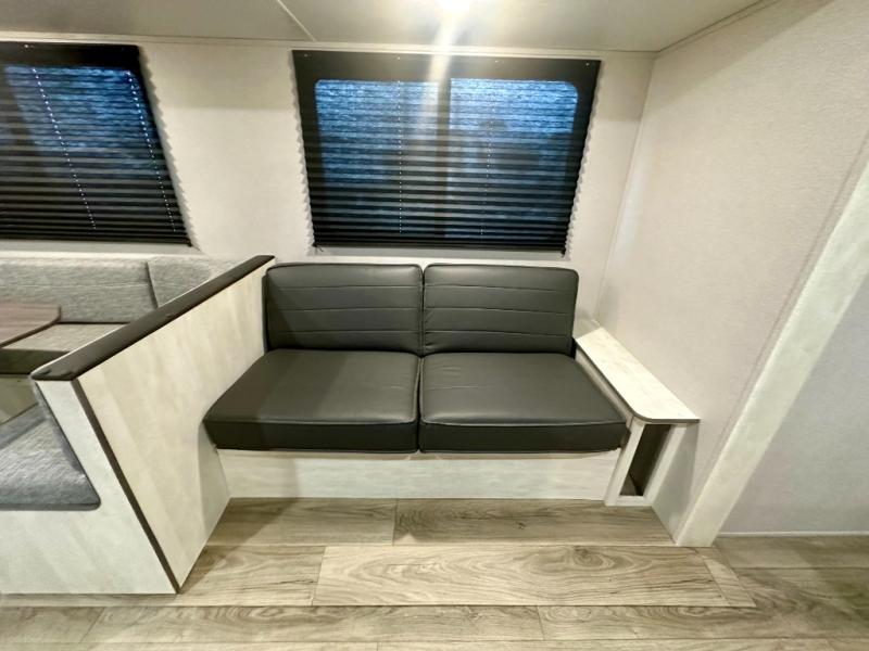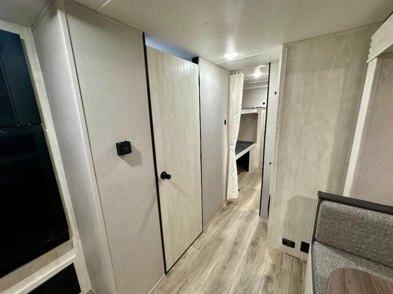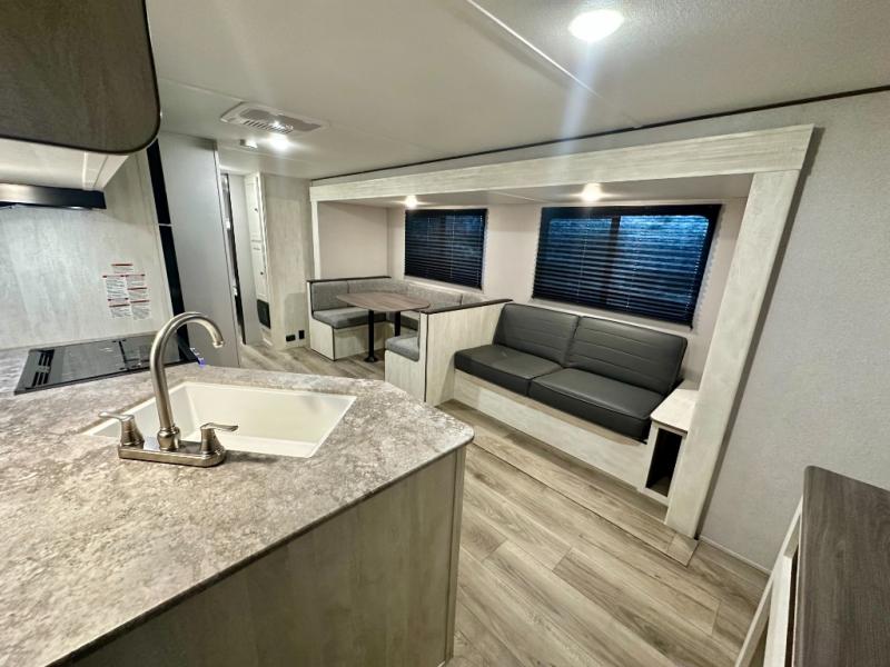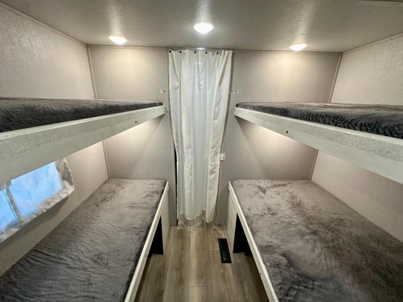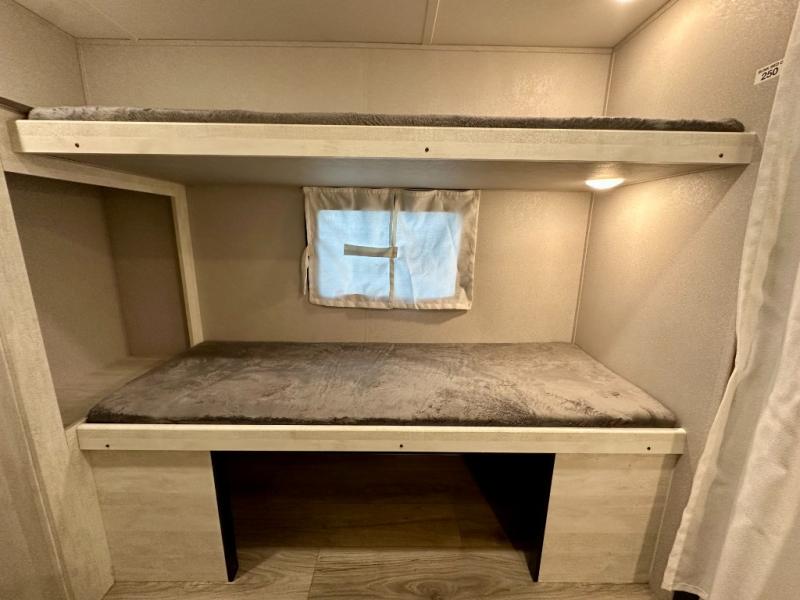 You and your guests will appreciate having privacy in this spacious travel trailer with a rear bunkhouse and a front bedroom! The bunkhouse includes four bunks, two storage cabinets, plus a hanging bar so clothes stay wrinkle-free. A queen bed comes standard in the front bedroom to ensure a great night's rest, plus there are dual bedroom wardrobes and two bed shelves to keep valuables close by. Everyone can meet in the combined kitchen and living area that includes a large slide out for more space. The sofa and U-shaped dinette here will provide a place to relax, play games, and even sleep more guests if needed. And of course, you can't overlook the full bath, complete with a large sink, shower skylight, and powered roof vent to keep everything fresh!