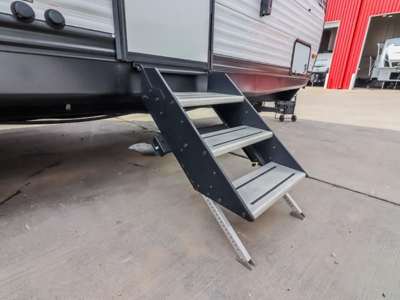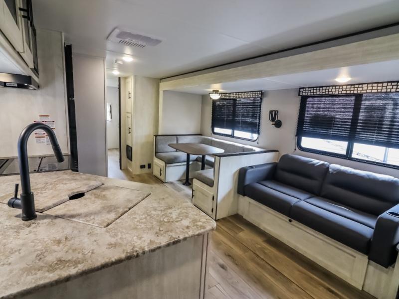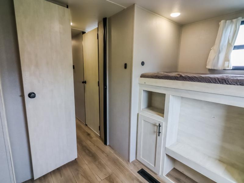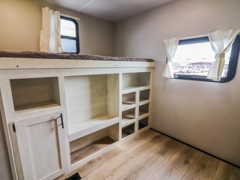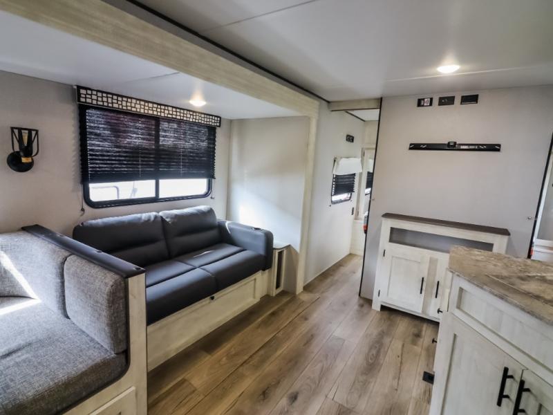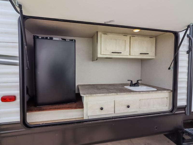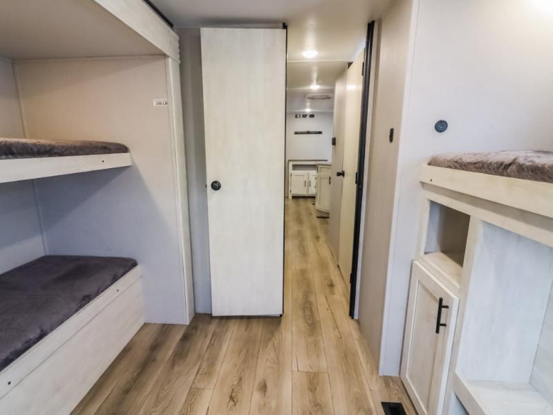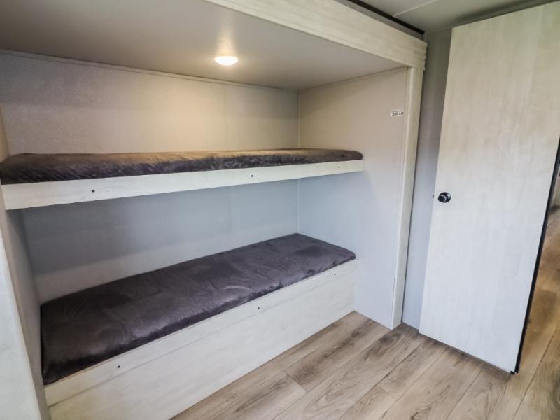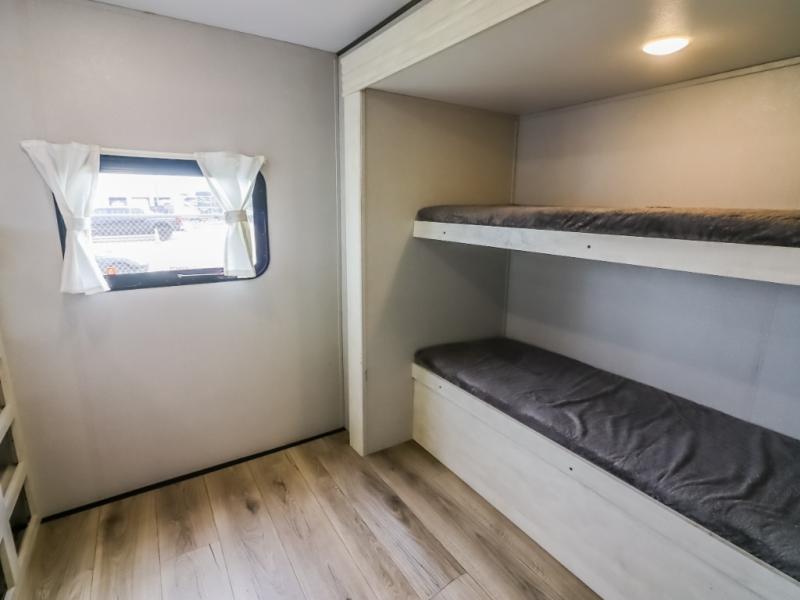 Get ready to stay awhile each time you take this trailer to the campgrounds! You will never want to return home due to all the comfortable and spacious accommodations. You will have your own privacy in the front bedroom which includes dual entry doors and two wardrobes. The kids will have the bunkhouse in the rear that offers a slide out with bunk beds and an upper large bunk across the room. The full bathroom has an interior and exterior entry for total convenience, and the main entry door allows you to be in the kitchen and living area in no-time. The kitchen offers full amenities including a pantry and 10 cu. ft. residential refrigerator, and the furniture slide out gives you more floor space, plus the sofa provides a place to relax. The furniture also doubles as extra sleeping space when needed. And don't forget about the outside kitchen and entertainment center when guests are over!