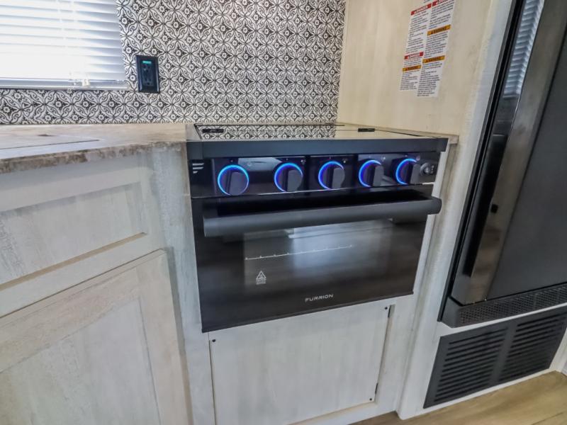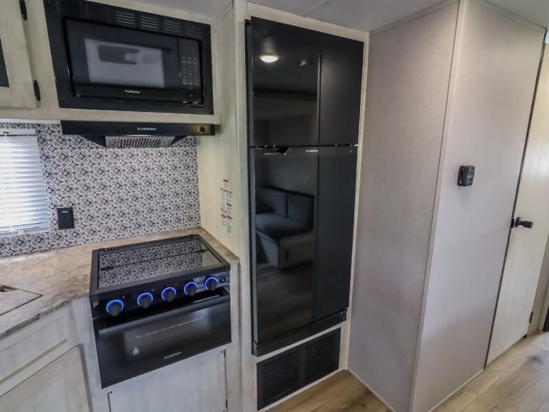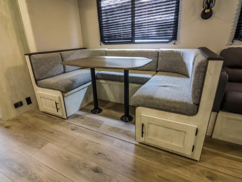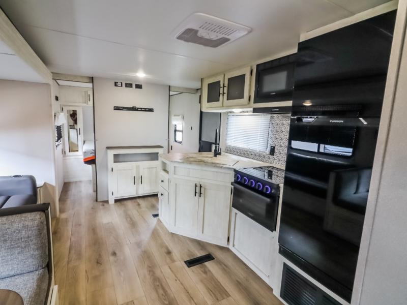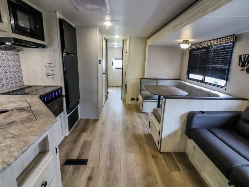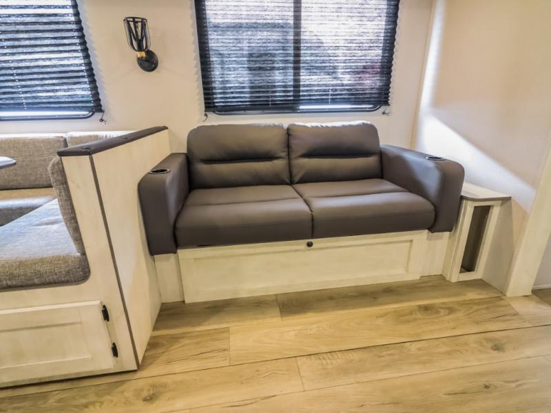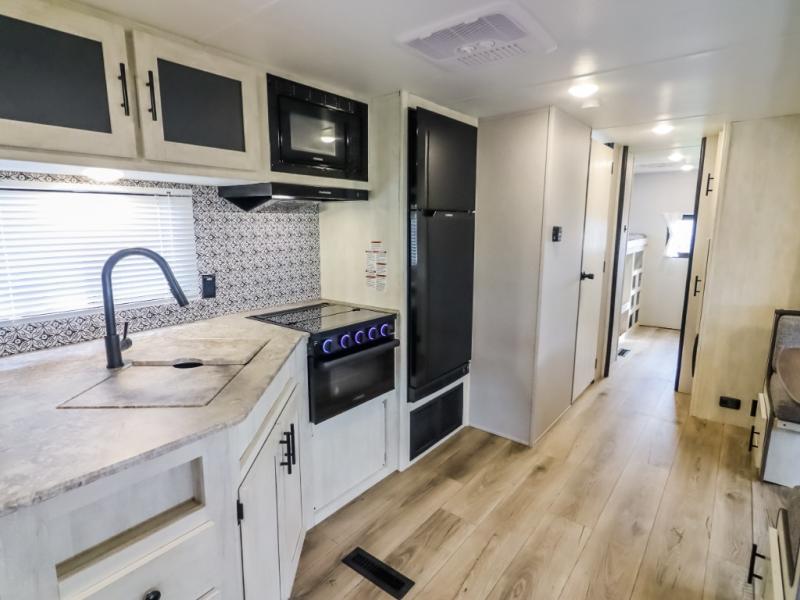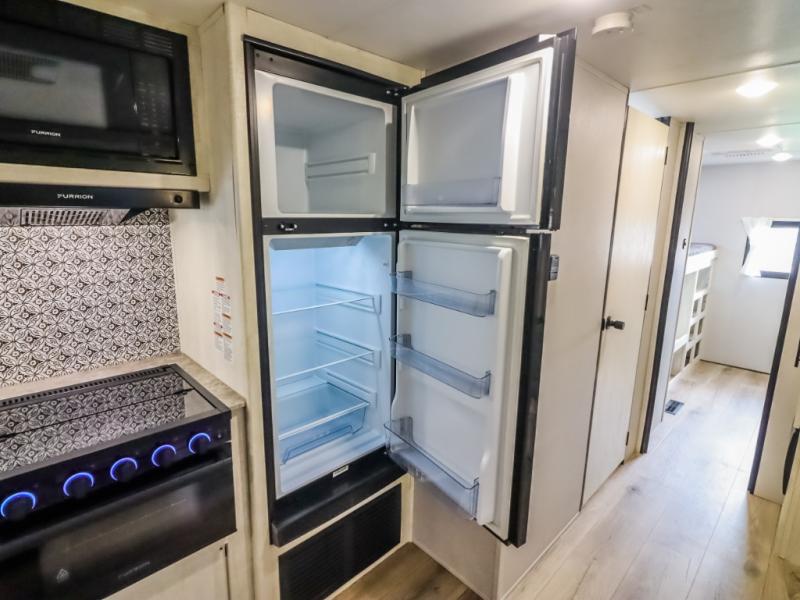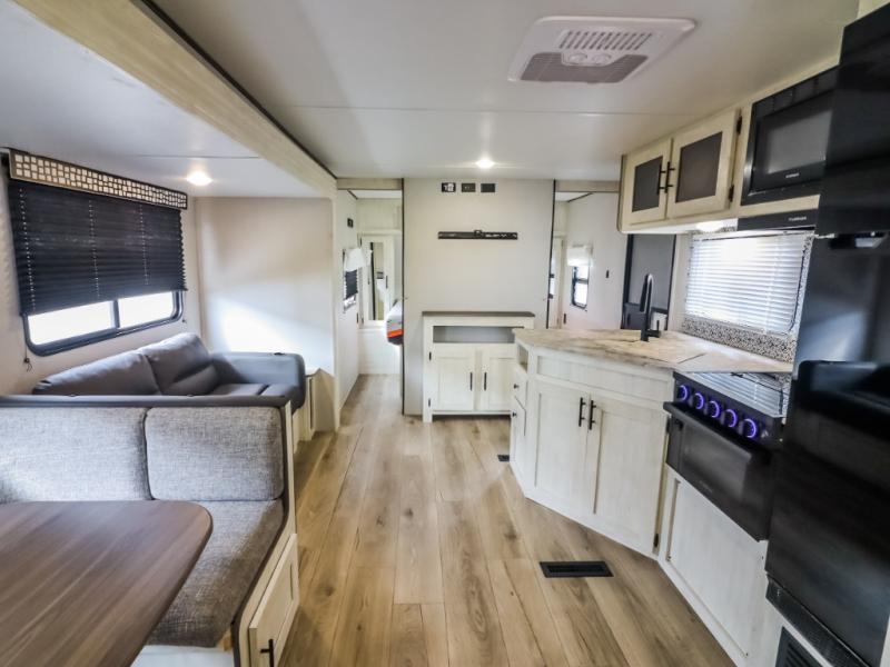 Get ready to stay awhile each time you take this trailer to the campgrounds! You will never want to return home due to all the comfortable and spacious accommodations. You will have your own privacy in the front bedroom which includes dual entry doors and two wardrobes. The kids will have the bunkhouse in the rear that offers a slide out with bunk beds and an upper large bunk across the room. The full bathroom has an interior and exterior entry for total convenience, and the main entry door allows you to be in the kitchen and living area in no-time. The kitchen offers full amenities including a pantry and 10 cu. ft. residential refrigerator, and the furniture slide out gives you more floor space, plus the sofa provides a place to relax. The furniture also doubles as extra sleeping space when needed. And don't forget about the outside kitchen and entertainment center when guests are over!