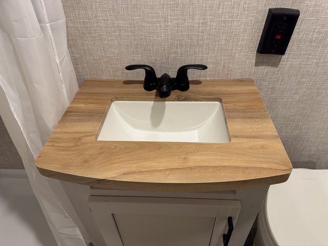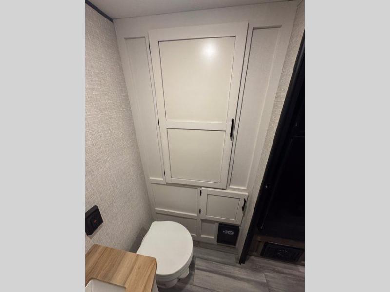 The full rear bathroom includes a foot-flush toilet, powered bath vent, and a dedicated bath wardrobe for towels and toiletries, giving you the comfort of home while traveling.