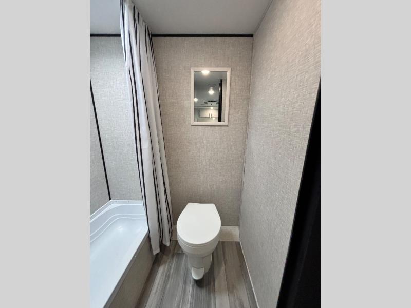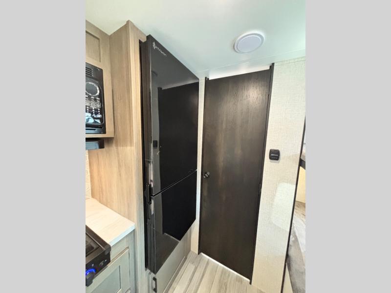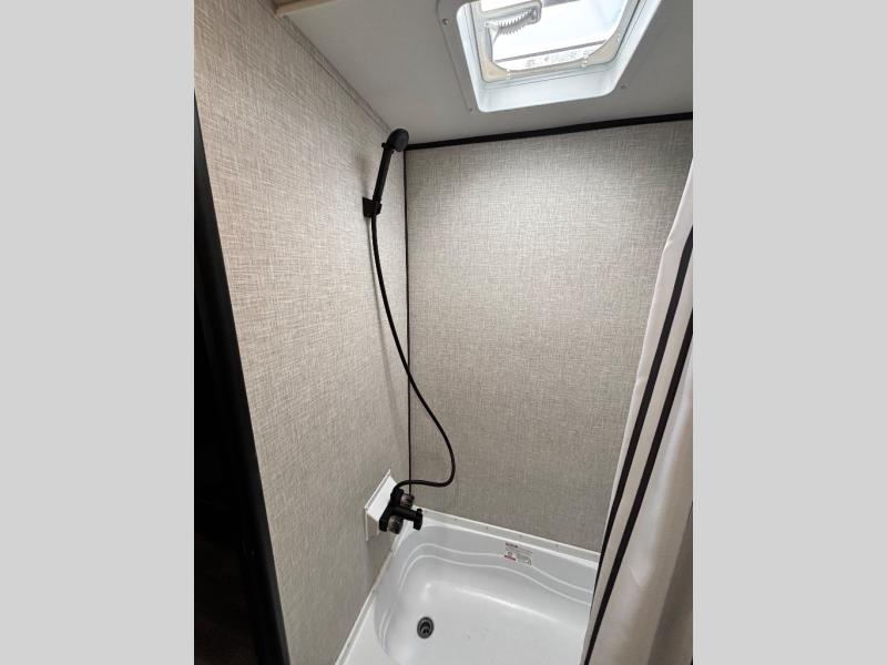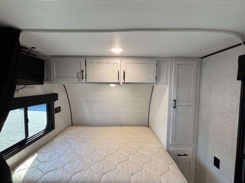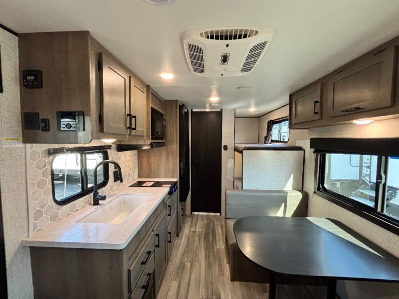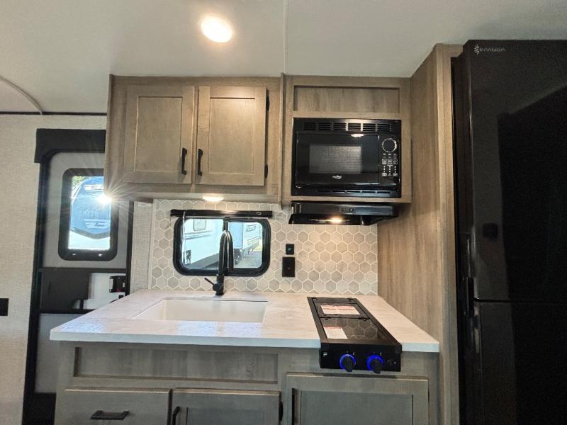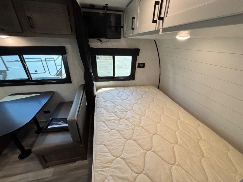 If you're in the market for a lightweight single axle travel trailer with bunk beds, you're in luck with this unit! You will have the front bed all to yourselves, and there is a wardrobe here to store your clothes. The chef can whip up lunch on the two burner cooktop, and you can dine at the booth dinette. If the weather is nice, you may just want to sit outdoors under the 13' power awning with LED lights. The rear corner bath includes a foot flush toilet and a tub/shower, and you'll find plenty of storage space throughout this model, including outside storage for charcoal, tackle boxes, and tools!