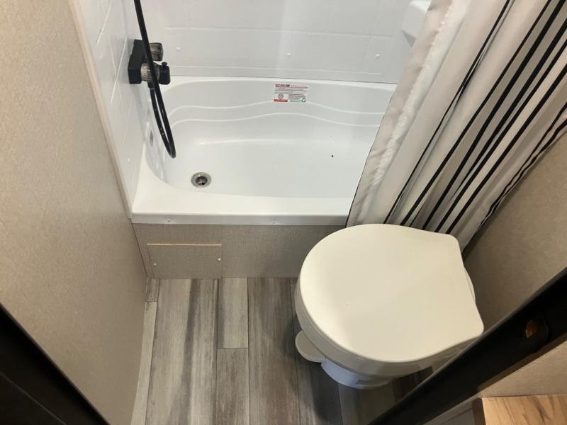 Easy to tow, set up and enjoy, this dual axle trailer offers lots of sleeping space, a booth dinette for two, and a versatile front living area and bedroom combination. You can relax on a jackknife sofa during the daytime, and easily prepare the Murphy bed at night. You will also have two wardrobes to hang your clothes and an overhead shelf for more storage. The galley kitchen offers a 17" oven, a microwave and a refrigerator. The bathroom sink is just outside the private toilet and tub/shower room so two people can get ready at one time. And the double-size bunks will be a favorite sleeping space. There are options you might like to add such as a 15,000 BTU A/C and/or a Smart TV.