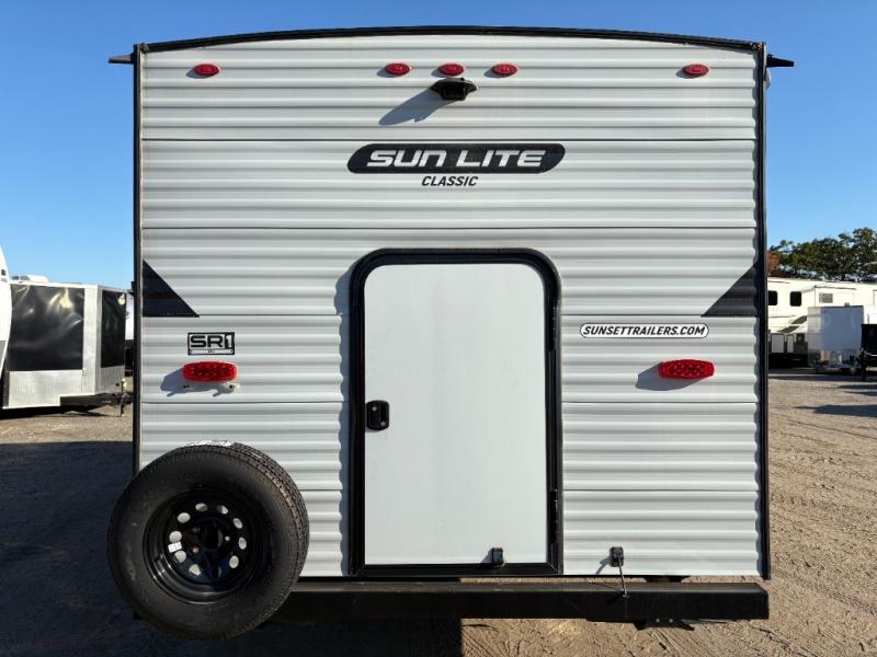 You can trust the build and enjoy your experience with any one of these Sunset Park RV Sun Lite travel trailers! Their aerodynamic profile is not only easy to haul, but also saves on fuel. They are built to withstand years of traveling even though they are lightweight with a diamond plate rock guard, a one piece PVC roof membrane, Dexter Spring-Leaf axles, and tinted safety glass windows. Some comfort standards you are sure to enjoy are the two-burner stove top range with hood, light and fan, plus refrigerator and microwave, and an outside shower to help keep the dirt outdoors where it belongs.