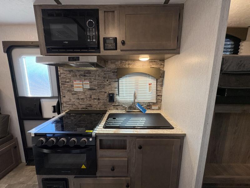 With room for four campers your family will enjoy each weekend get-a-way! The front booth dinette does double duty and can transform into to a large sleeping area at night. There is ample storage in the overhead cabinets, as well beneath each dinette seat. In back, a drop-down bunk above a desk area is a great place for the children. A storage door in back allows you to easily pack up with the bunk in the upper position. The three-burner stove and microwave oven allow you to make meals and snacks for everyone. You also have an outside griddle for cooking outdoors when the weather is nice.