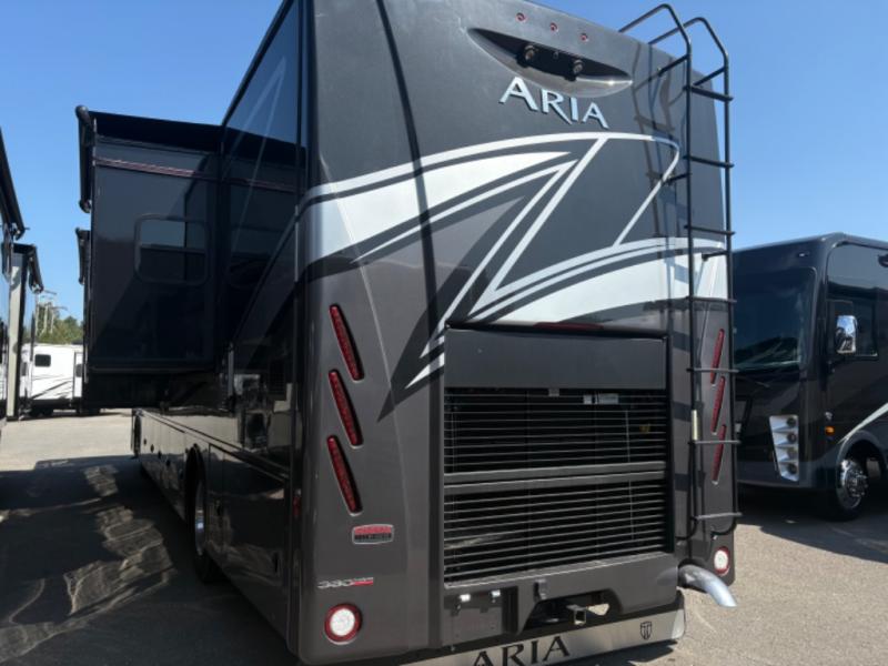 Exterior Excellence: Built on the Freightliner XC-R chassis, the Aria 3901 boasts a 100-gallon fuel capacity, automatic leveling jacks, and dual 15,000 BTU air conditioners for optimal comfort. The full-body paint with high-performance protection film ensures the coach maintains its pristine appearance, while the power awningsprovide shade and shelter at the touch of a button.