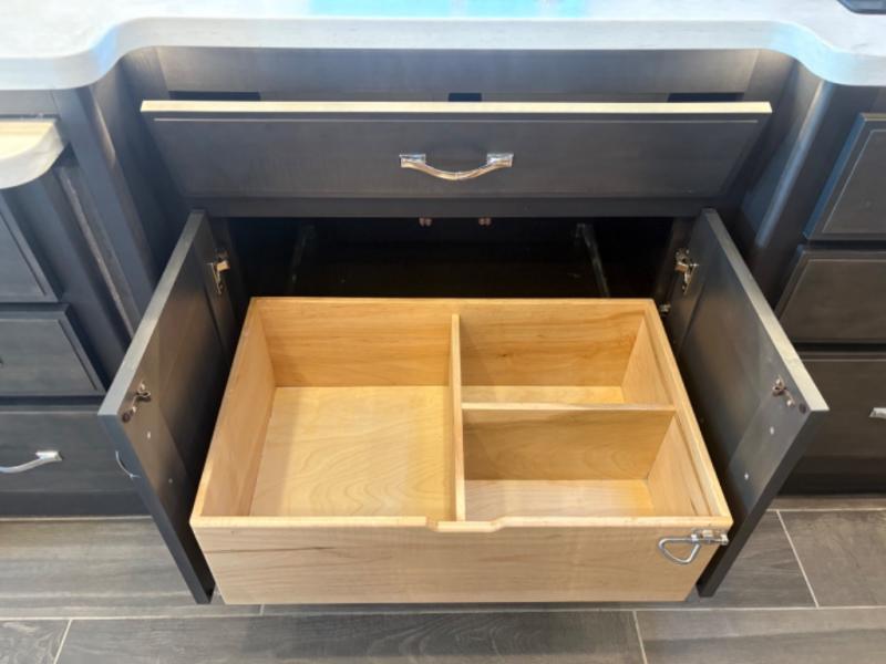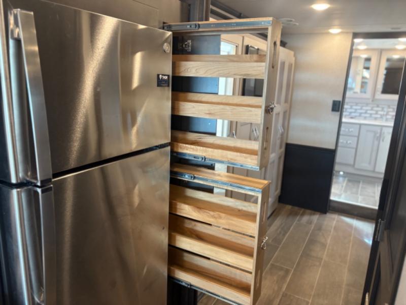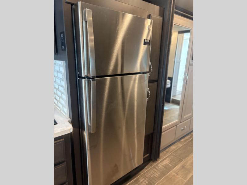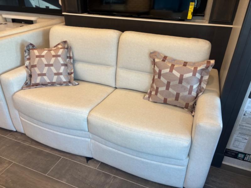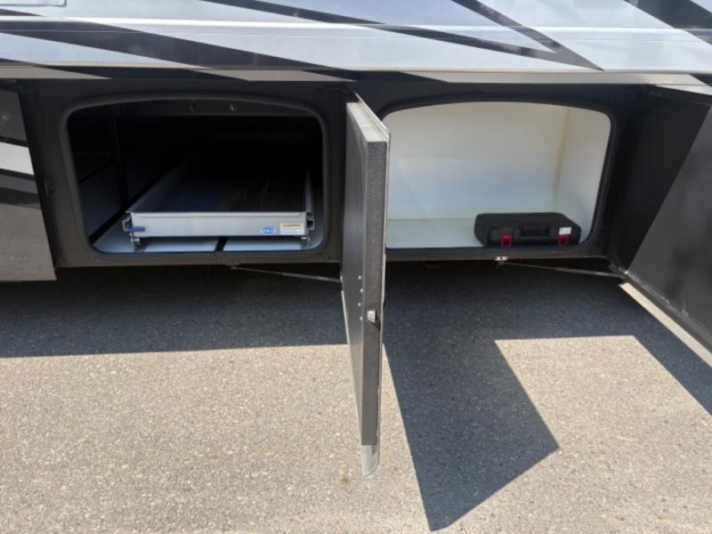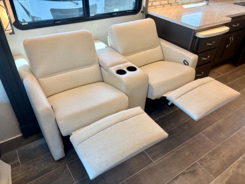 Spacious and Luxurious Interior: The 3901 floor plan features a king-size Tilt-A-View™ inclining bed, a full and half bath, and three slide-outs that expand the living area for maximum comfort. The high ceilings and large windows create an open, airy atmosphere, while the upgraded interior finishes add a touch of sophistication.