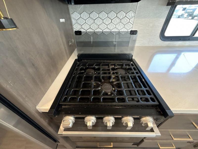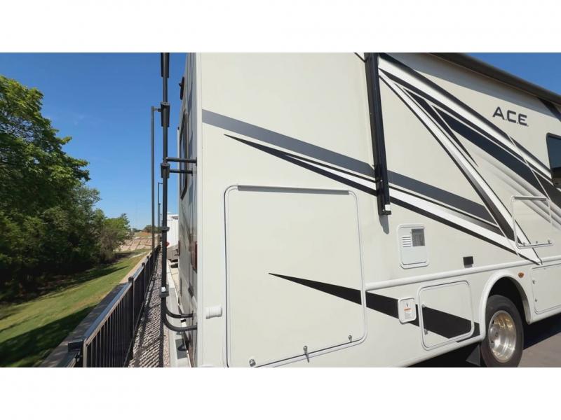 The A.C.E Class A gas motorhome is constructed with a welded tubular steel floor, vacu-bond laminated roof, walls and floor with block foam insulation, and a premium one-piece exterior roof for a coach made to last. You will love the pet-friendly features, like the Bird's Eye window, the Pet-Link multi-purpose tie-down and the Pull-Out Kibble Station with an FDS approved pet bowl liner. Each model includes an Onan RV QG 4,000 gas generator, a Winegard ConnecT Wi-Fi extender +4G, and are pre-wired for solar charging. Some of the other convenient amenities you will find on the A.C.E are framed windows, a basement pass-through storage, and an exterior LP connection. Head inside to find residential vinyl flooring, pressed laminate countertops, glass tile backsplash in the kitchen, and a designer headboard, bedspread and pillow shams in the bedroom for all-around comfort!