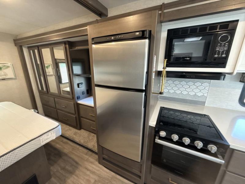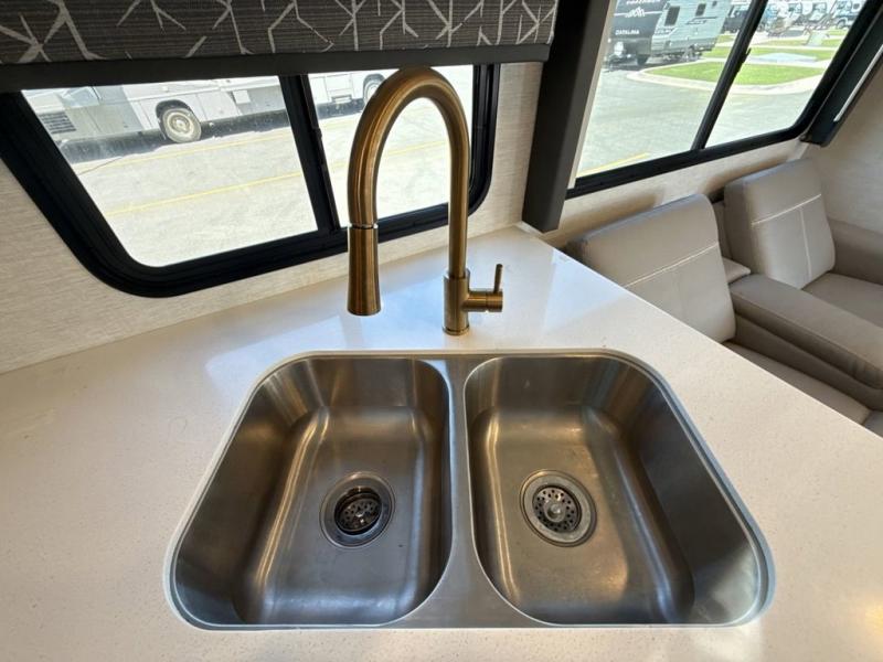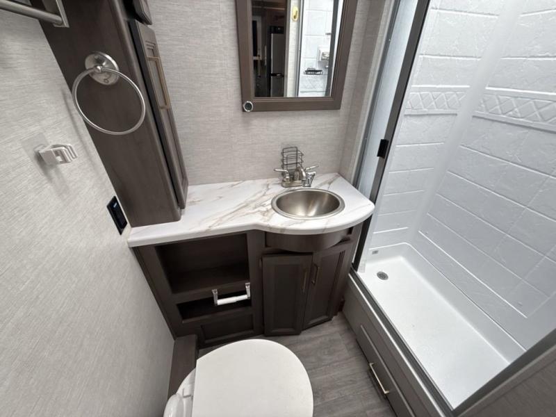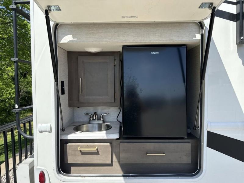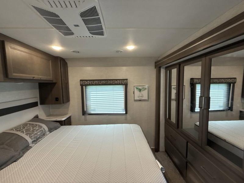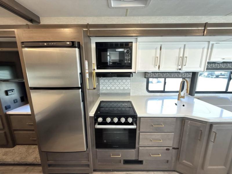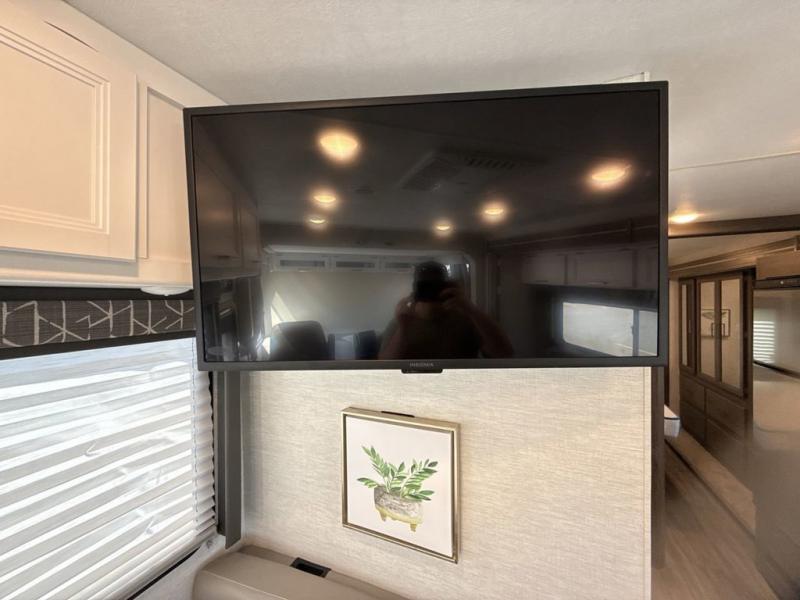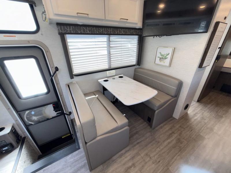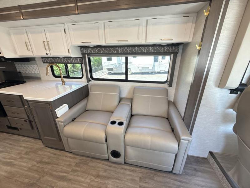 You will love how much space you have in this motorhome thanks to the full-wall slide! There is a jack-knife sofa and a Dream Dinette, or you can choose the optional theater seats in place of the sofa if you don't need the additional sleeping space. The chef of your group can prepare meals indoors on the three burner gas cooktop or in the microwave oven, plus there is an exterior kitchen with a refrigerator, a sink, and a 1000-watt inverter! The full bath will allow you to freshen up each day, and you'll feel right at home in the rear private bedroom with a king bed, a closet, plus a 32" TV!