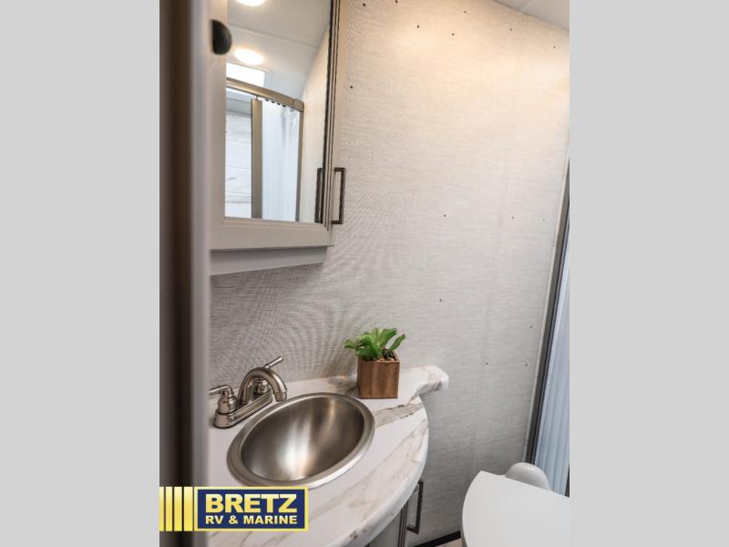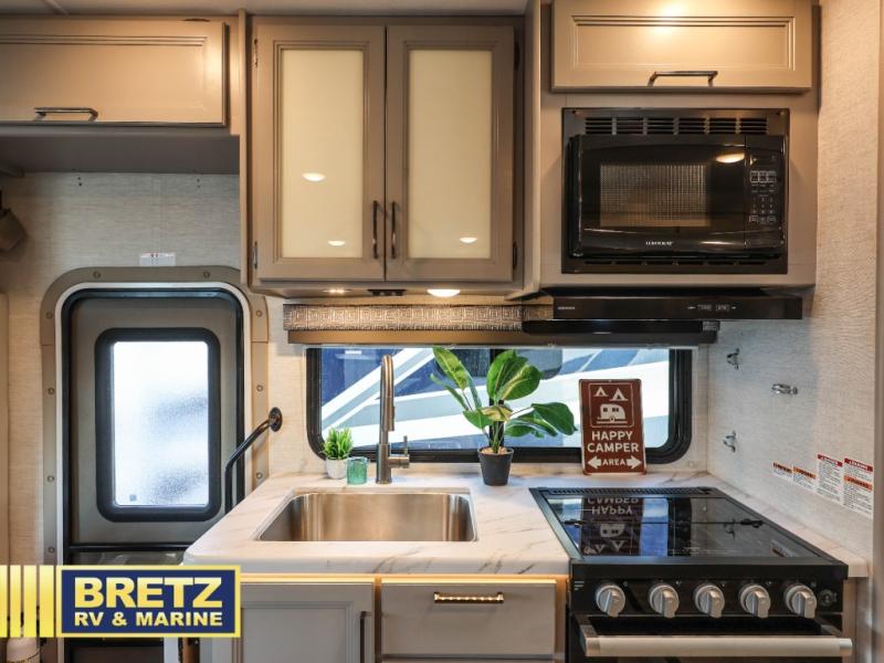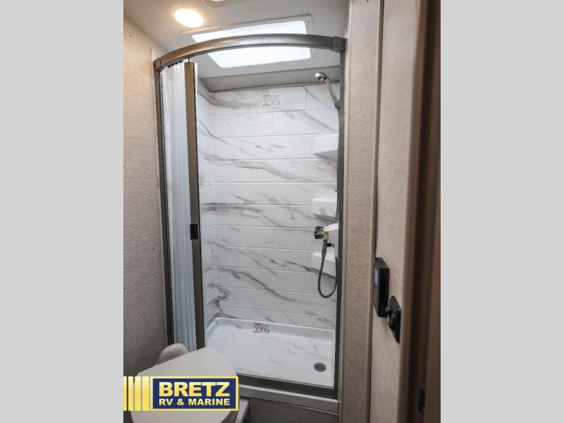 You will feel right at home traveling in this motorhome! After a long day being on the road, you can freshen up in the rear corner bathroom with the 24" x 36" shower that has a skylight above for more head space and natural lighting, plus robe hooks for added convenience. There are two closets to store your items, a pantry for snacks, and a refrigerator for your perishables. The 76" Dream Dinette is not only great for enjoying meals and playing card games, but also for transforming into an extra sleeping space. Speaking of sleeping, you also have a 60" x 74" queen bed slide to lay your head on and a 52" x 96" bunk over cab!
