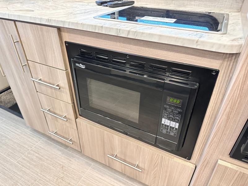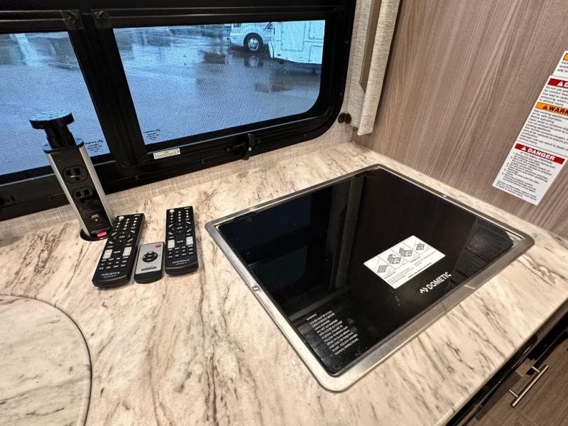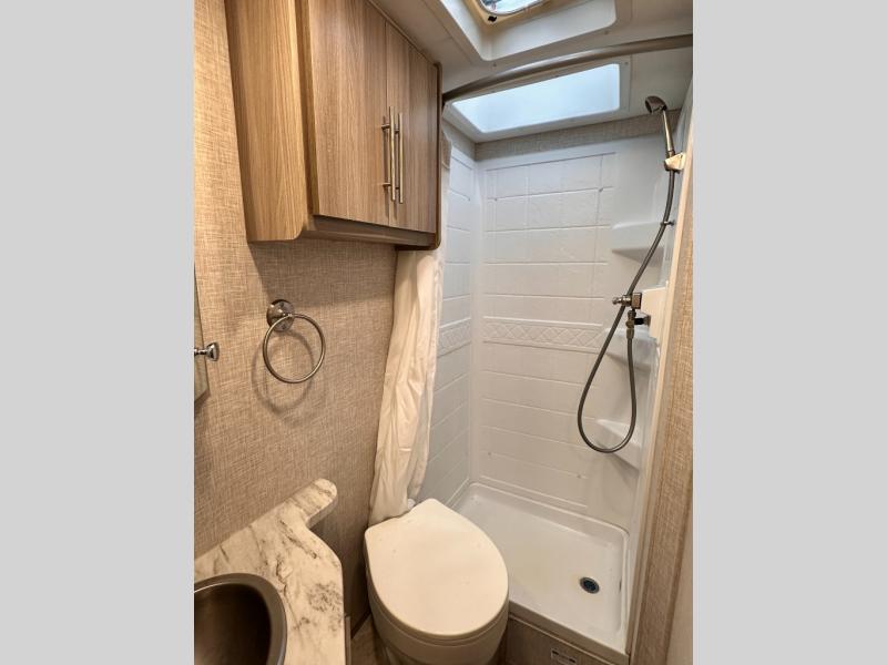 You can tour a local winery or trek up north to find a cozy and secluded camping spot with this Compass AWD Class B+ gas motorhome! All of your needs will be met with the excellent features and amenities included on this coach, like the full bathroom complete with a 24" x 32" shower, three robe hooks, a shower skylight, a foot-flush toilet, and a power bath vent. The kitchen is ready to help you make mobile meals, and the 68" Dream Dinette is the perfect place for eating those meals or playing a game later on. At the dinette table top, you'll find a wireless phone charger with USB plug so that you can charge your phones. There is a privacy curtain that sections off the flip-up RV queen bed, and you'll also find a 32" TV in the bedroom. The second 32" TV is located out in the main living area for everyone else to watch.