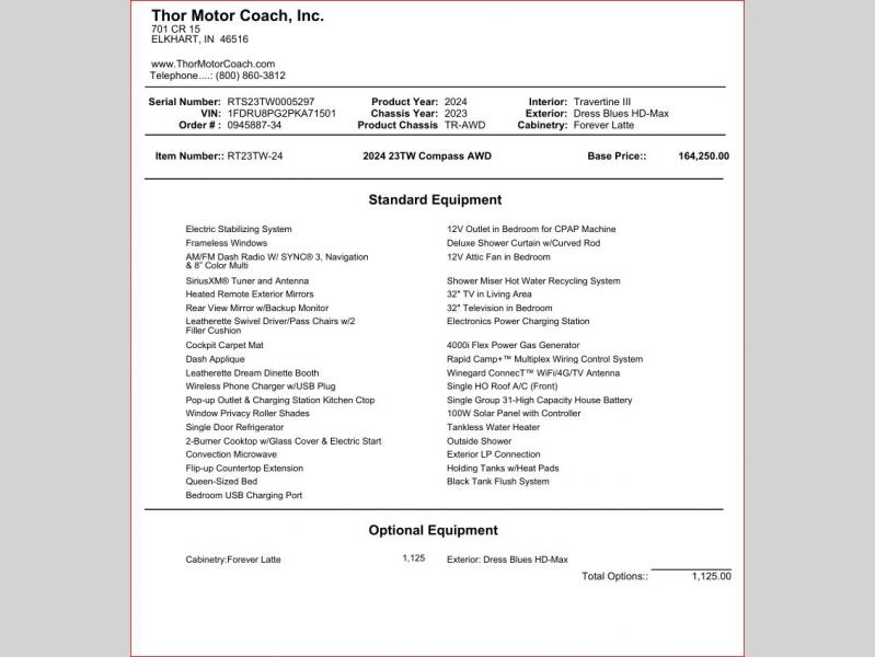 Used 2024 Thor Motor Coach Compass AWD 23TW V6 Gas Lg Slide Out Motor Home Class B+