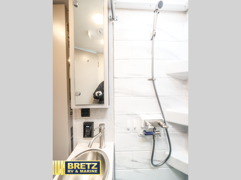 The perfect coach for two whether you are a couple or not! This Compass AWD model features a set of twin beds that can easily convert to a king bed if you like. Enjoy the added space thanks to a slide out jack-knife sofa with removable pedestal table. This table is handy for dining when you are stopped. You will appreciate the kitchen amenities for light meals and snacks while on the road, plus the onboard bath offers a 27" x 27" radius shower, toilet, and sink which is convenient as well. There are also two 32" TVs in this coach, one over the side entry opposite the seating in front, and one back in the sleeping area at the foot of the roadside twin bed. A built-in skylight offers the ability to stargaze in the front of the coach on a clear night.