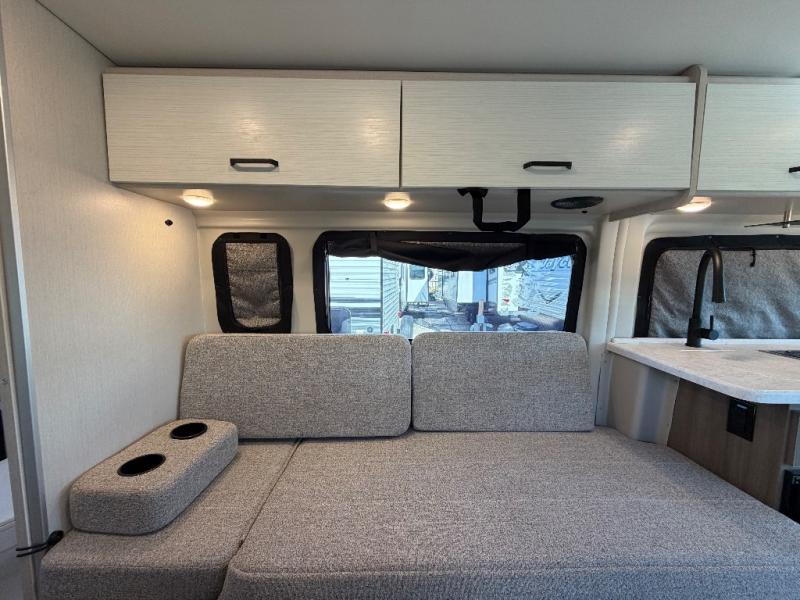 This Thor Motor Coach Dazzle includes a wet bath located all the way to the rear so you have more living space up front. The kitchen is just behind the cockpit swivel chairs, with a single door 12V refrigerator, two burner cooktop, and stainless steel sink. Towards the back are two twin beds that serve as seating areas during the day, and at night they can be converted to a king-size bed. There's also a removable dining table to enjoy all your meals. The fully enclosed rear wet bath features a shower and power vent. There's also an outdoor shower to keep things extra clean.