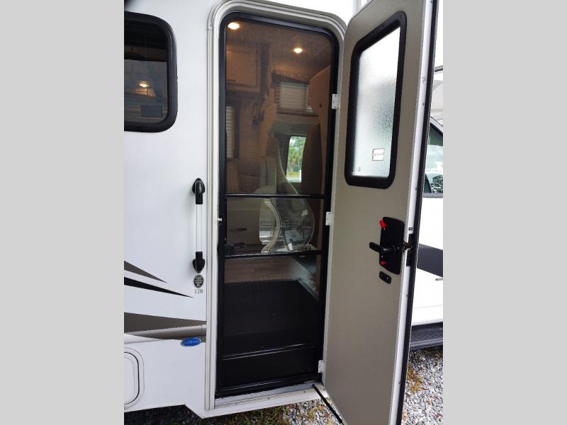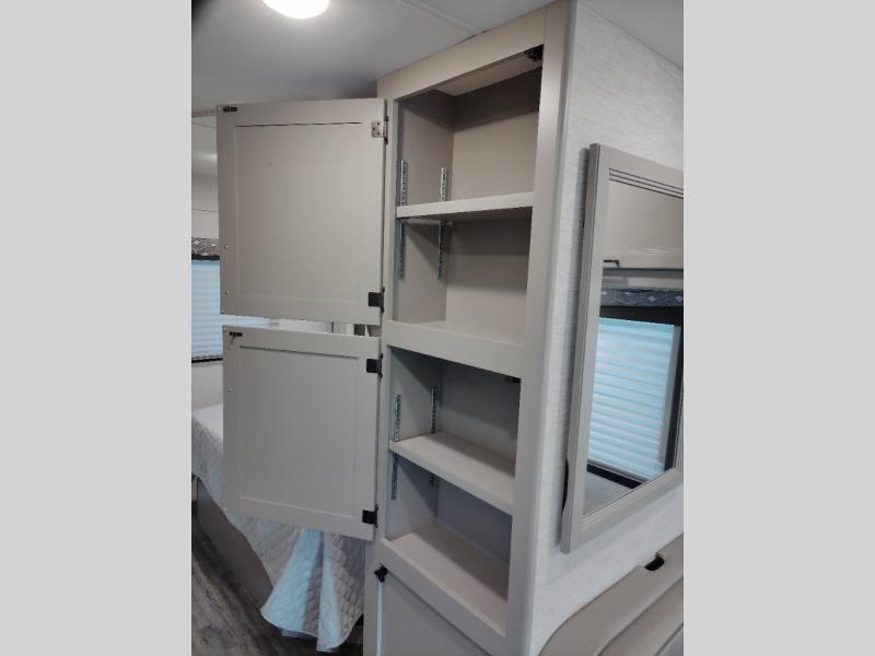 Easily head out for fun at a state park, the lake or your friend's ranch. This coach is easy to maneuver on the road or in town thanks to its compact size, yet has so many conveniences, you might not return home. The front cab over bunk is a perfect sleeping space for guests, the 39" Smart TV allows you to watch shows when you want some inside time, and the dream dinette gives you a place to dine and relax. The cook will love all the kitchen amenities at their fingertips, plus the flip-up countertop extension is super handy. The rear corner bedroom offers a queen bed slide for more floor space, a privacy curtain and a closet, plus the full bathroom is a few steps away. You can also choose to add the optional exterior 32" TV for outdoor fun!