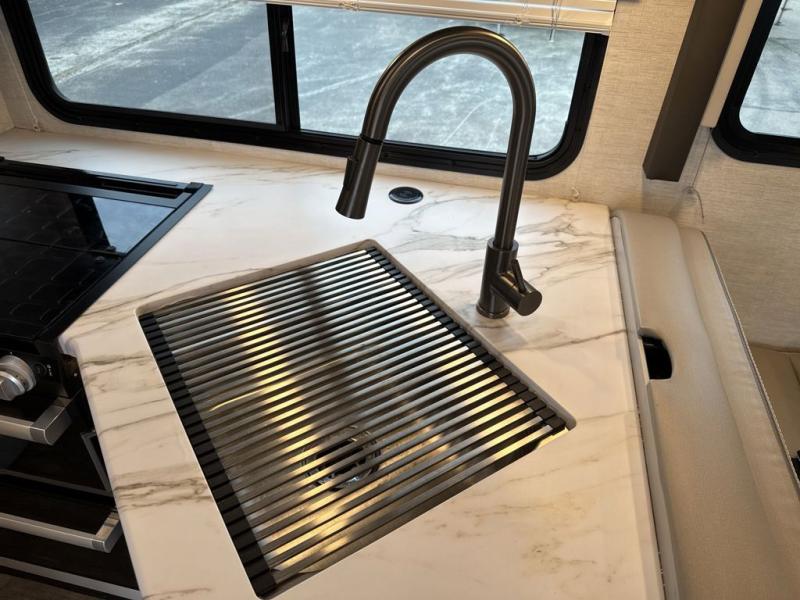 Perfect for a couple or a growing family, this coach will allow you to enjoy inside comforts and outdoor scenery where ever you drive and park! You will have great views out of the many windows when you are indoors, and the power awning offers an outdoor living area protected by the elements when you want some fresh air. The cook will love the large single bowl stainless steel sink with a single handle faucet with a pull-down sprayer when cleaning fruits and veggies, the gas cooktop and microwave when making meals, as well as the 12V refrigerator to hold all the cold items. The slide out creates even more floor space, the furniture offers a place to dine and visit as well as sleep, and the private bedroom with a full bathroom just steps away will complete the deal!