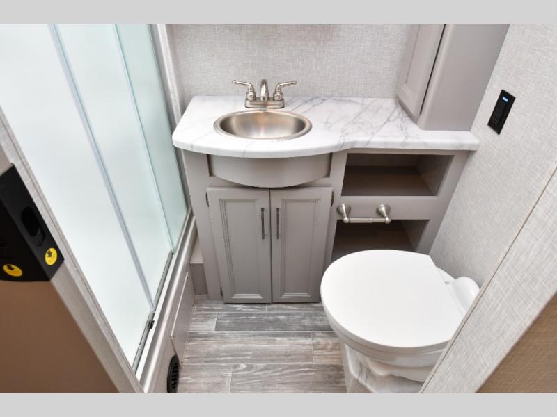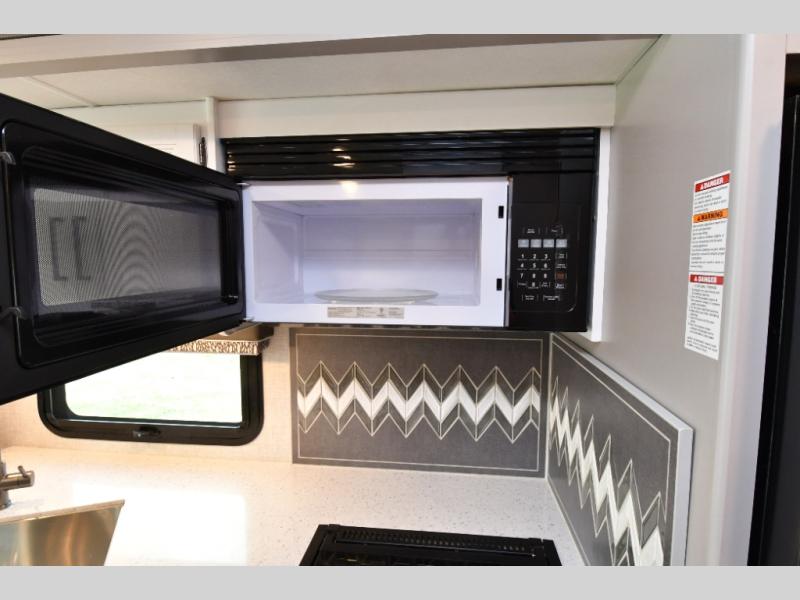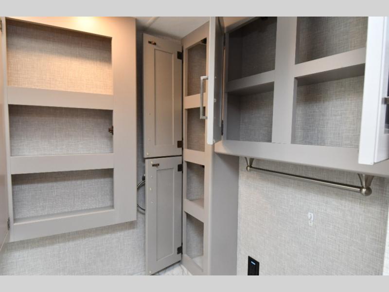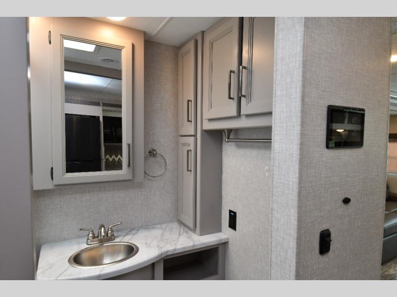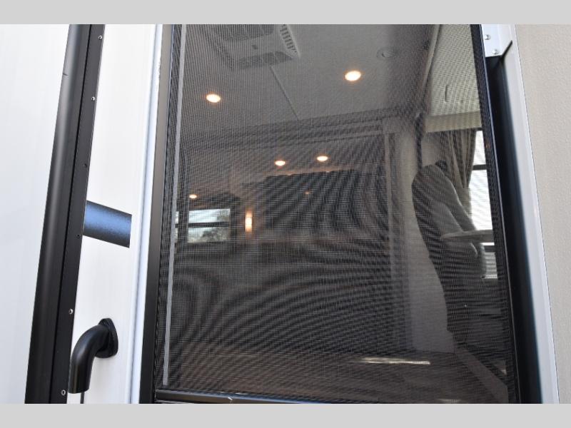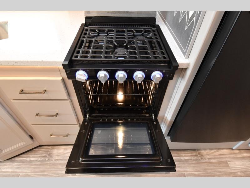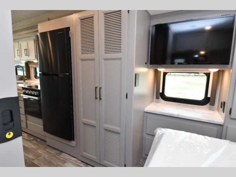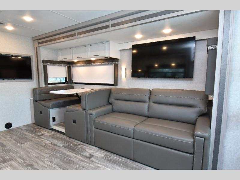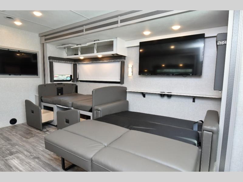 Inside, the full-wall slide transforms the living space into a bright, open gathering area perfect for relaxing after a day of exploring. Kick back in the theater seating with footrests, enjoy a movie on the 50" living area TV, or share meals at the Dream Dinette. The well-equipped galley makes cooking easy with a three-burner cooktop, 30" over-the-range microwave, and residential stainless double-door refrigerator. When it’s time to unwind, the rear master suite offers a king bed, private storage, and a 32" bedroom TV, while the drop-down overhead bunk with its own TV provides extra sleeping space for family or guests. Even outside, entertainment continues with the exterior 32" TV, perfect for tailgating or campground movie nights.