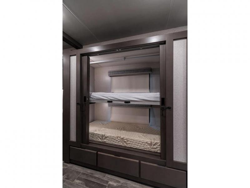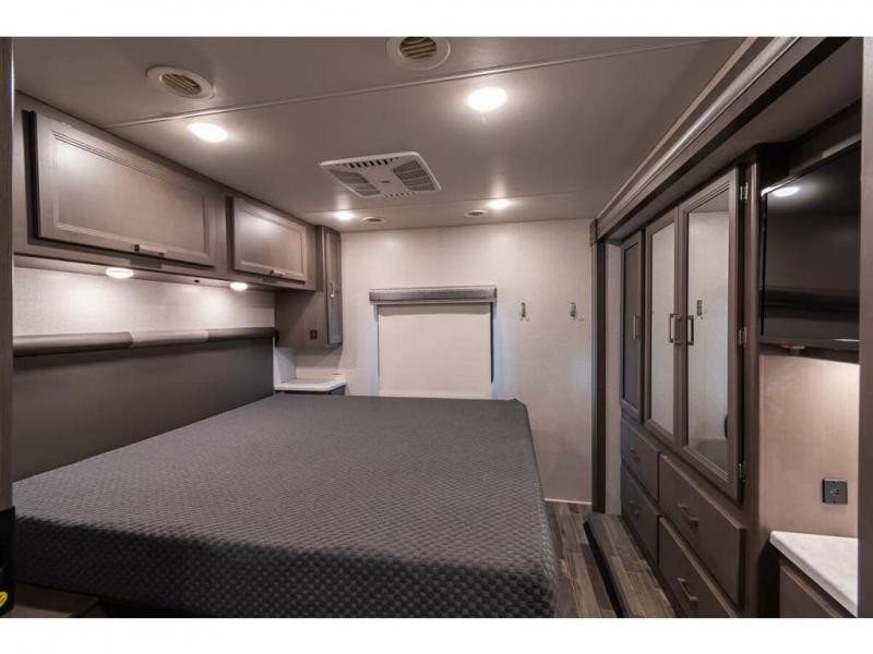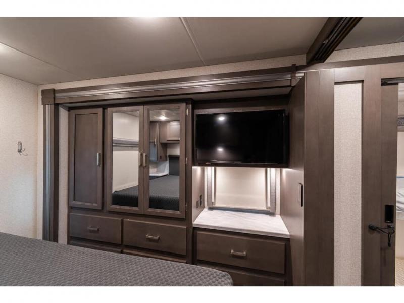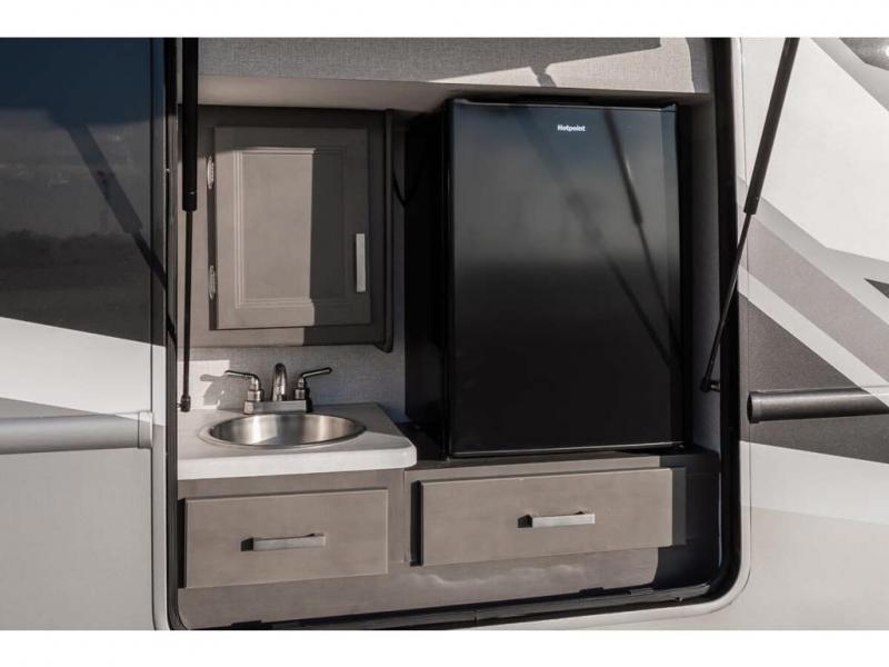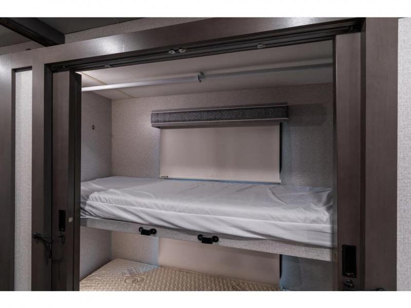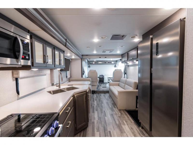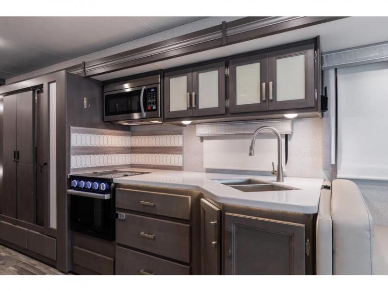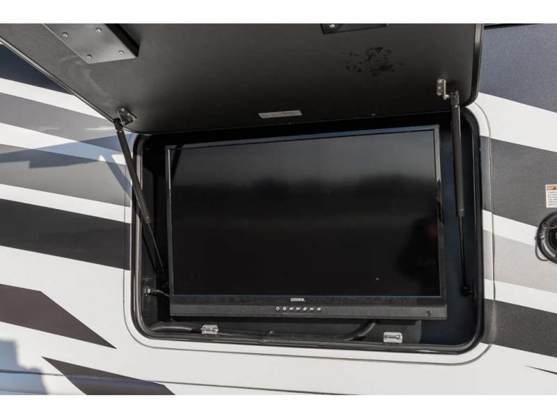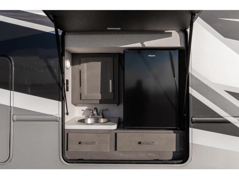 The Indigo BB35 Class A gas motorhome is super spacious featuring a full wall slide along the roadside and with the added pair of bunk beds increases the sleeping capacity to ten! A drop-down bunk over the cab has a 48" x 74" sleeping area, plus there's the dream dinette and a sofa bed in the living area. You will also love the rear master bedroom which features a spacious king bed and plenty of storage, plus a 32" TV above the dresser. A sliding door to the master conserves floor space so there's room to walk around the entire bed as well as having the closet and dresser as part of the full slide giving you a nice space to get away from it all. If you're thinking about feeding all those guests, no worries! Choose from the fully equipped kitchen with three-burner gas cooktop and oven, convection microwave and residential refrigerator, or step outside and cook in the fresh air at the exterior kitchen. You can even enjoy the 32" exterior TV while you're out there!