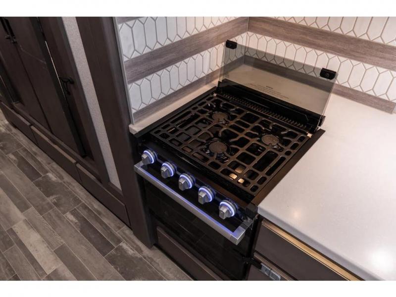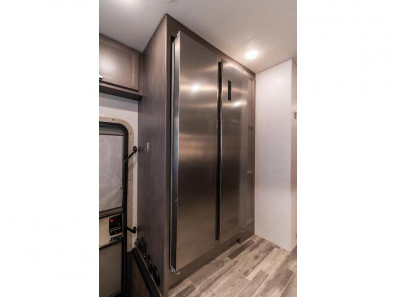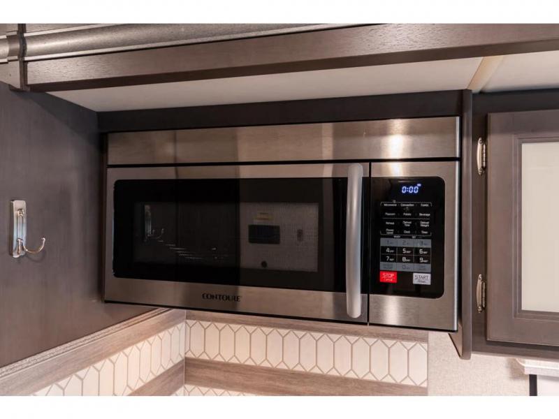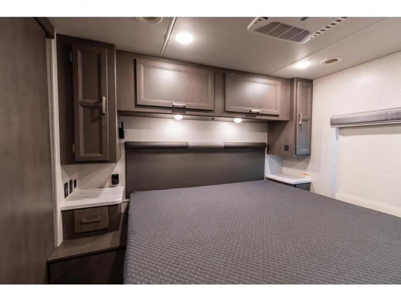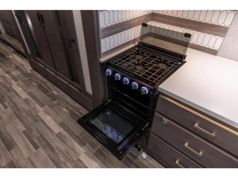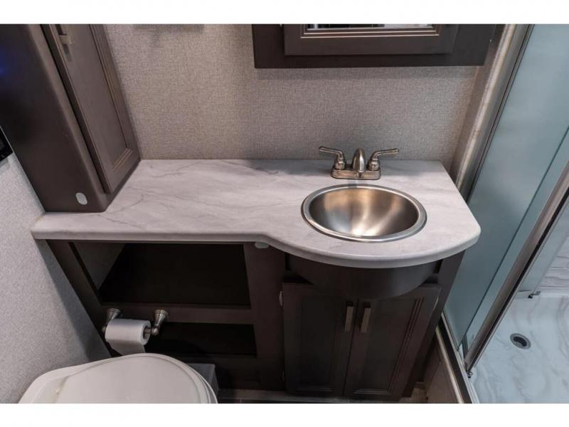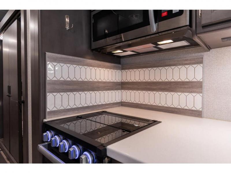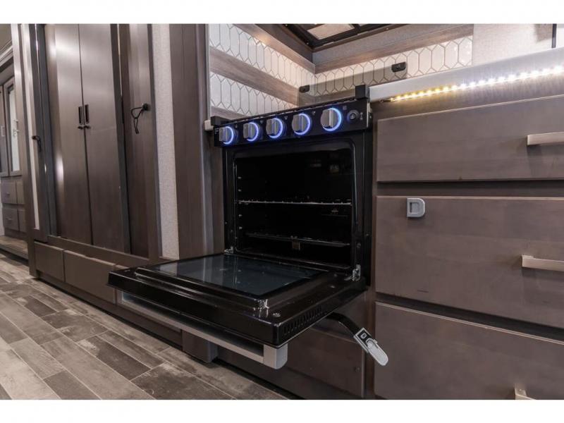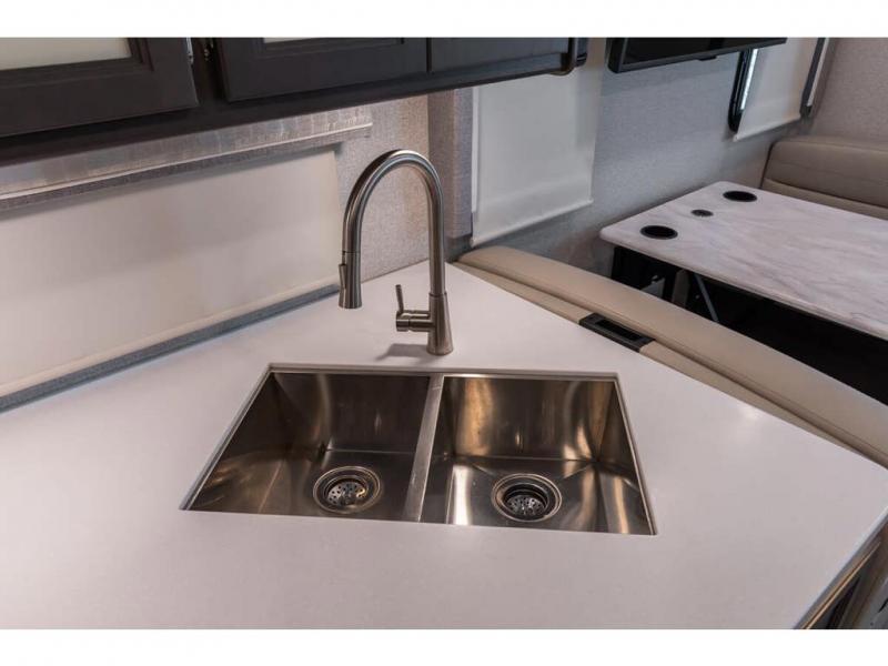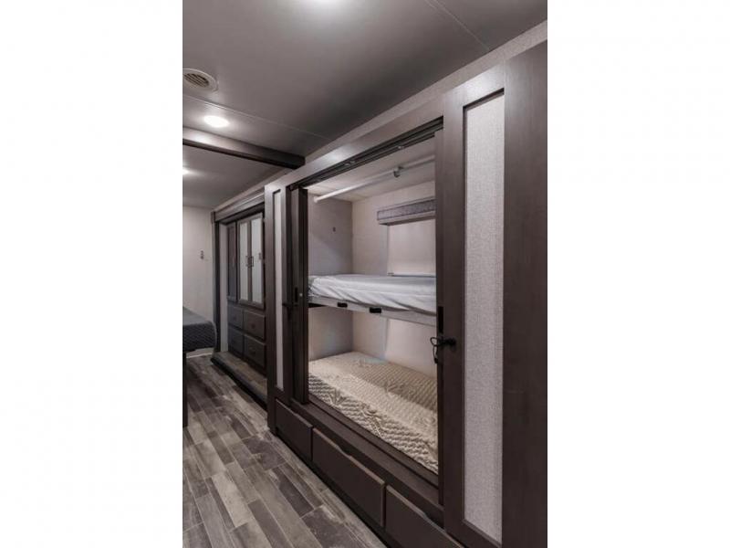 The Indigo BB35 Class A gas motorhome is super spacious featuring a full wall slide along the roadside and with the added pair of bunk beds increases the sleeping capacity to ten! A drop-down bunk over the cab has a 48" x 74" sleeping area, plus there's the dream dinette and a sofa bed in the living area. You will also love the rear master bedroom which features a spacious king bed and plenty of storage, plus a 32" TV above the dresser. A sliding door to the master conserves floor space so there's room to walk around the entire bed as well as having the closet and dresser as part of the full slide giving you a nice space to get away from it all. If you're thinking about feeding all those guests, no worries! Choose from the fully equipped kitchen with three-burner gas cooktop and oven, convection microwave and residential refrigerator, or step outside and cook in the fresh air at the exterior kitchen. You can even enjoy the 32" exterior TV while you're out there!