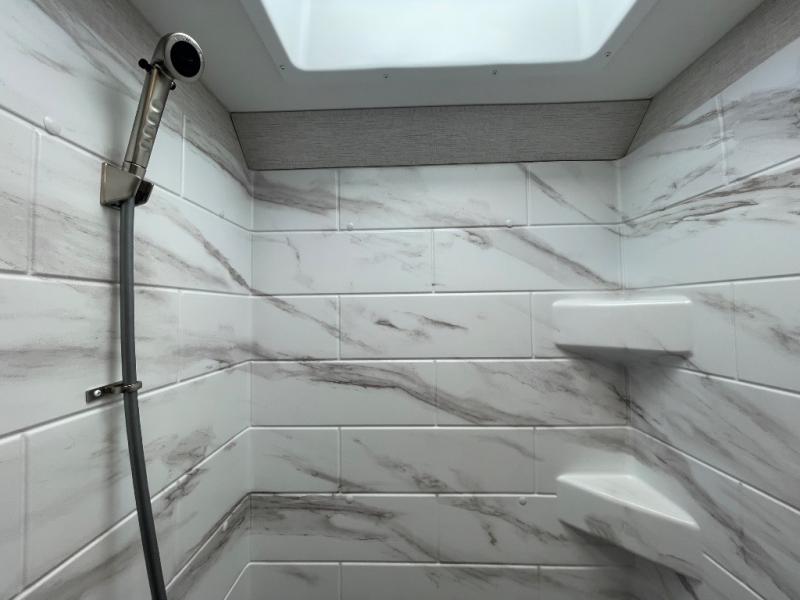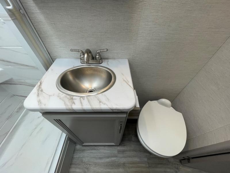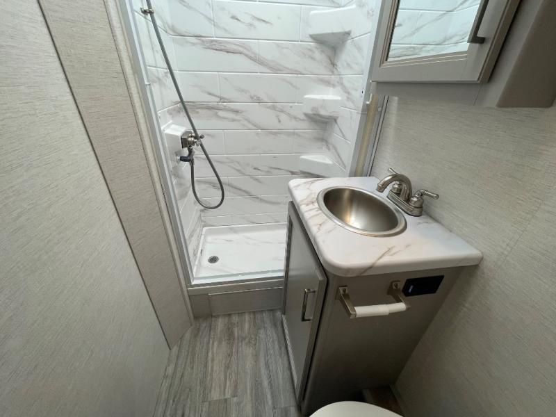 Simple and to the point, this coach is ready for fun vacations across the states. Waking up each morning on your own full-sized bed will feel just like home, and there is a cab-over bunk with a built-in skylight for the little ones. You can make breakfast on the three burner cooktop, and the milk and eggs can go back in the 12V refrigerator. There is also a flip-up countertop here for more prep space, and when the food is done, you can dine at the booth dinette. Before you head out for the day, freshen up in the full bath that includes a shower skylight, robe hook(s), plus a shower upgrade with a shower curtain. This unit is also available with a Chevy chassis if you choose.