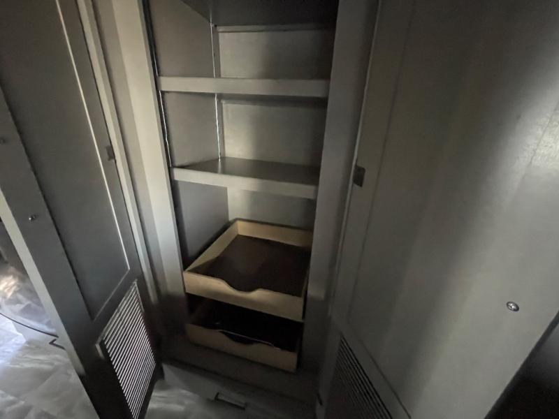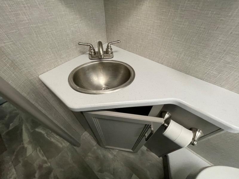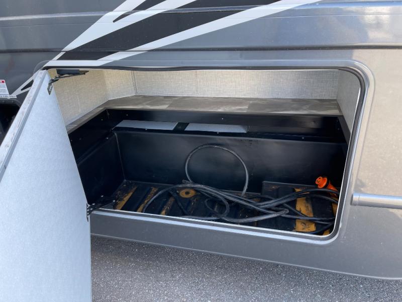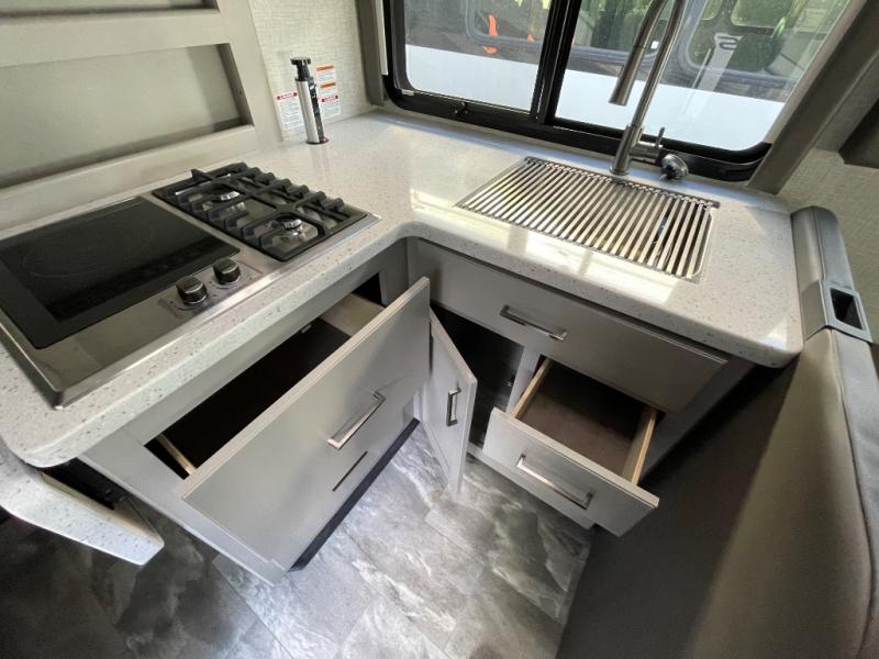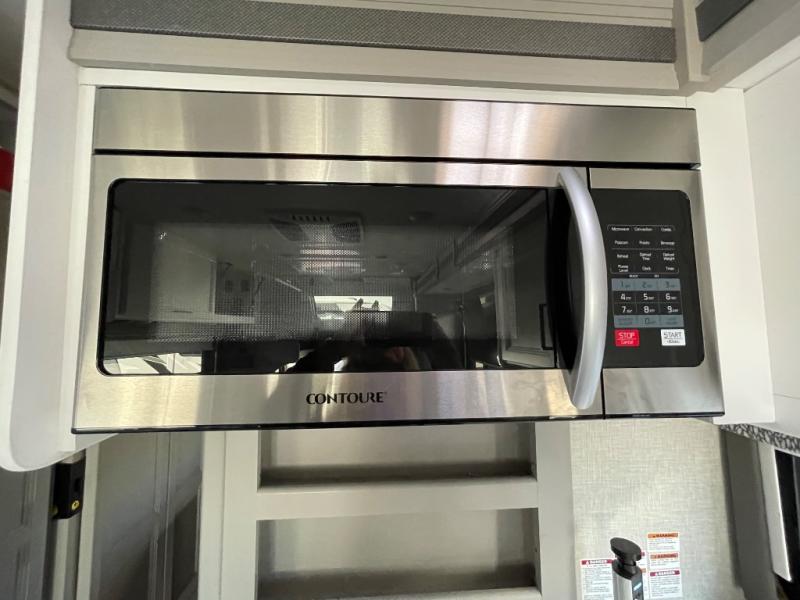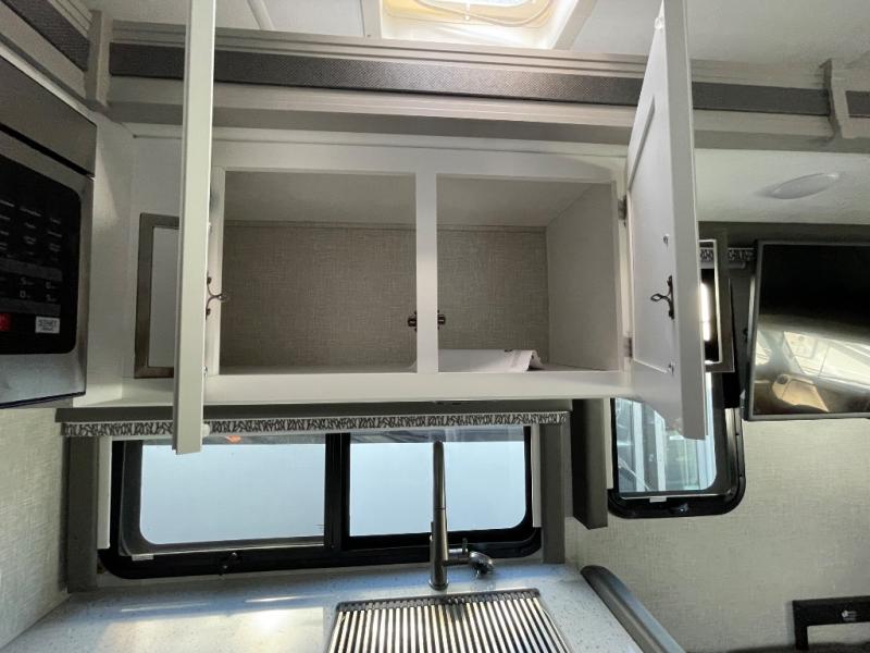 You're going to love this coach with a rear corner bedroom and easy access to the full bath. There is a privacy curtain to close off the bedroom if you're traveling with guests, and the full bath will let you clean up each day. The mid-coach entry gets you inside quickly with easy access to the refrigerator or the jack-knife sofa, and the slide out in this area offers a 70" Dream dinette and an L-shaped counter. There is also a microwave overhead and a stainless steel sink plus flip-up countertop extension for more prepping space when cooking. The kids or your guests can sleep on the cab-over bunk or any furniture once converted. The built-in skylight over the cab will be great for added light from the moon at night or sun during the day. And the exterior offers a 32" TV to enjoy while outdoors.