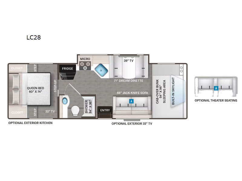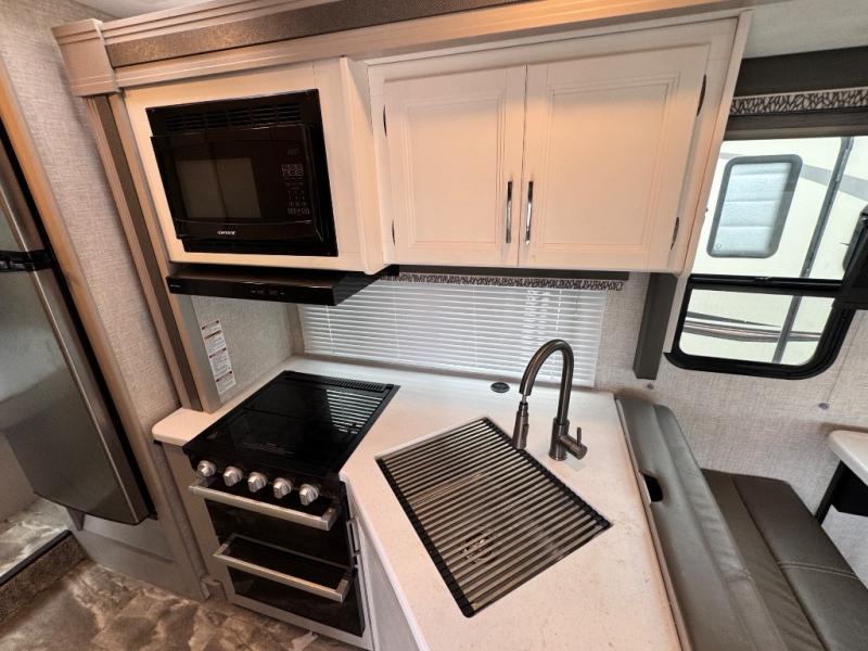 This coach features a rear private bedroom with a queen bed for that at-home feeling. You will enjoy having your own 32" TV, plus closets on either side of the bed for your clothes. The full bath includes a power bath vent, a shower skylight, plus a foot flush toilet for convenience. The chef of your group can whip up a hearty meal on the three burner cooktop, or you can choose the optional exterior kitchen if they like to cook outdoors. The main living area will be a favorite play to visit with its large slide out, leatherette Dream Dinette, and 39" Smart TV.