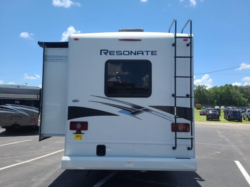 With any Resonate Class A gas motorhome by Thor Motor Coach you will find solid construction materials, including a one-piece fiberglass front cap, a welded tubular steel floor, and block foam insulation to enjoy camping all year long. The Ford F-53 chassis is ultra durable for many trips across the country, and the automatic leveling jacks with touchpad controls make setting up camp easier than ever. You will also love the rotocast storage compartments for all your gear, plus an HD-MAX exterior and framed windows for a more sleek look. The interior of each Resonate coach is warm and inviting with its residential vinyl flooring, flat panel cabinetry, and 7' interior ceiling height, and there are solid surface countertops the chef of your group is sure to love. An Onan RV QG 4000 gas generator also comes standard, along with dual 13,500 BTU roof A/C's, and a Winegard ConnecT WiFi extender + 4G to keep you connected to the outside world as you travel.