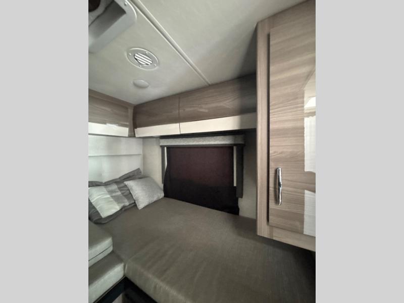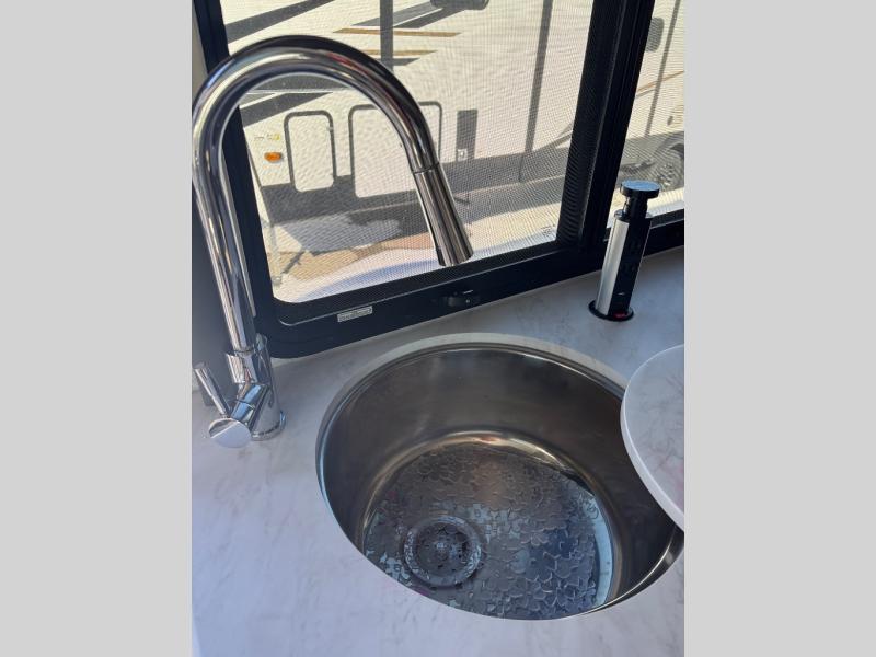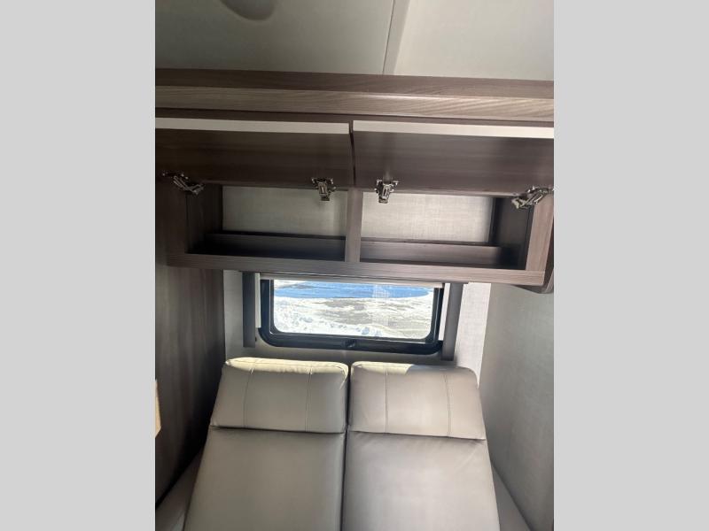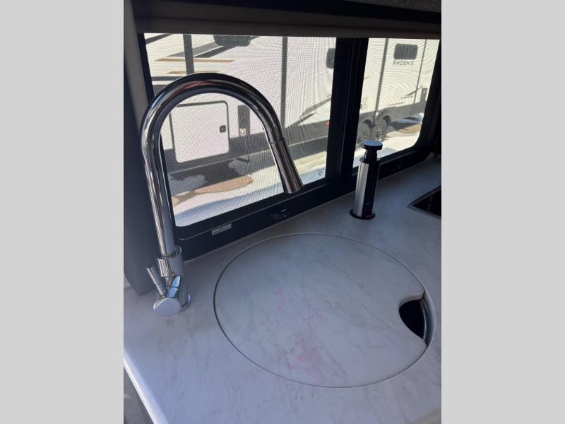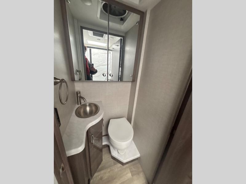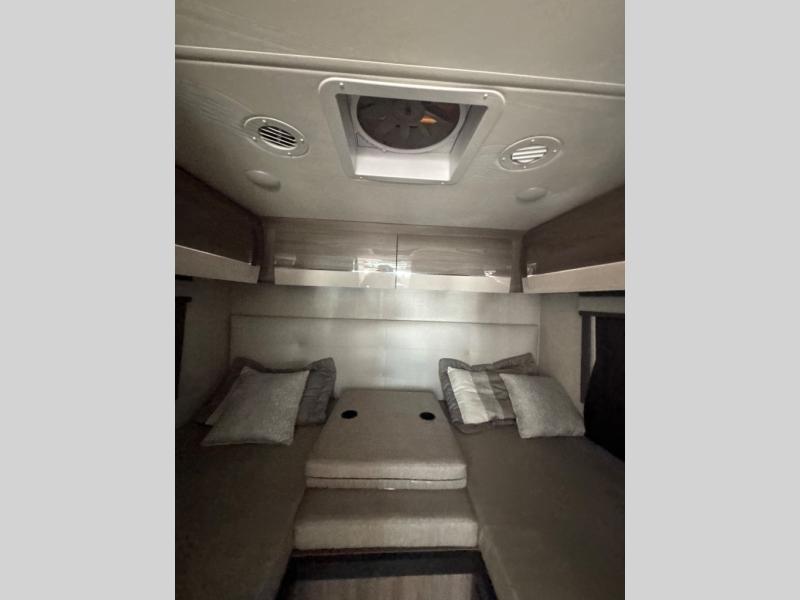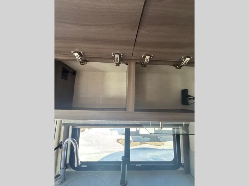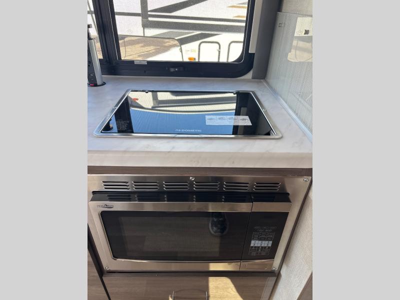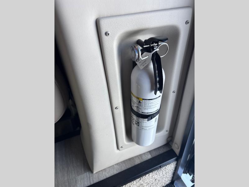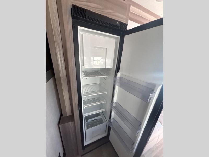 Enjoy a relaxing road trip in this motorhome! There are lots of conveniences in the kitchen. You'll find a 12V refrigerator with auto generator start, pressed laminate countertops with an under-mounted sink that has a sink cover, a two-burner gas cooktop with a glass cover and electric start, a convection microwave with an air fryer, and a large stainless steel single-bowl sink and faucet with pull-down sprayer. The separated bathroom is also accommodating, and it features a skylight above the 24" x 32" shower with curved anti-microbial shower curtain across from a private foot-flush toilet and sink. The rear 31" x 76" twin beds can convert into a king bed with closets at the foot of the beds and a privacy curtain to draw for a comfortable night's rest!