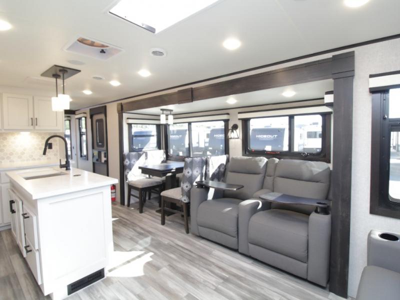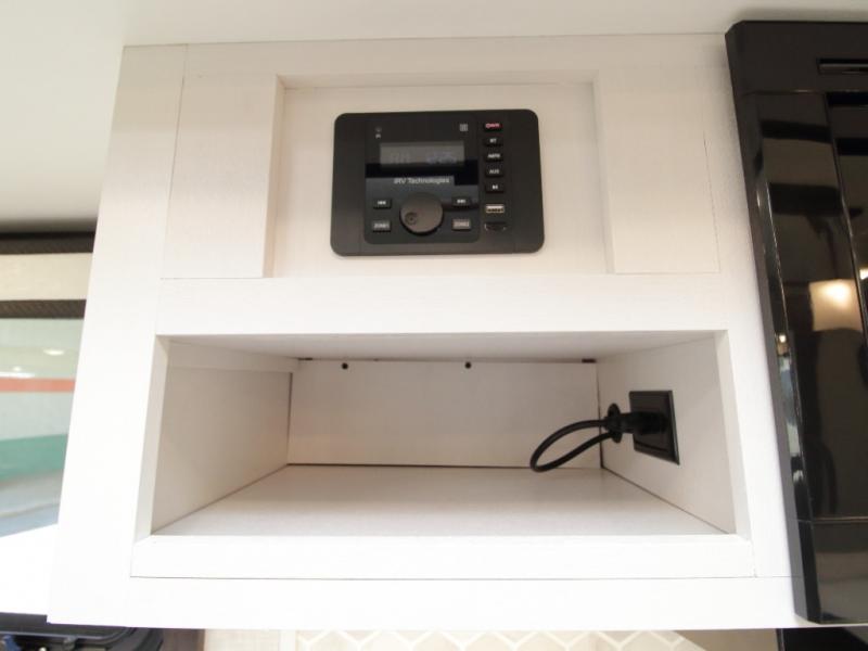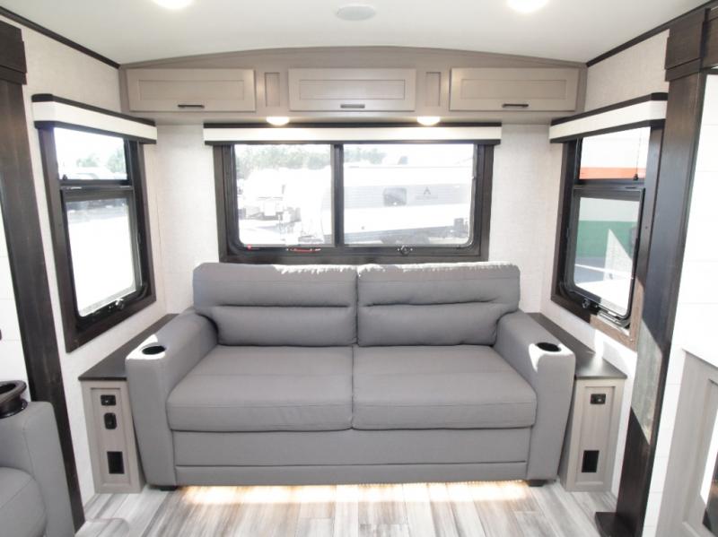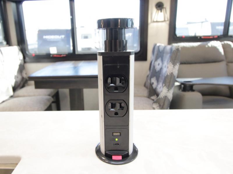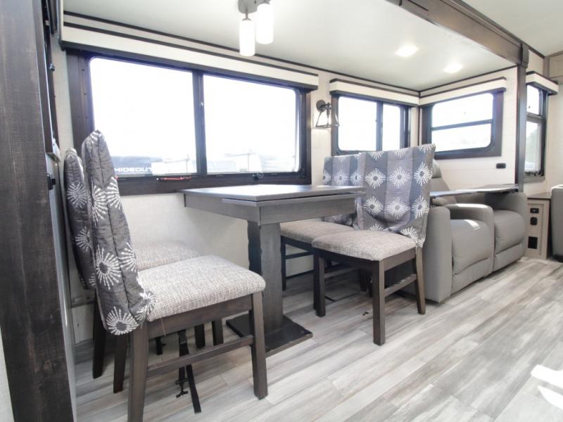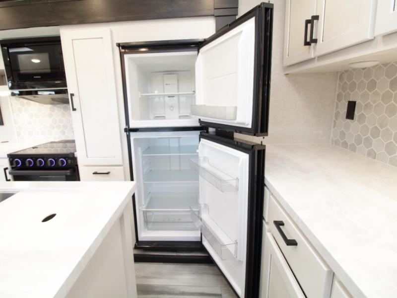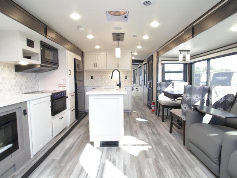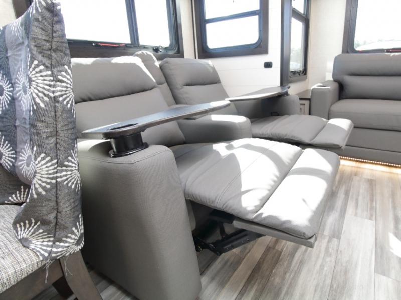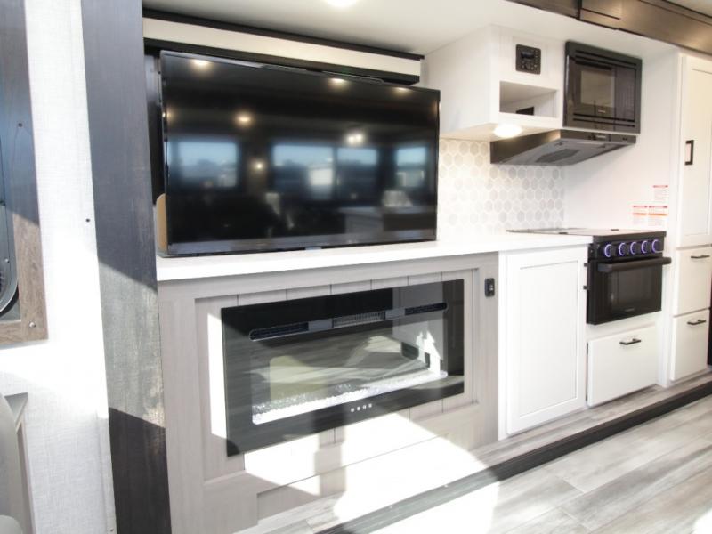 Thanks to opposing slides, the main living area feels spacious and inviting. Relax in the theater seating with table trays, enjoy meals at the kitchen island, or unwind by the fireplace while watching a favorite movie on the LED Smart TV. The well-equipped kitchen offers abundant counter space and a pantry to store dry goods and snacks.