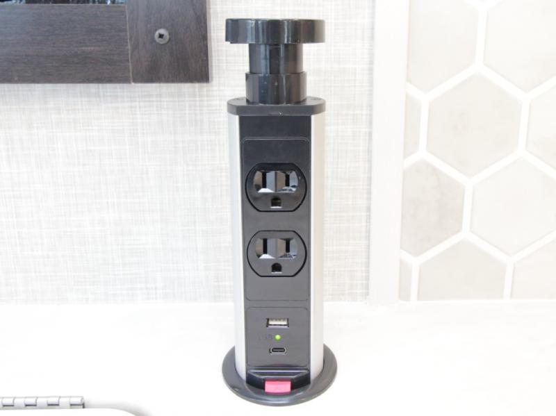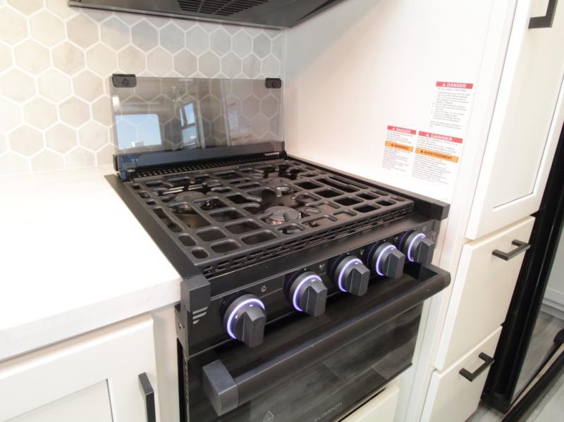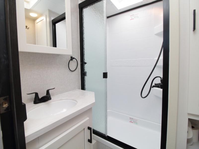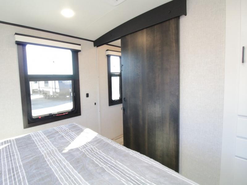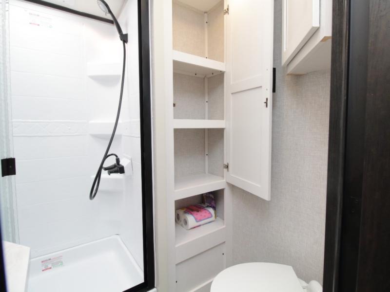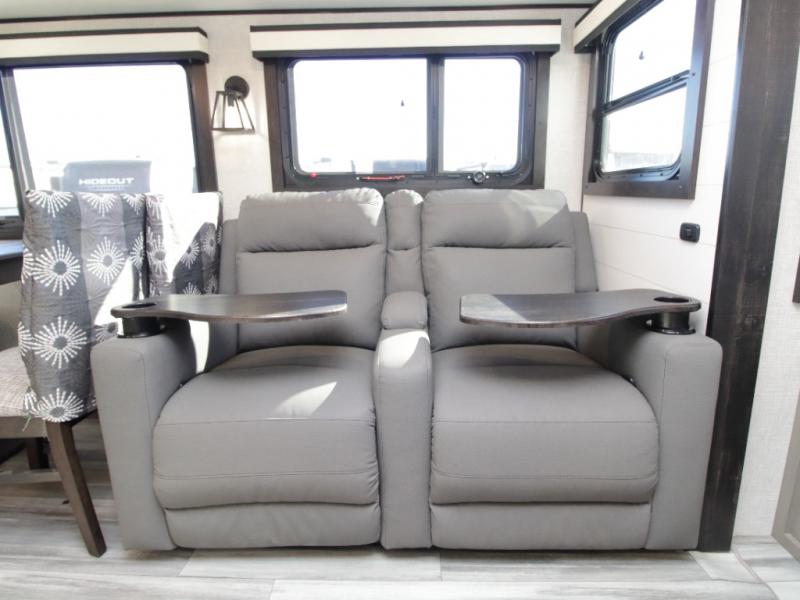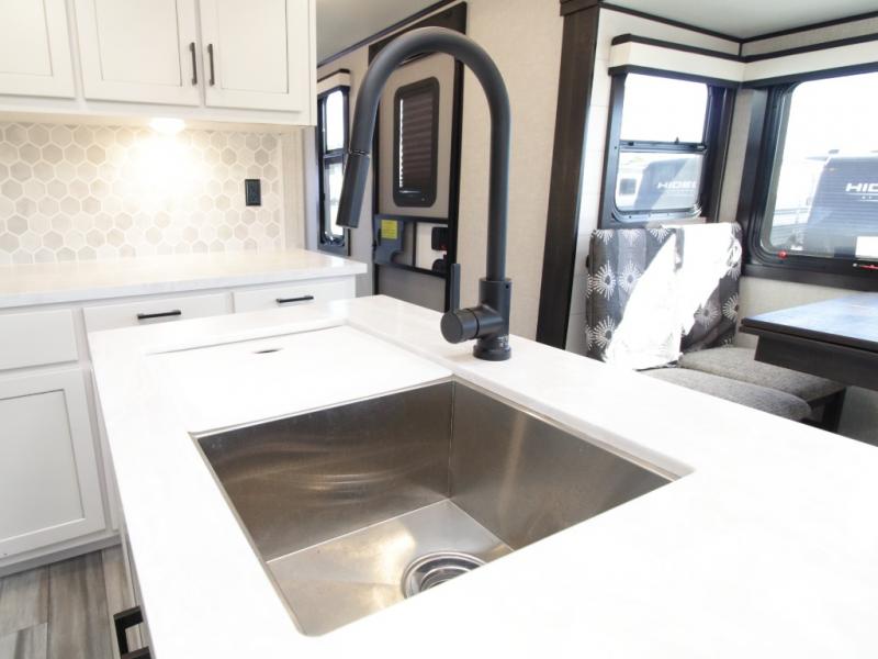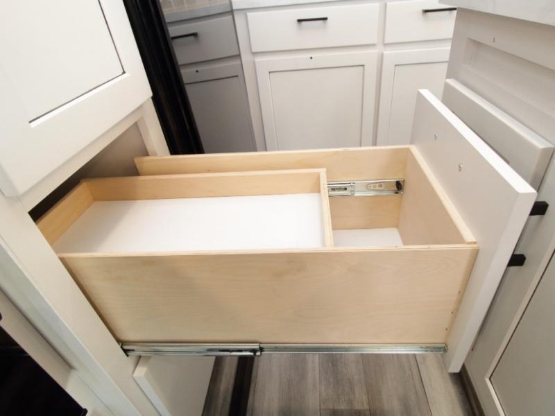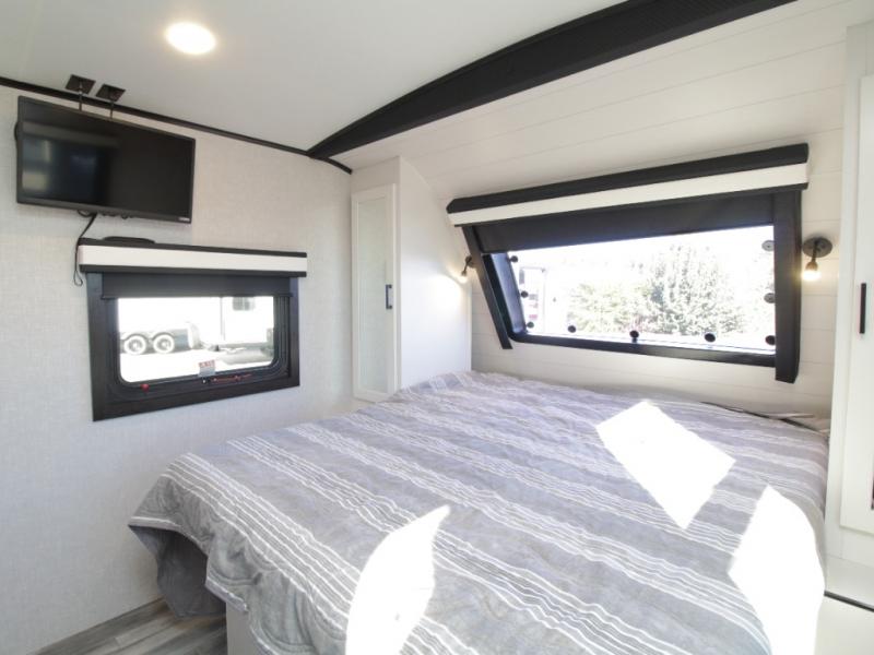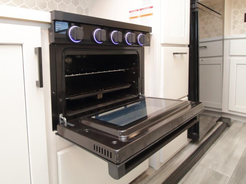 Thanks to opposing slides, the main living area feels spacious and inviting. Relax in the theater seating with table trays, enjoy meals at the kitchen island, or unwind by the fireplace while watching a favorite movie on the LED Smart TV. The well-equipped kitchen offers abundant counter space and a pantry to store dry goods and snacks.