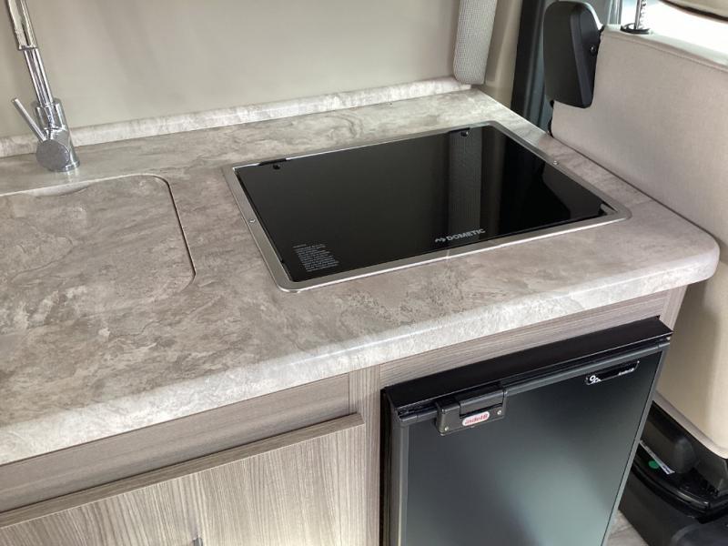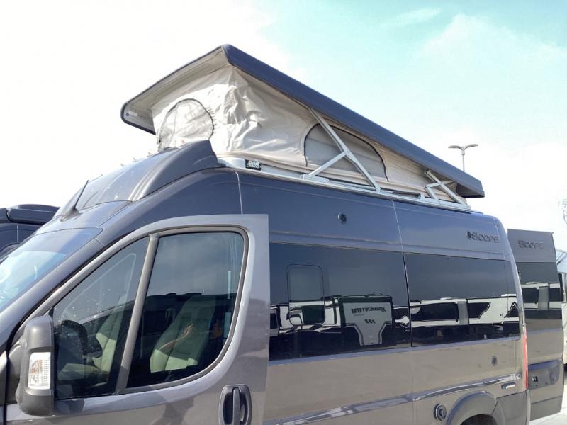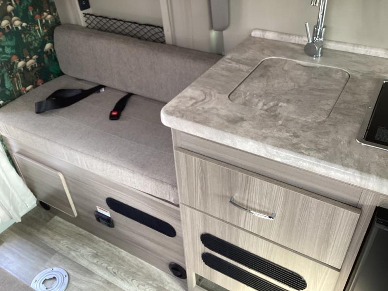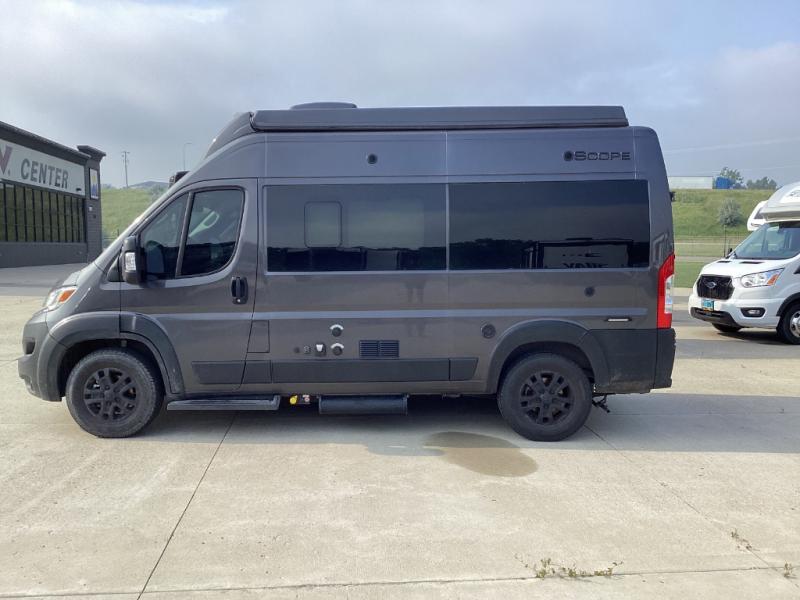 Get comfortable in this Scope Class B motorhome! The seating area includes an expanding sleeper sofa which converts to a roomy 44" x 70" bed. For additional guests, there's the option to add on the Sky Bunk™ with a retractable roof top. You'll have everything you need with the rear wet bath. The driving experience will delight you with swivel captain's chairs, touchscreen dash radio with Apple CarPlay™ & Android Auto™, keyless entry, and a telescoping steering wheel with audio buttons. You'll also appreciate the kitchen, which includes a two burner gas cooktop, microwave oven, and single door 12V electric refrigerator. The stainless steel double bowl sink includes a cover and single handle faucet for easy clean-up!