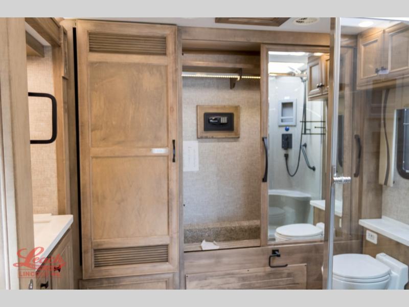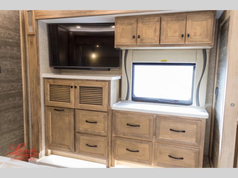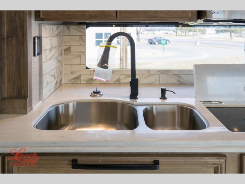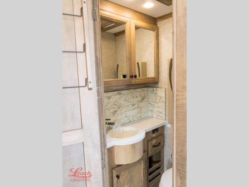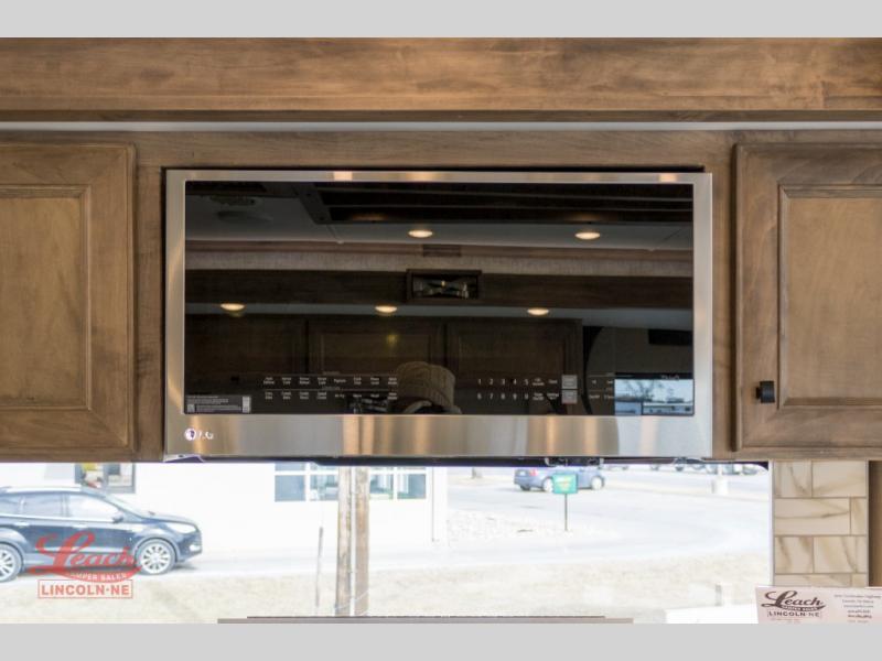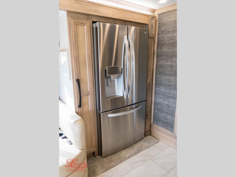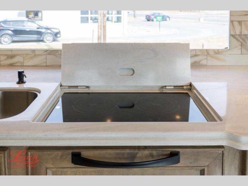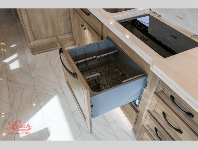 You will feel right at home in this coach with a master suite and king bed slide, mounted TV, laundry hamper, and staked drawers. You all have quick access to the full rear bathroom. The bathroom not only has a dual sink vanity with a tri-view mirror for two to get ready at once, but also a shower with a seat and a large closet with an area next to it prepped to add an optional washer and dryer. The chef can prepare their best meals either indoors with the Expand-An-Island and cooktop with convection microwave or outside if you add the optional outdoor grill. You can even watch the big game outside with the exterior TV with a sound bar!