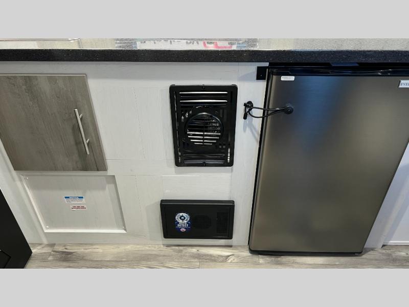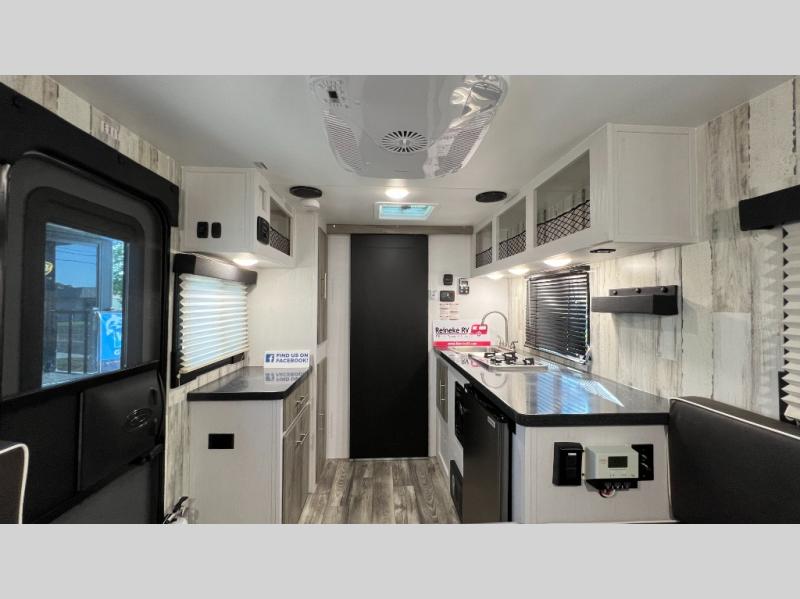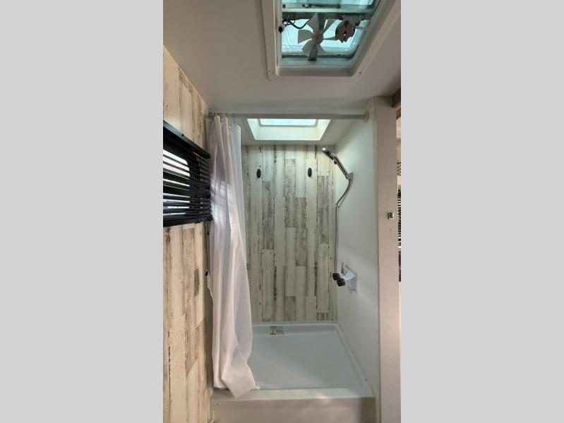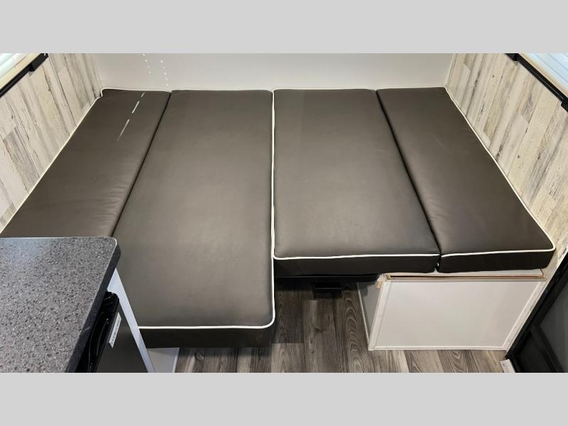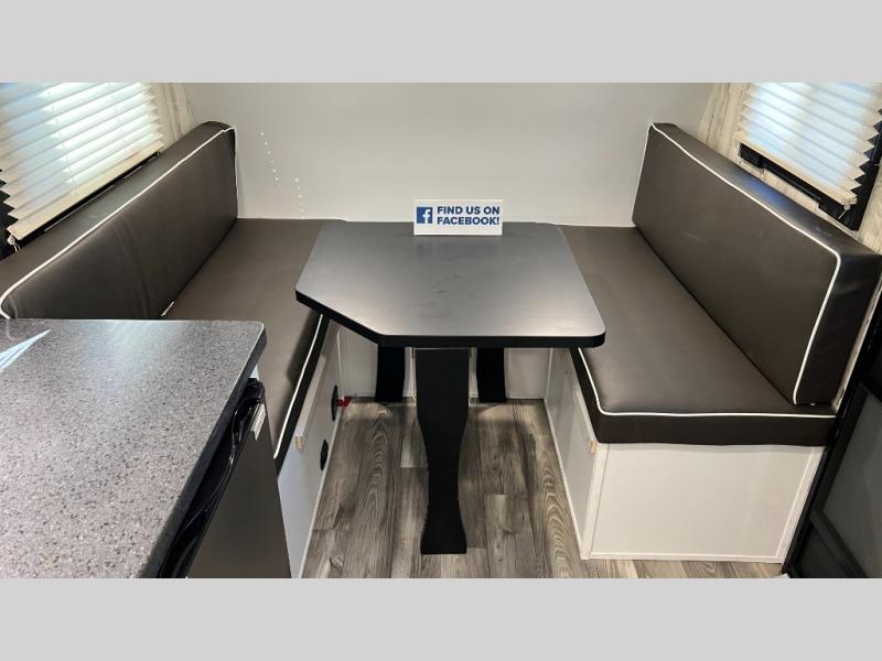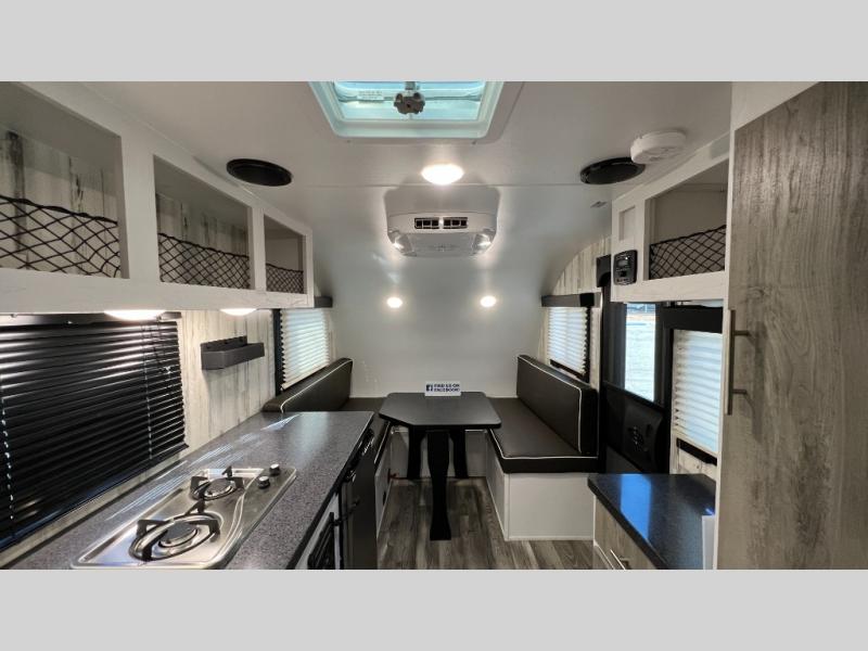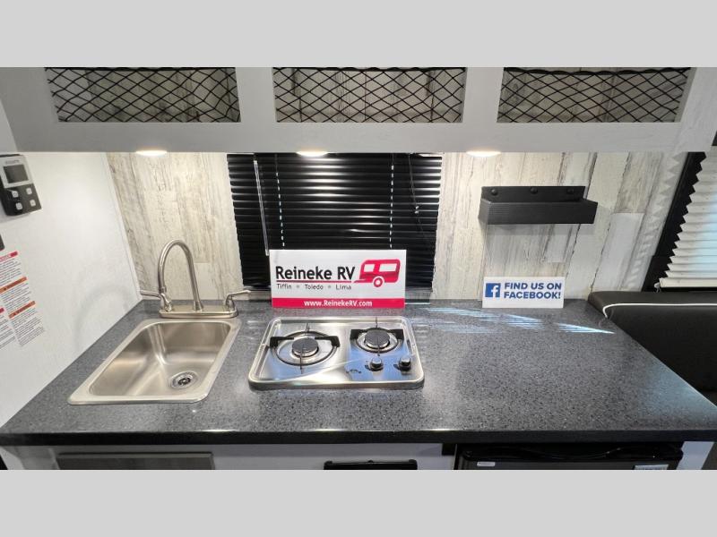 This Rove Lite can be the perfect couples adventure companion when you love the outdoors! This unit features a front booth dinette that transforms into a 54" x 74" bed to sleep on at night. There is also a full rear dry bath including a 24" x 36" shower and toilet with overhead storage for your towels and toiletries. A 13" x 15" sink is just outside the space saving sliding barn door for convenience. You will easily be able to whip up a meal or snacks with the two-burner cooktop, plenty of counter space, and a 3.3 cu. ft. refrigerator for your perishables. There is storage throughout the inside for your camping necessities with several overhead cabinets and a pantry. There is even an outside shower to rinse off before heading inside. This is great for your furry friend too!