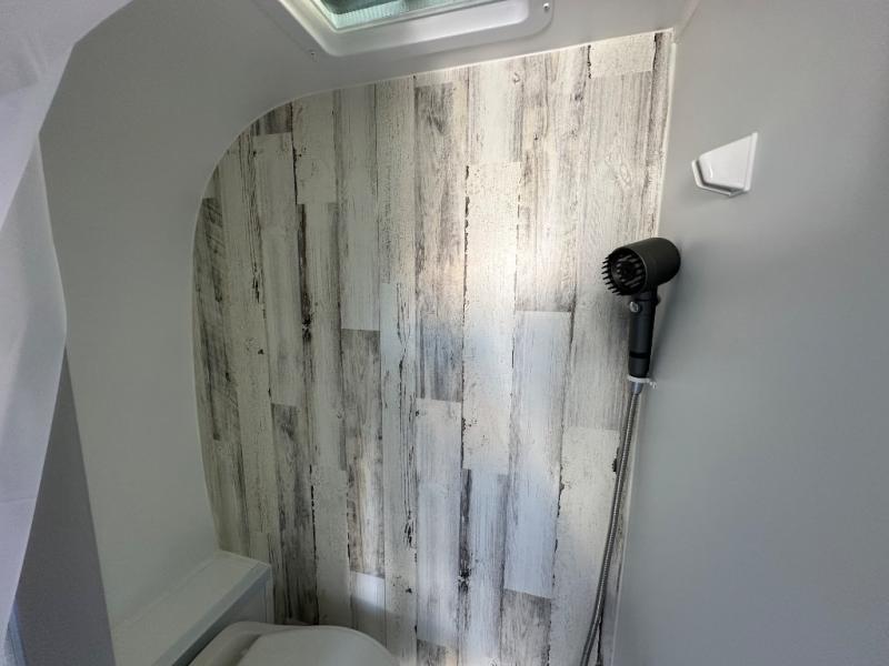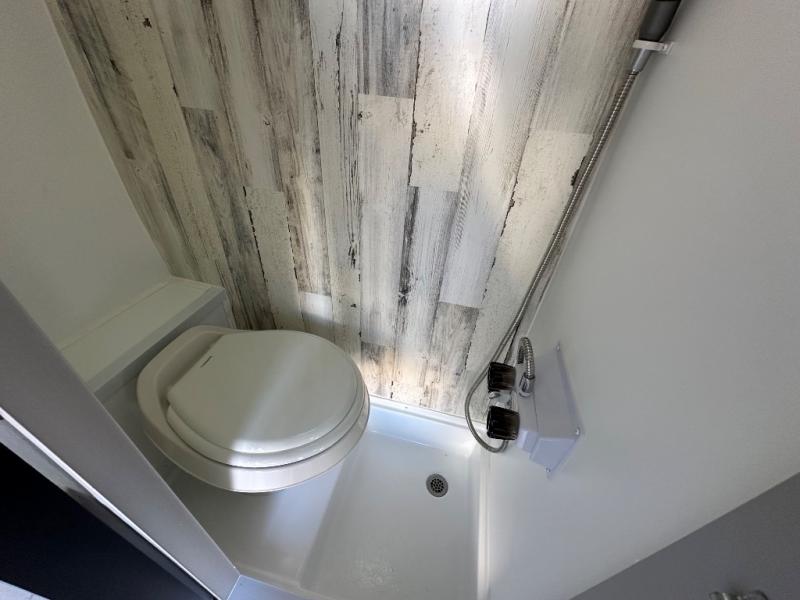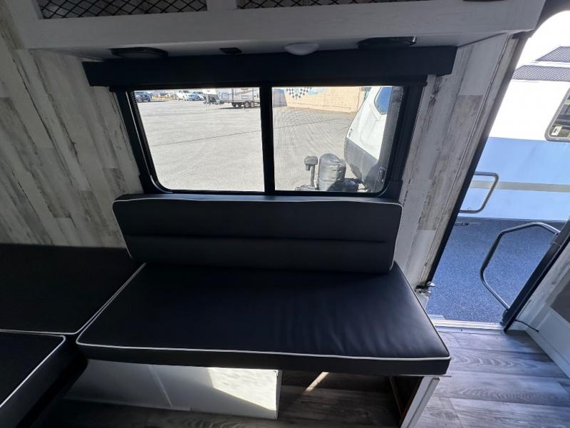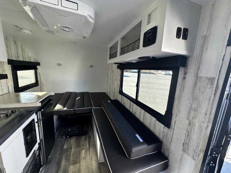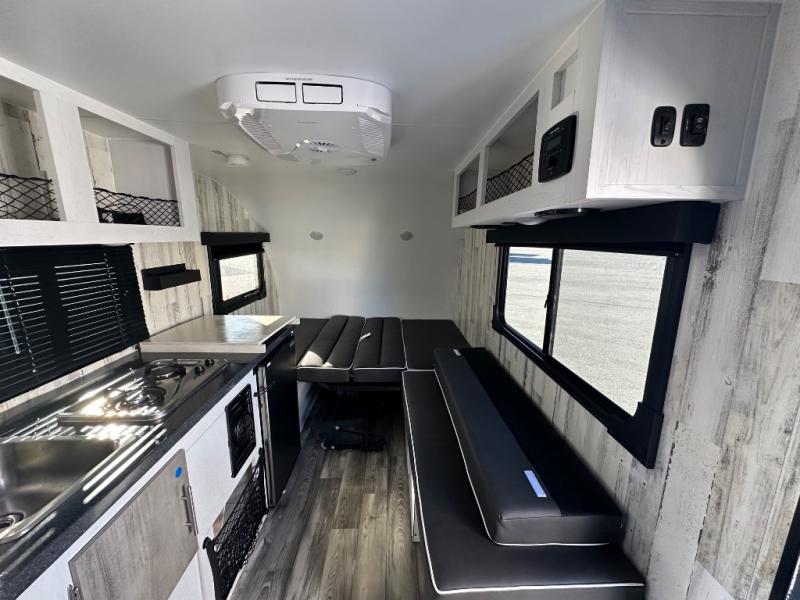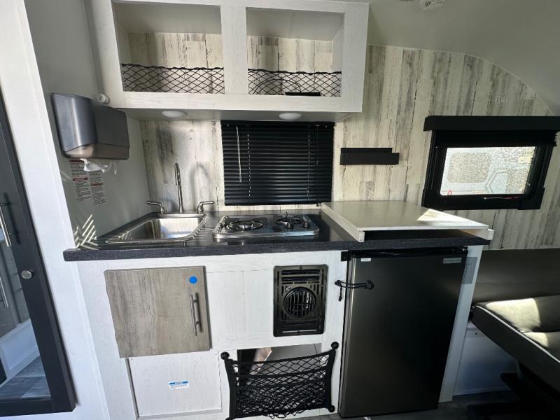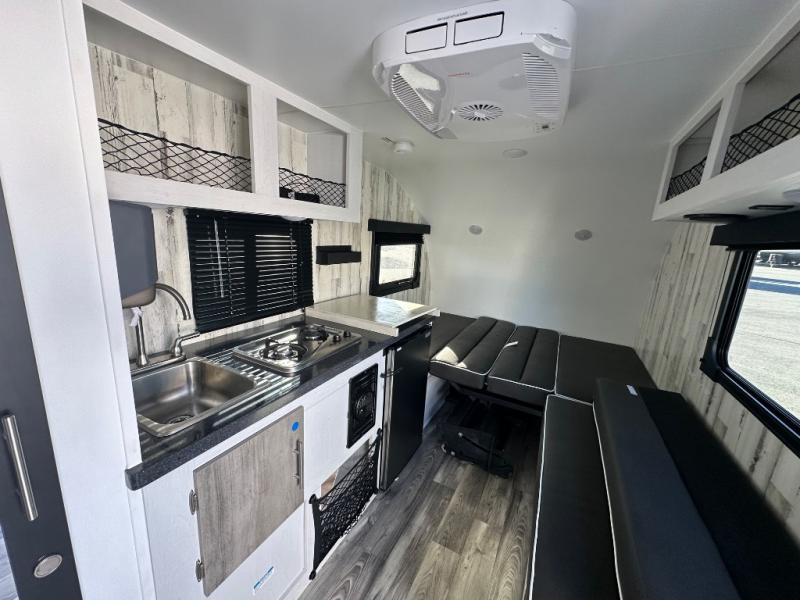You will have everything you need for a comfortable camping trip in this travel trailer! It features a front booth dinette that transforms into a 54" x 74" bed to sleep on at night. There is storage throughout the inside for your camping necessities between the overhead cabinets and the base cabinet. The fully equipped kitchen has a 3.3 cu. ft. 12V refrigerator below a solid surface countertop, and a two-burner cooktop, and a single bowl stainless steel sink for easy clean up. Rinse off each night in the rear corner wet bath after a day outdoors!