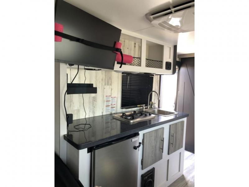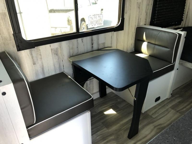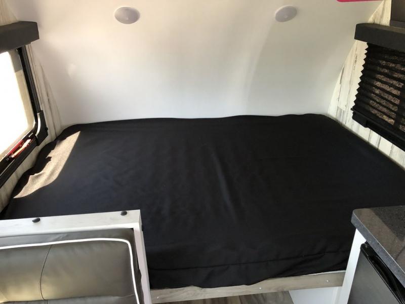 The perfect couples travel trailer for those wanting to upgrade from tent camping and with the optional off-road package you can venture a little off the beaten path if you like with 15" tires and a raised suspension. This unit features a roomy and convenient rear bath. Just inside the entry door, you will find a sliding space saving barn door into a bathroom featuring a 24" x 25" shower with shelf, toilet, and storage cubby for towels and toiletries. The kitchen equipment will allow you to cook inside when you don't want to make dinner over a campfire. Here you will find a sink, a two-burner cook-top and a 3.3 cu. ft. 12V refrigerator beneath the counter space and overhead storage for your paper products and non-perishables. A cozy booth dinette allows you dining space, a place to sit and enjoy a game of cards, or your morning cup of coffee. A second sliding barn door in front leads you to the 54" x 75" bed up front that you will appreciate for a great night's rest.