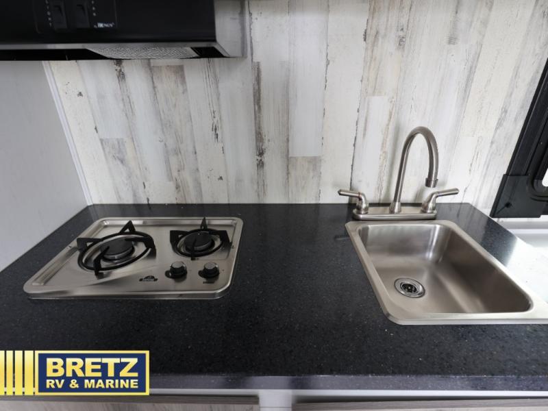 Weekends at the campground are made easy with this travel trailer that can sleep four each night. Once you've unpacked your things, you can stretch your legs around the camp, then head inside to make lunch. You'll find a two burner stainless steel cooktop in the kitchen, along with a 12V refrigerator and a pantry for food storage. There is also a closet with a pull out trash can below that will be perfect to keep cleaning supplies or paper goods in. When it's time to turn in for the night, there are 28" x 72" bunk beds that share the rear of this unit with the private bath, plus a front booth dinette that can convert to a queen-size sleeping space. This travel trailer also includes plenty of storage space, including storage shelves in the bath and above the dinette!