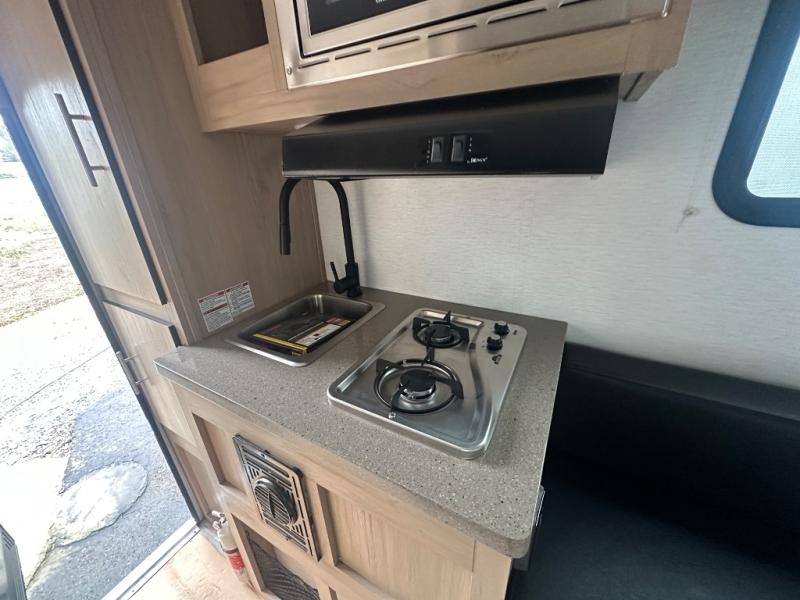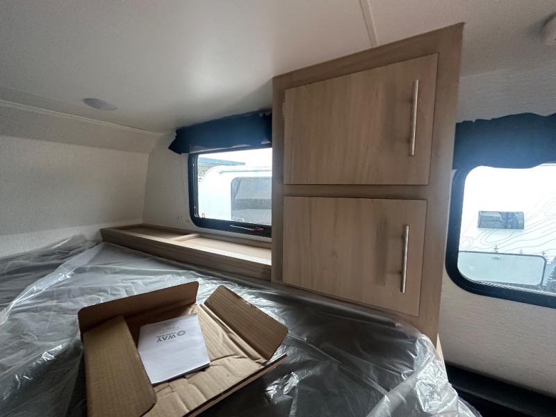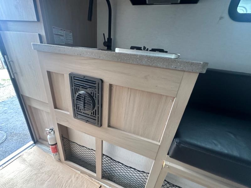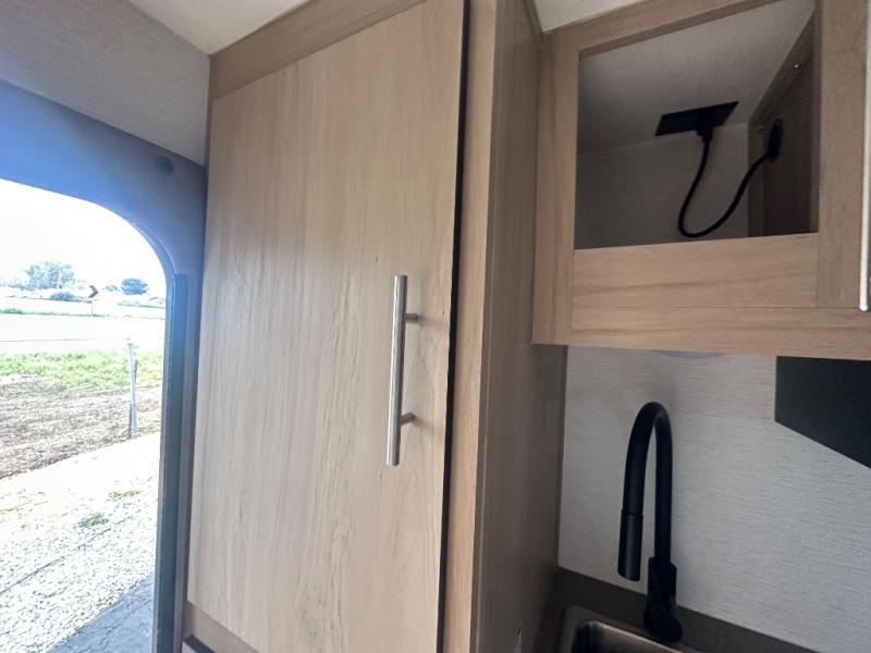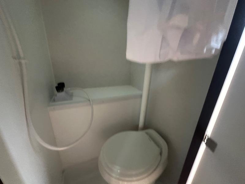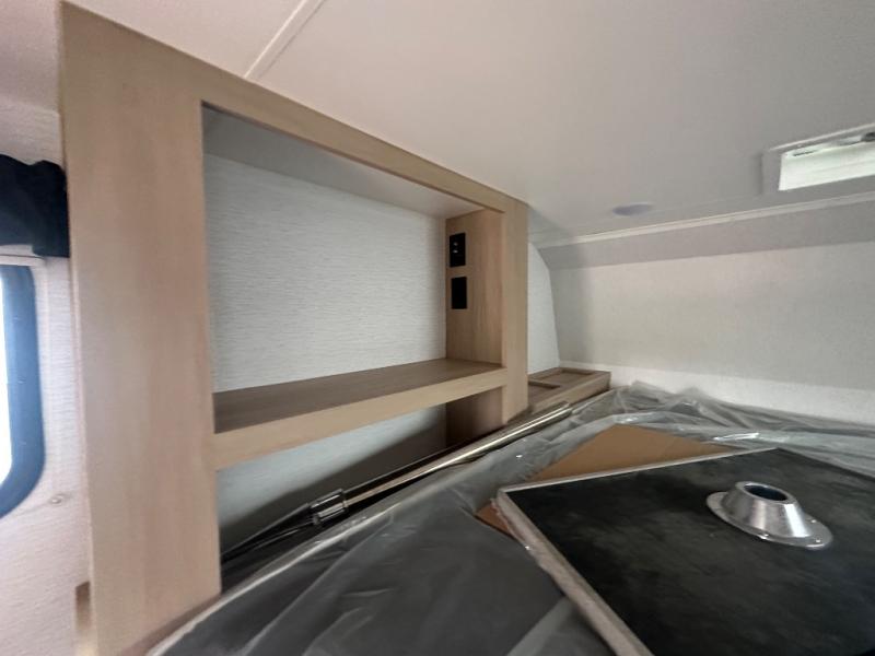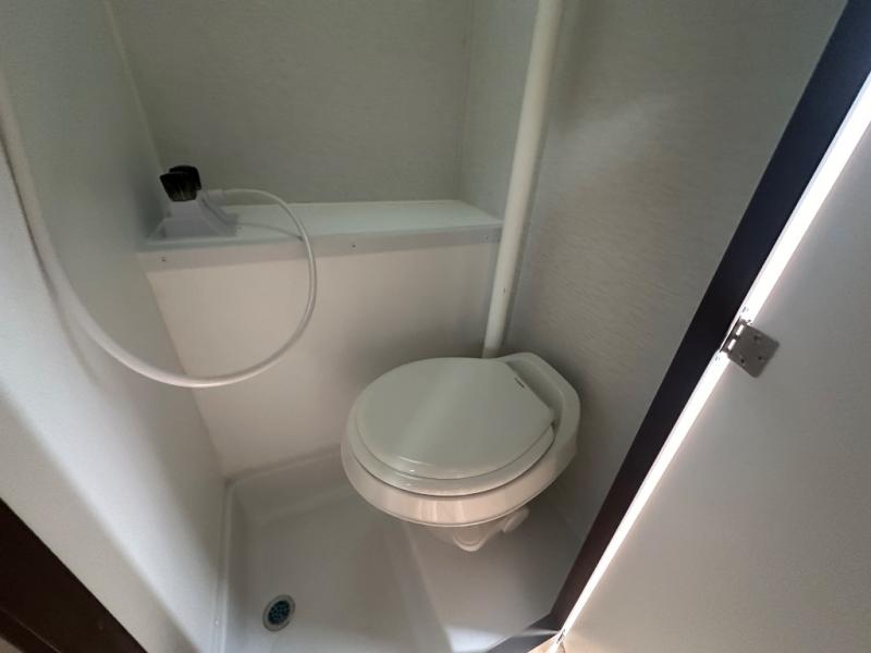 The Up Country 775 has everything you will need to get away! A cozy sleeping space features a roomy bed. Tuck your things away in the storage areas including dual footlockers with integrated USB ports so you can charge your electronics while you snooze. A shelving unit also has room for an optional TV. The kitchen has a dinette which can be converted for additional sleeping space as needed. Enjoy meals cooked on your two-burner stainless steel stove, and clean up in the sink with high rise faucet. A 12V refrigerator keeps your food fresh and cold. As if that's not enough, there's even a bathroom with a 23" x 32" shower!