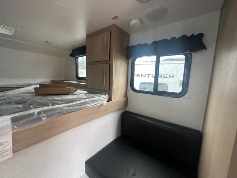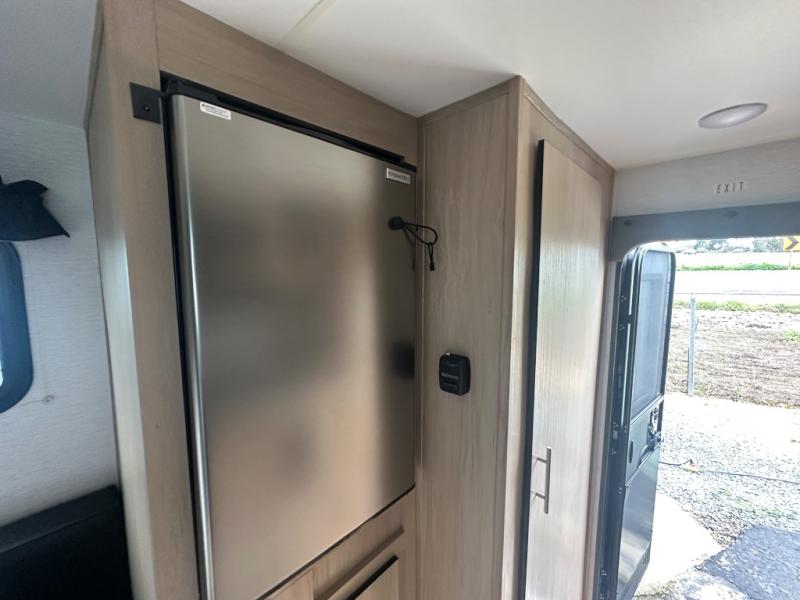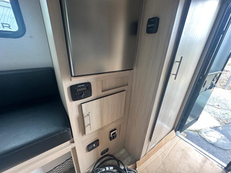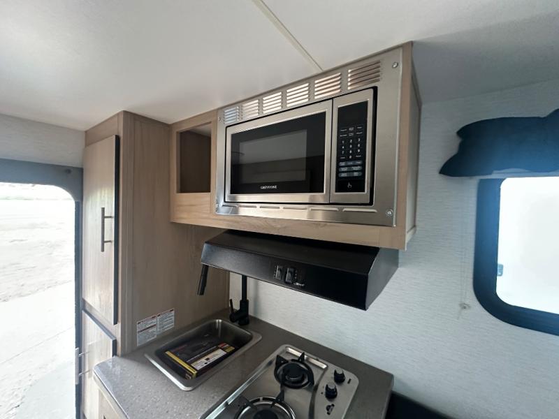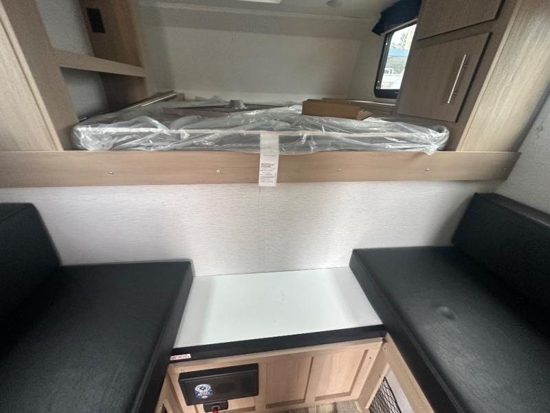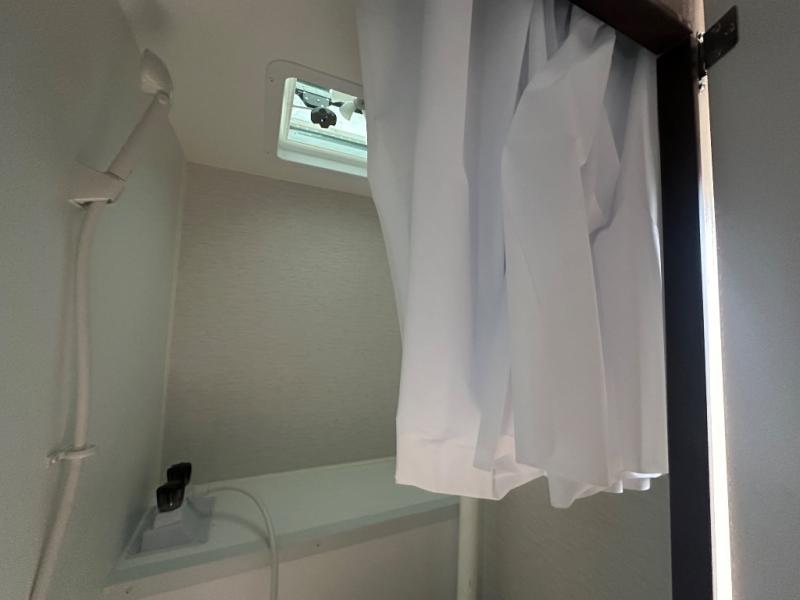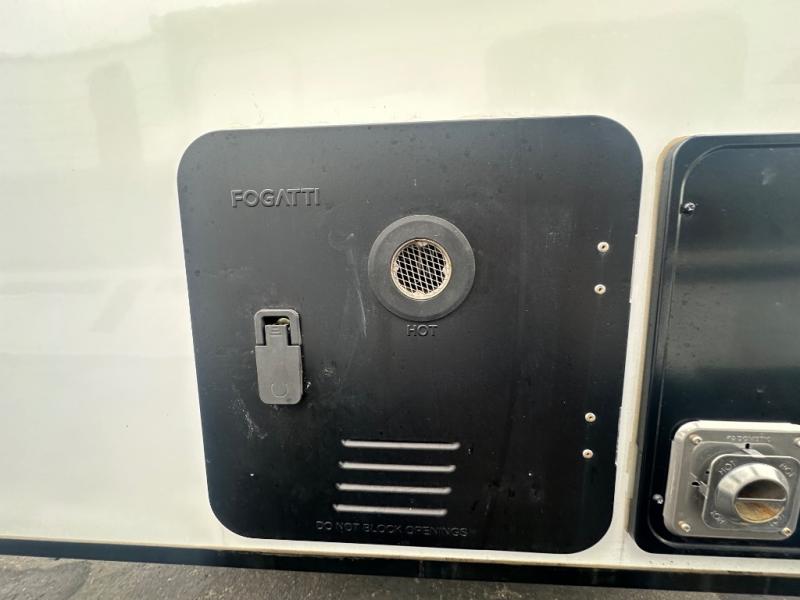 The Up Country 775 has everything you will need to get away! A cozy sleeping space features a roomy bed. Tuck your things away in the storage areas including dual footlockers with integrated USB ports so you can charge your electronics while you snooze. A shelving unit also has room for an optional TV. The kitchen has a dinette which can be converted for additional sleeping space as needed. Enjoy meals cooked on your two-burner stainless steel stove, and clean up in the sink with high rise faucet. A 12V refrigerator keeps your food fresh and cold. As if that's not enough, there's even a bathroom with a 23" x 32" shower!