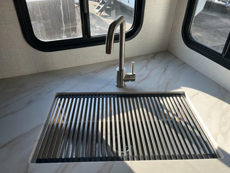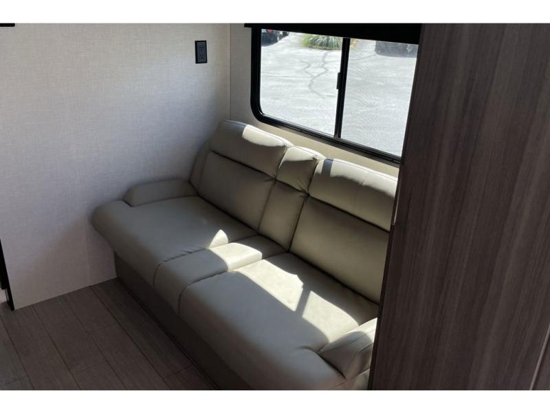 Inside, the popular rear kitchen layout provides excellent counter space and storage, making meal prep at the campsite simple and efficient. The kitchen is equipped with a refrigerator, cooktop, and cabinetry for all your cooking essentials, while the living area offers a comfortable booth dinette and sofa space for relaxing, dining, or converting into extra sleeping space when guests join your trip.