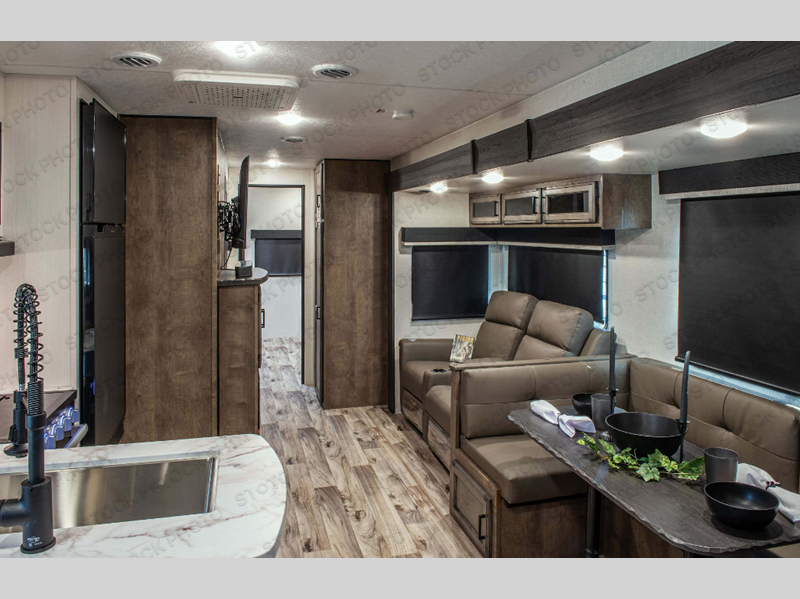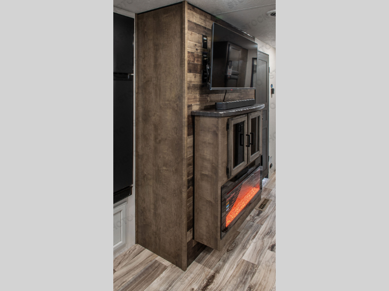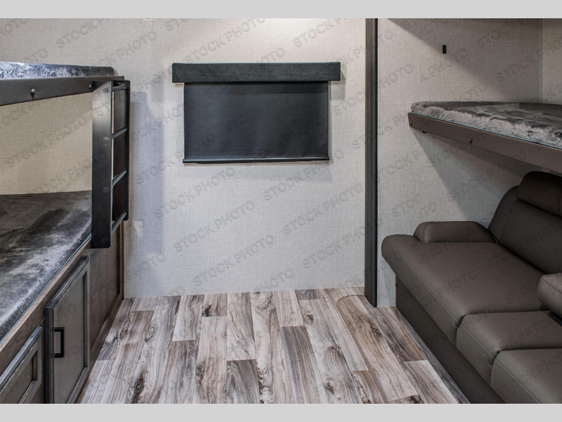 Pack your bags and load up for a great weekend getaway with the whole family in this travel trailer! The rear private bunkhouse is big enough for all of the kids or guests to stay with a set of bunk beds, a 28" x 73" top bunk above a 70" sofa with table slide, and a wardrobe to keep their clothes out of the way. The full bathroom not only has a 30" x 36" shower to freshen up in, but also a dresser, coat hooks, an entrance/exit door, plus washer and dryer prep. The chef can prepare meals either indoor with the three burner cooktop, or at the outside campfire café which even has an exterior 40" TV for you to watch the morning news while cooking pancakes on the griddle!